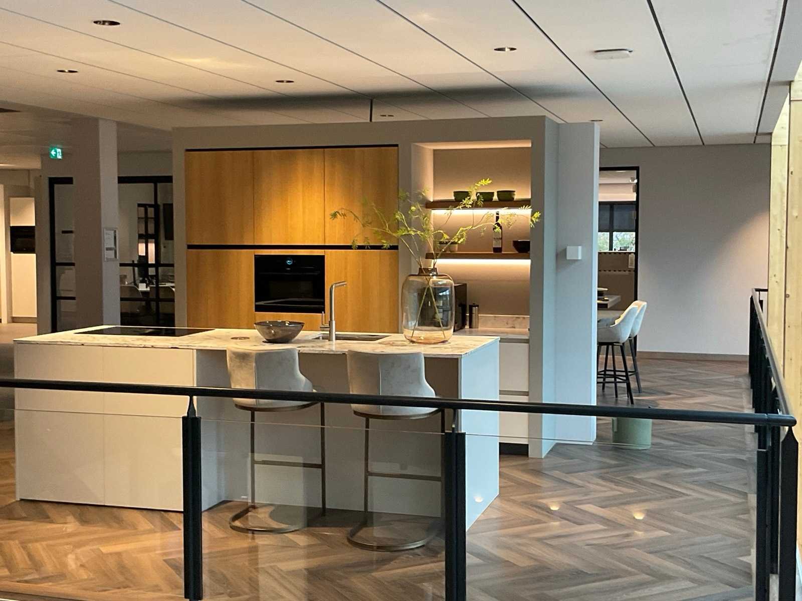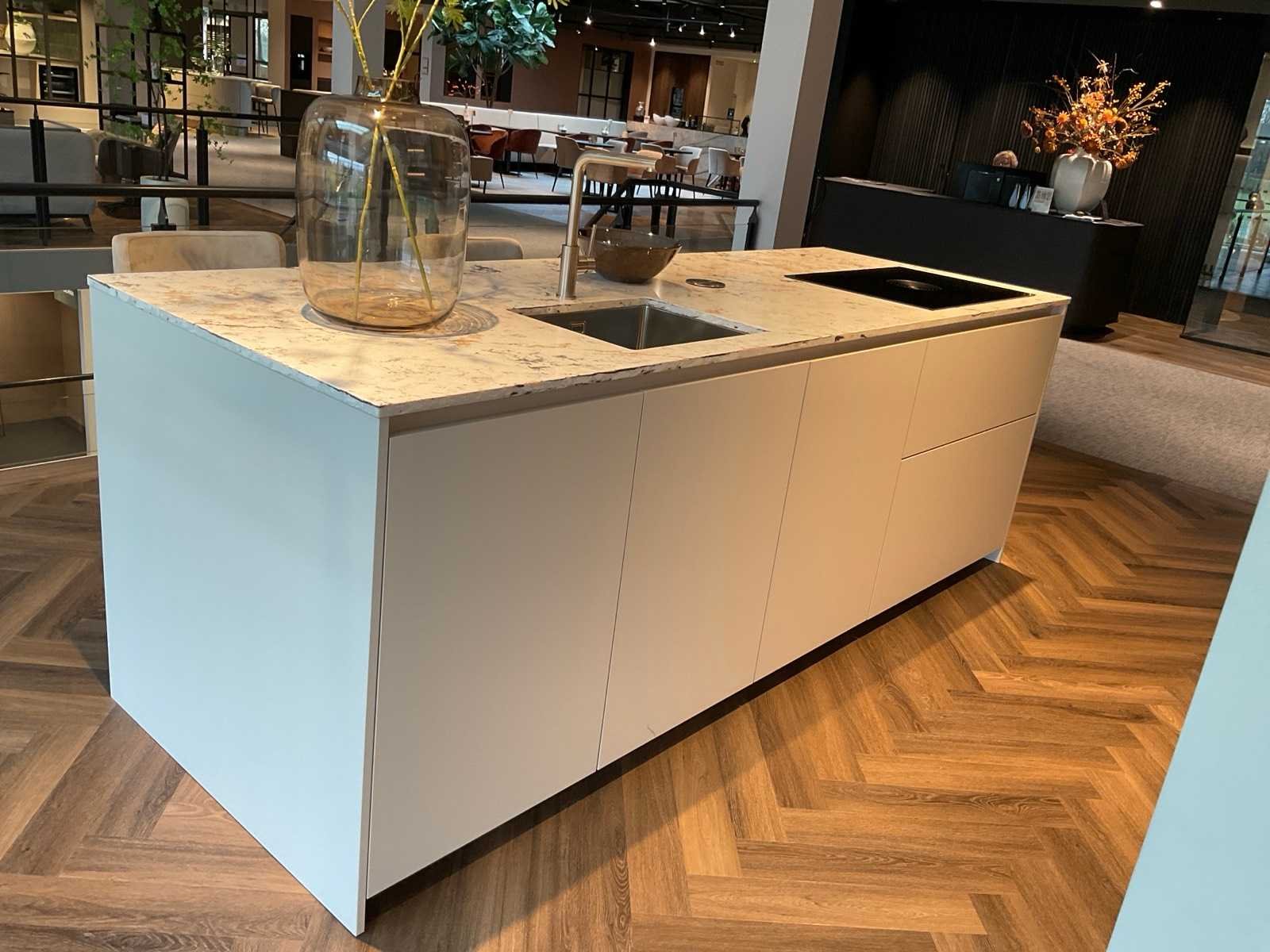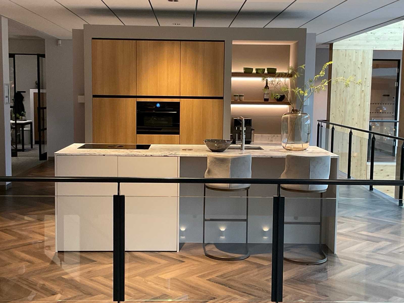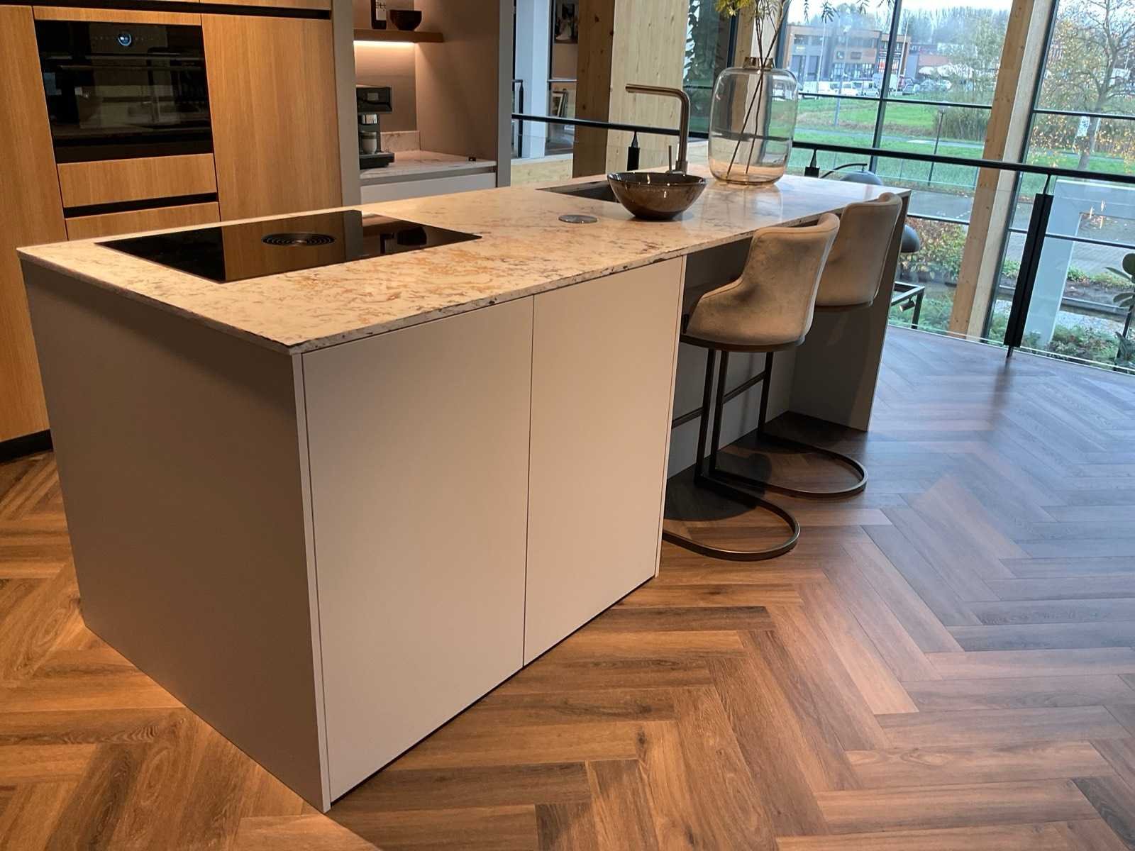 Kook-spoeleiland met zitdeel; indeling: 4 onderkasten waarvan 1 ladenkast; Bora inbouw inductiekookplaat met kookveldafzuiging; type Puru; 76 cm breed; Bosch inbouw vaatwasser met besteklade; type SBH4HB800E; 13 couverts; Twist dubbele inbouw contactdoos; kastenwand afm. 180 cm breed en 235 cm hoog; indeling : 3 hoge kasten; 1 lade; Bosch inbouwoven met magnetron; type CMG9241B1; inhoud 45 liter; Bosch inbouwkoelkast; type KIR51ADE0; inhoud 247 liter; Coffeecorner 90 cm breed; indeling: 1 ladekast met binnenlade en bestekinzet; 2 wandplanken 90x20x5 cm met ledverlichting en dimschakelaar; Scan de QR code voor meer informatie; LET OP: door koper zelf ter plaatse nog te demonteren; zonder de getoonde accessoires; zonder de ombouw Nee Merk: MK Model: Natural Beach Kraan: eengreeps rvs Gootsteen: Reginox Houston onderbouw Werkblad hoogte: 100cm Aanrechtblad: Kemie composiet 20 mm Bianco Vintage glans Lengte kookeiland: 285cm Breedte kookeiland: 100cm Hoogte kookeiland: 100cm Hoofdkleur: Loft Nature Oak en Beach Grey HPL