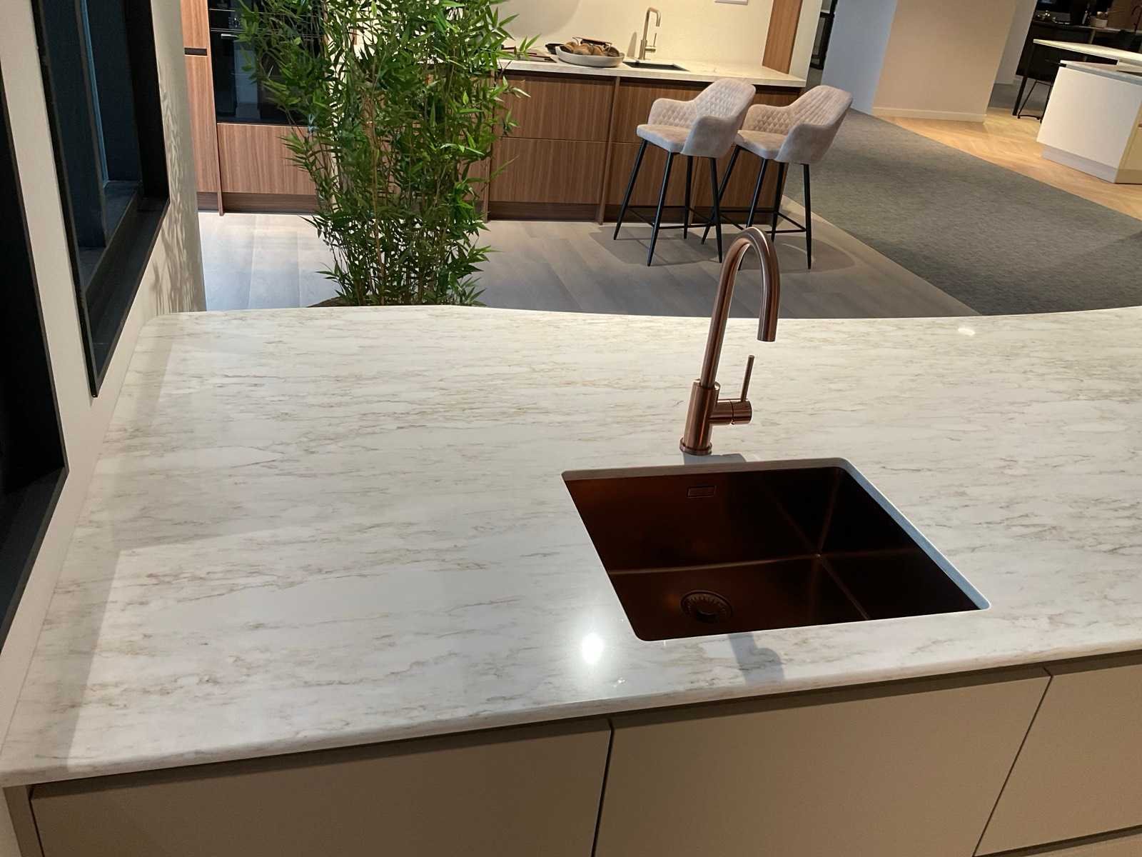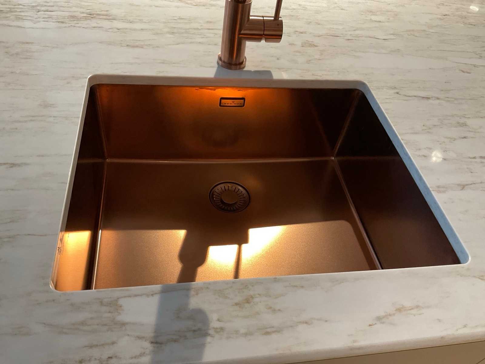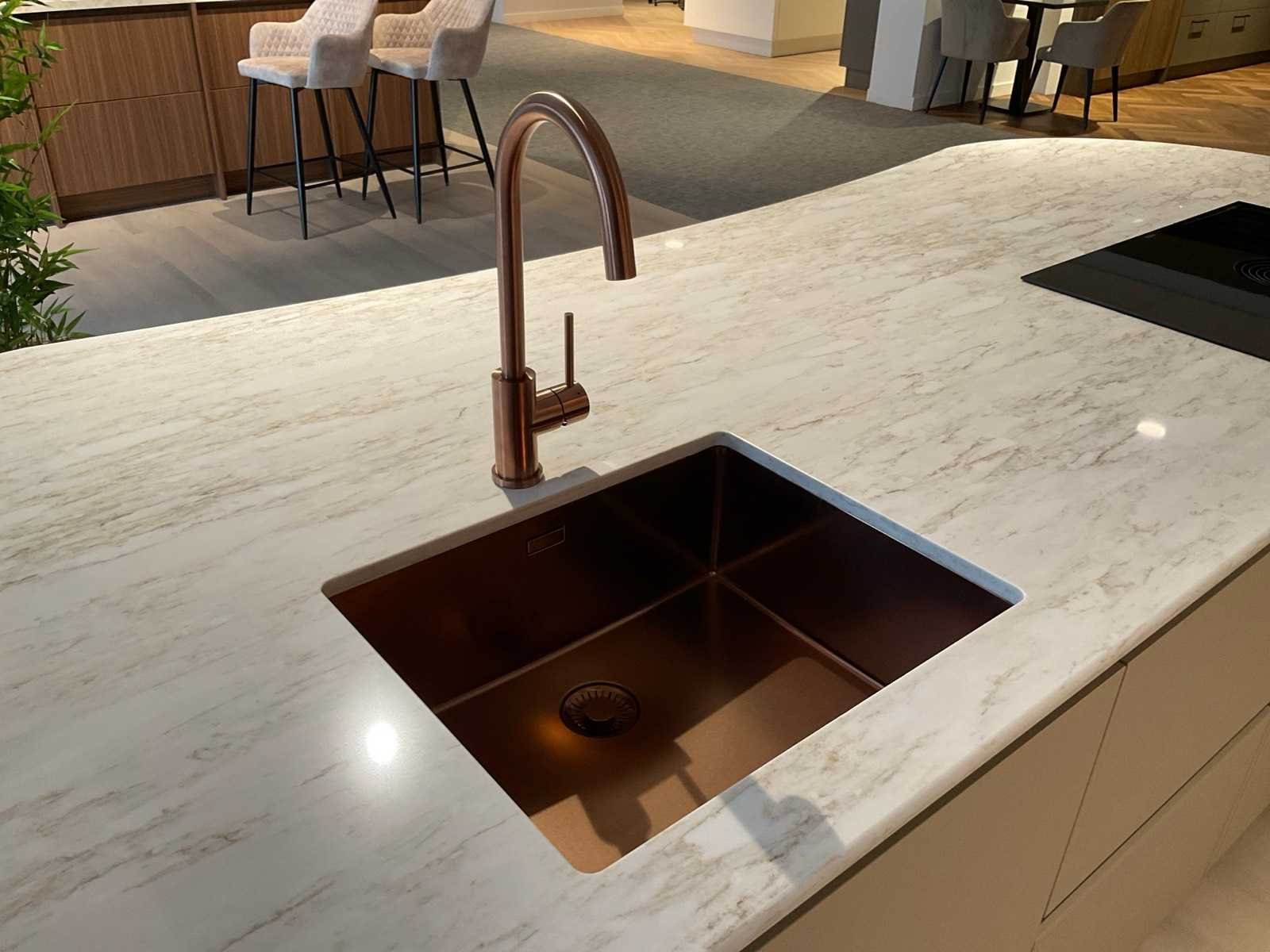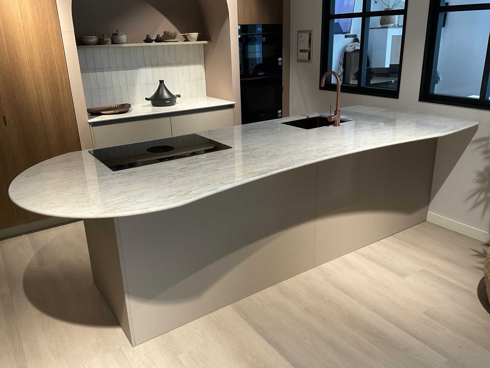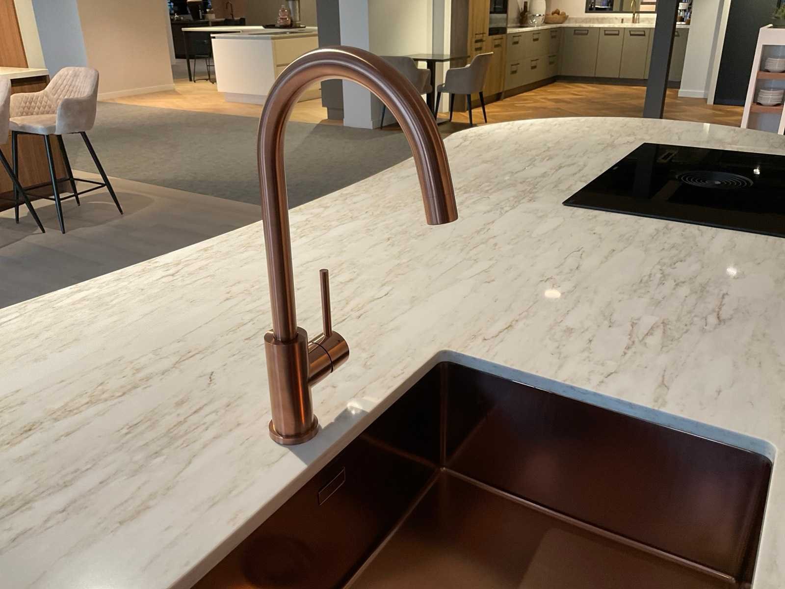 Showroommodel; eilandwerkblad met Bora 4-zone inbouw inductie kookplaat met geïntegreerde afzuiging; Reginox vlakinbouw spoelbak coppertone en eengreeps keukenmengkraan coppertone; LET OP: door koper zelf ter plaatse nog te demonteren; zonder de getoonde accessoires Nee Merk: Kemie composiet Allure Lengte: 315cm Breedte: 120cm Hoogte: 2cm