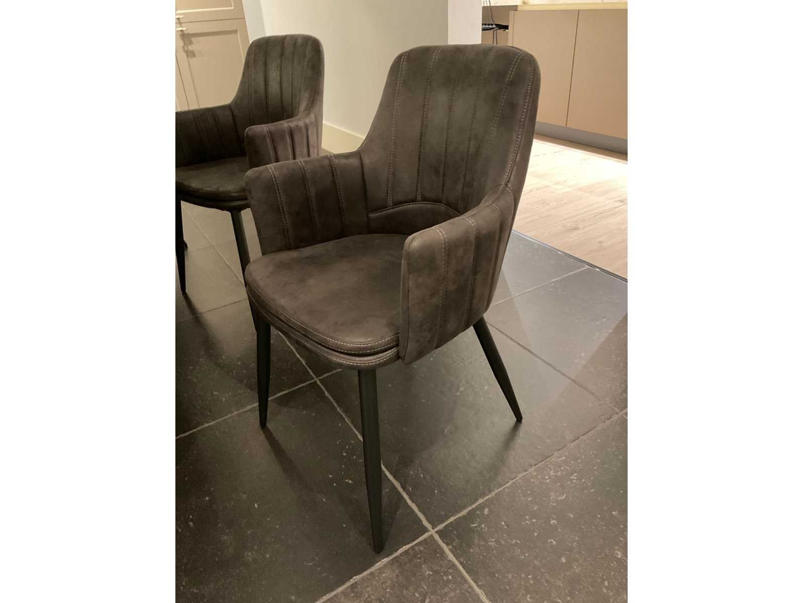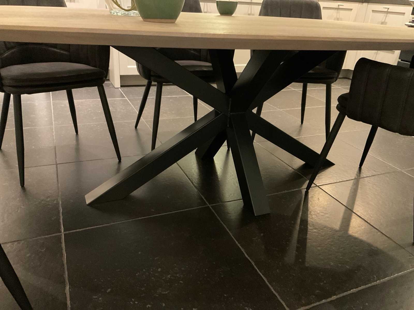 Eikenhouten blad met zwartstalen onderstel; 6 eetkamerstoelen bekleed met Softyl; LET OP: door koper zelf ter plaatse nog te demonteren; zonder de getoonde accessoires Nee