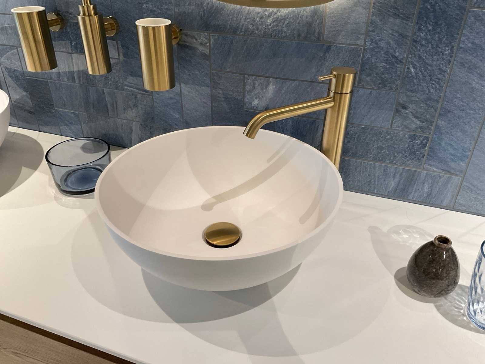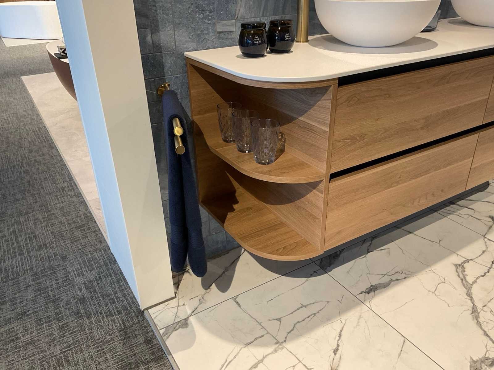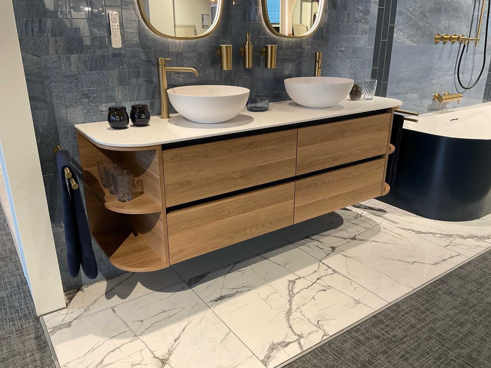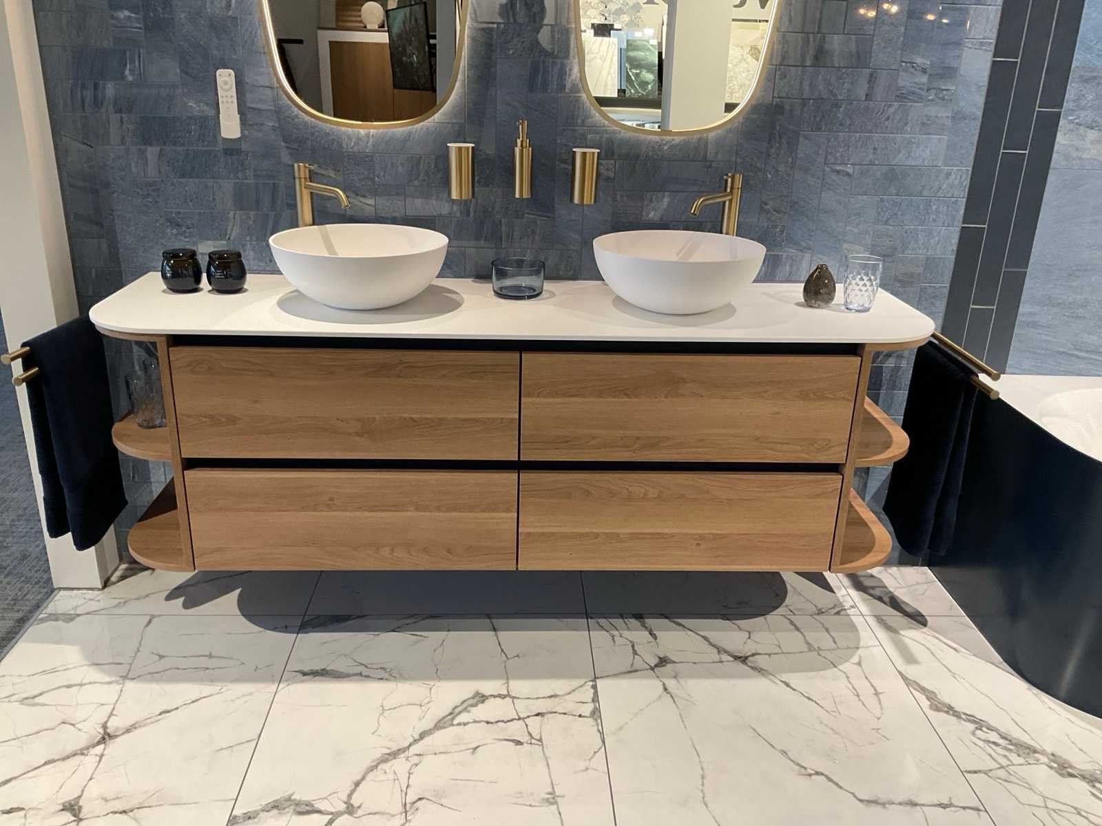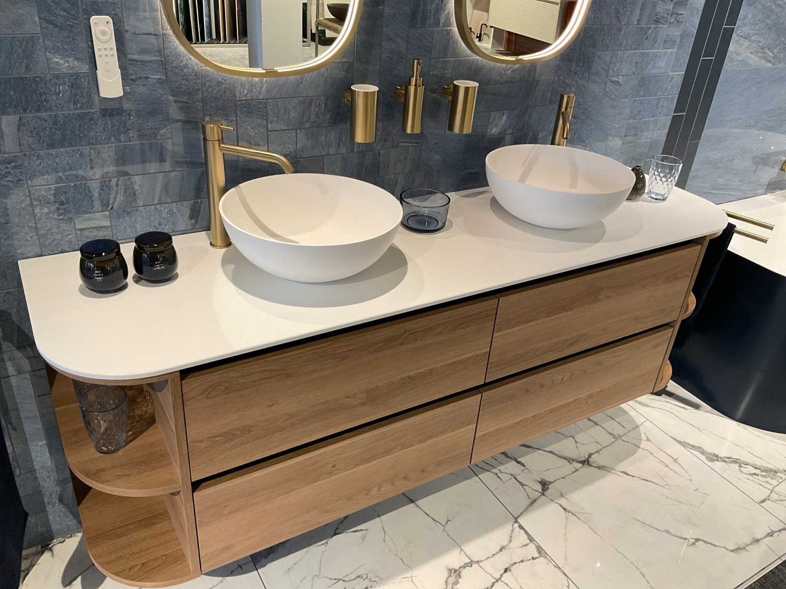 Onderkast met afgeronde hoeken en 4 open schappen; 4 laden; blad Solid Surface; 2 Villeroy&Boch waskommen diameter 39 cm; 2 Hotbath wastafelmengkranen kleur geborsteld messing; zeeppompje; 2 bekerhouders en handdoekhouders; LET OP: door koper zelf ter plaatse nog te demonteren; zonder de getoonde accessoires Nee Merk: Primabad-Villeroy&Boch Lengte: 185cm Breedte: 50cm Kleur: eiken naturel decor Kraan: Hotbath Waskom: Primabad
