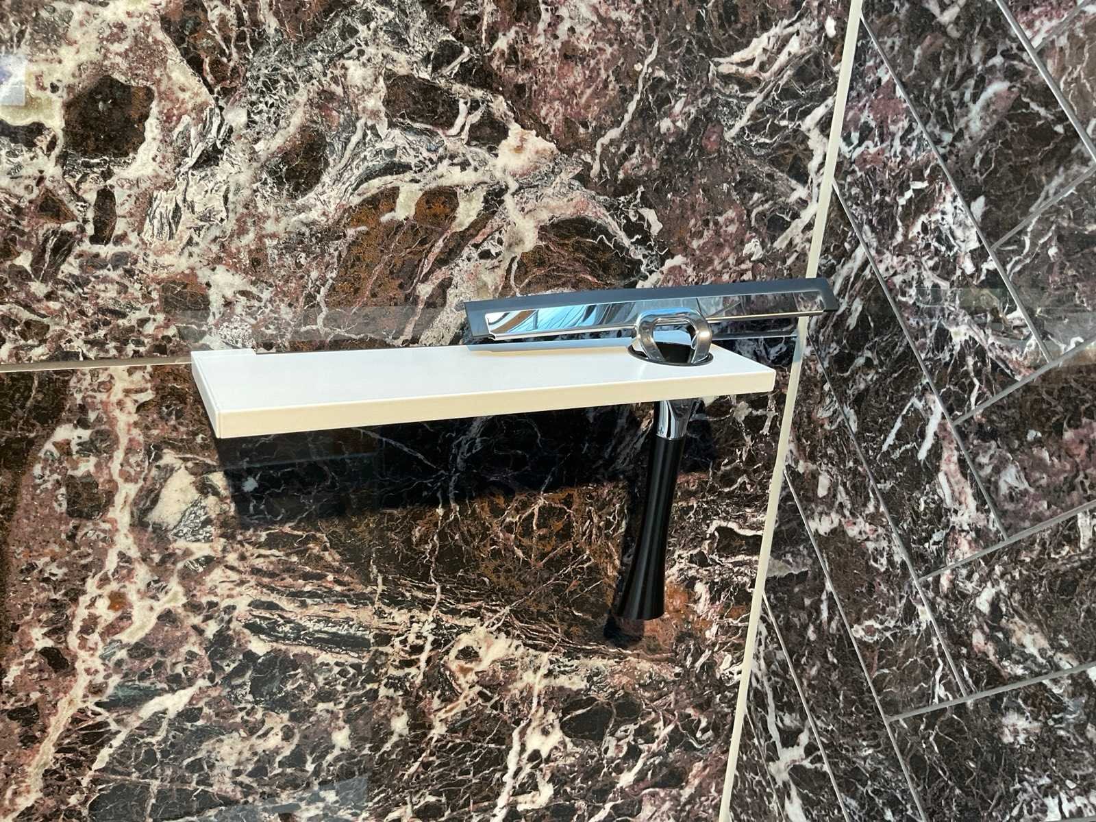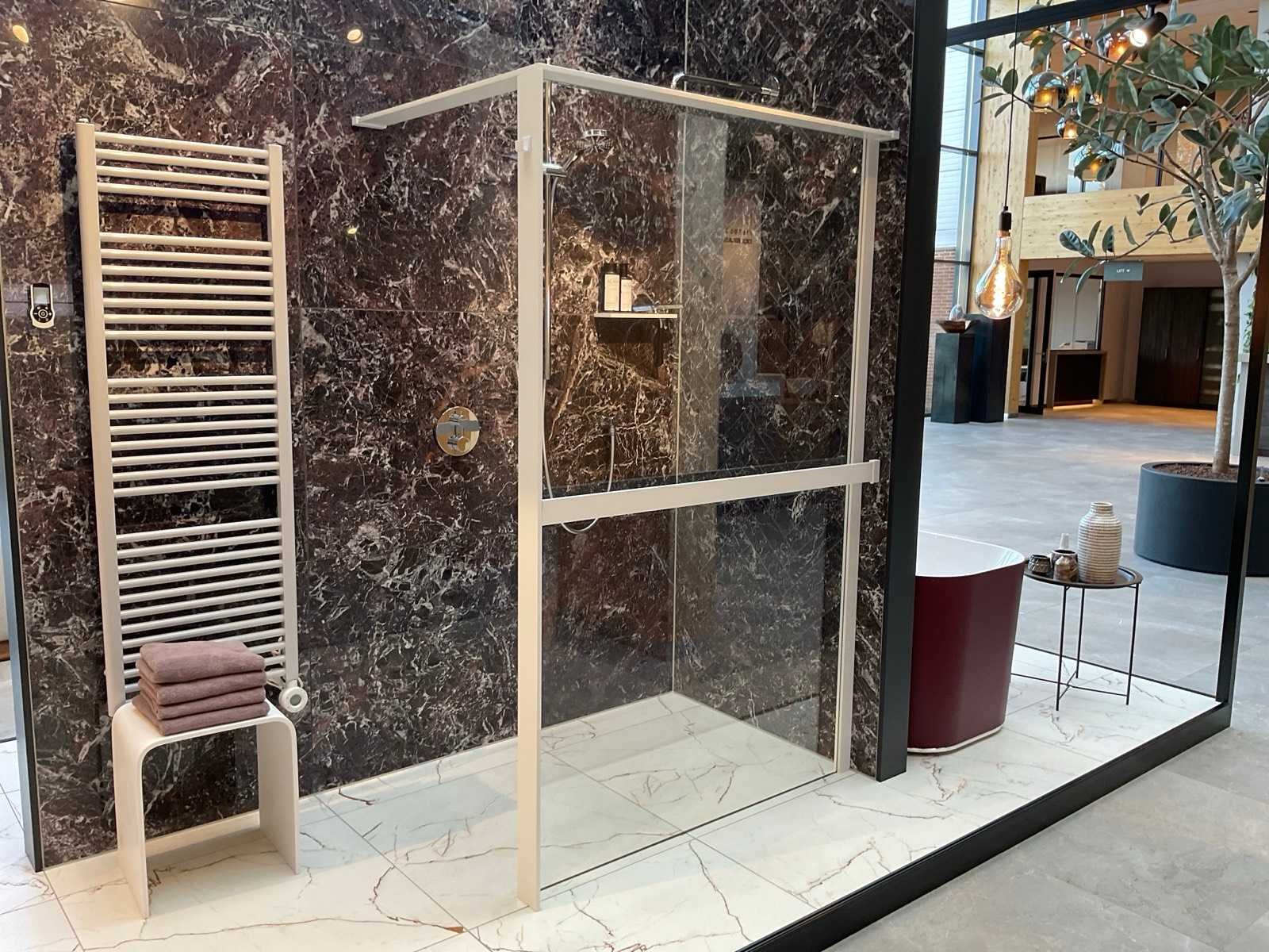 Met planchet afm.30x10 cm en wisser; LET OP: door koper zelf ter plaatse nog te demonteren; zonder de getoonde accessoires Nee Merk: Novellini Kleur: wit Breedte: 128cm