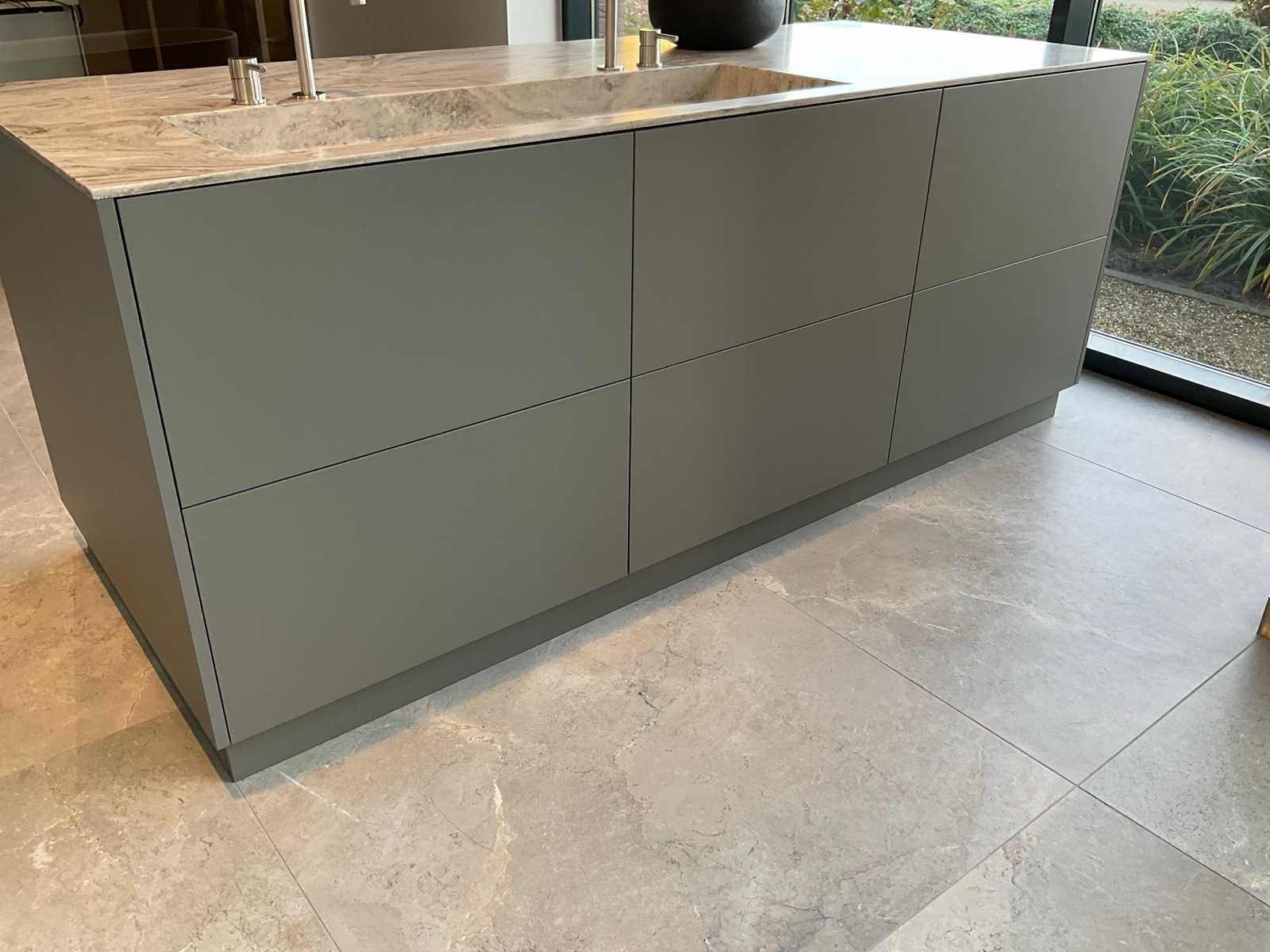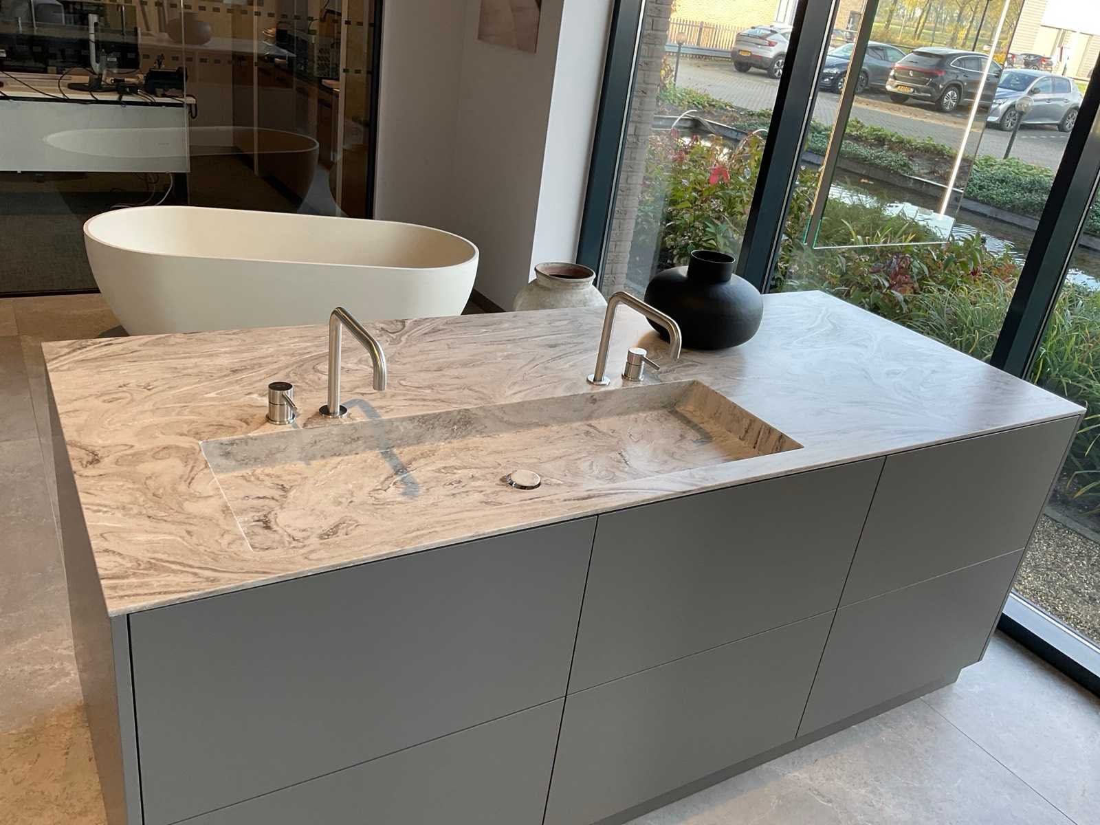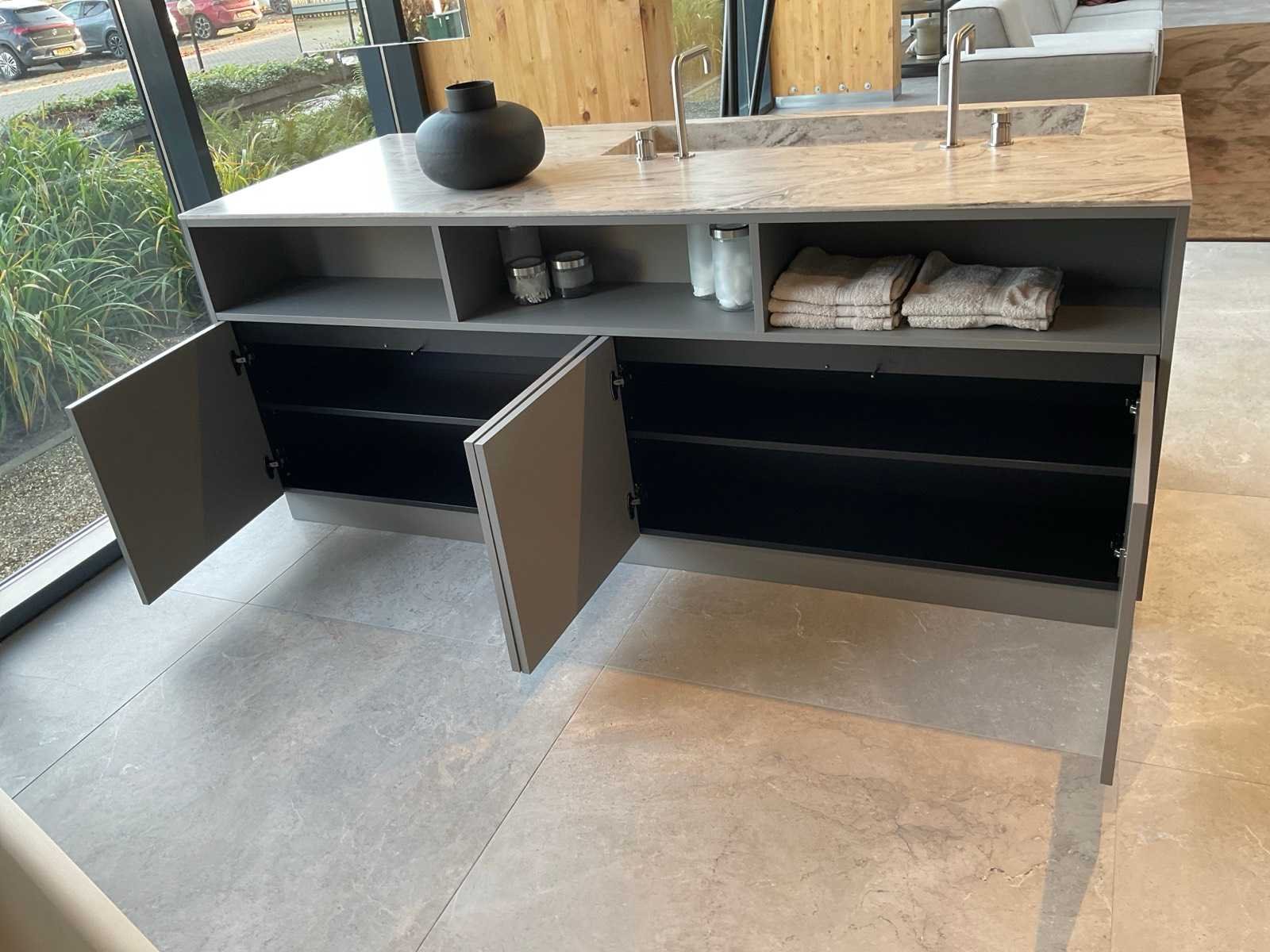 Vrijstaand meubel met 6 laden en 1 binnenlade en stopcontact; 2 onderkasten en 3 open regaalvakken; push-to-open; Corian werkblad kleur Smoke DCrift; 2 Jee-O wastafelmengkranen rvs; Mene vrijhangende spiegel met verlichting; afm. 50x100 mm; LET OP: door koper zelf ter plaatse nog te demonteren; zonder de getoonde accessoires Nee Merk: Elis Hoogte: 90cm Lengte: 222cm Breedte: 91cm Kleur: warm grey soft mat