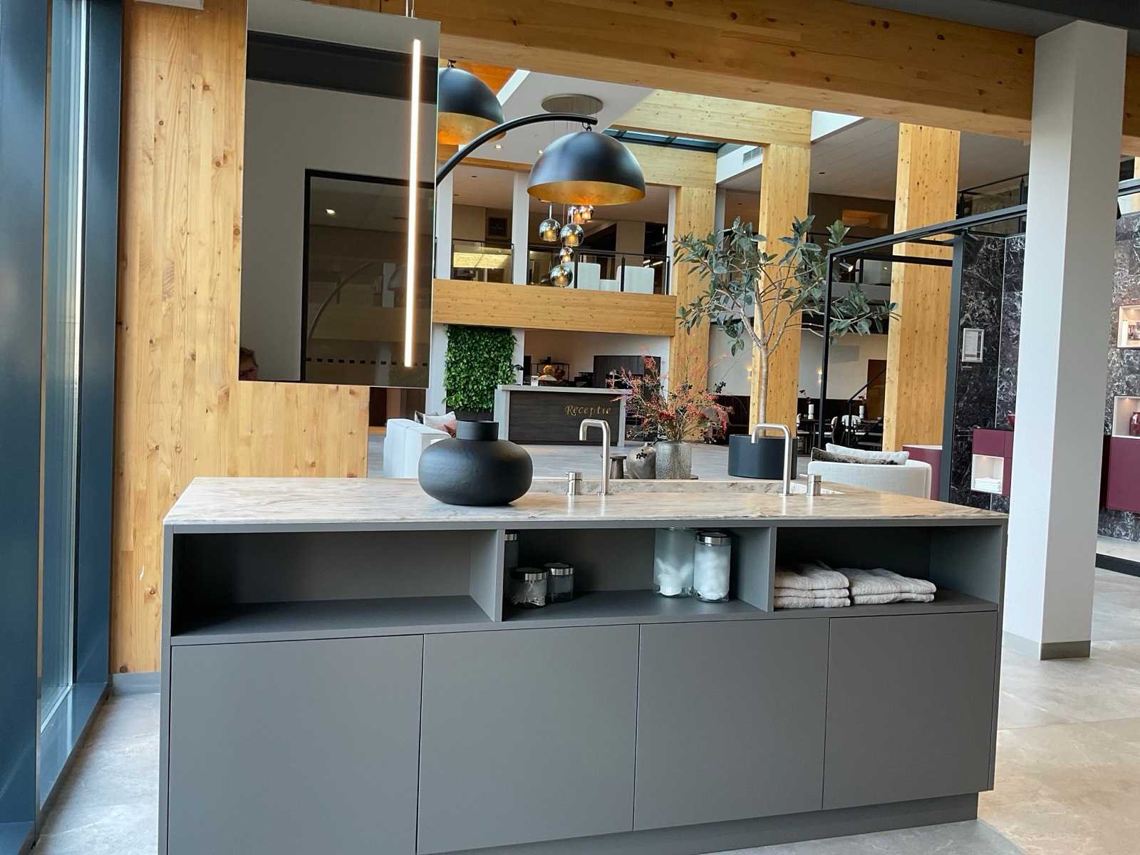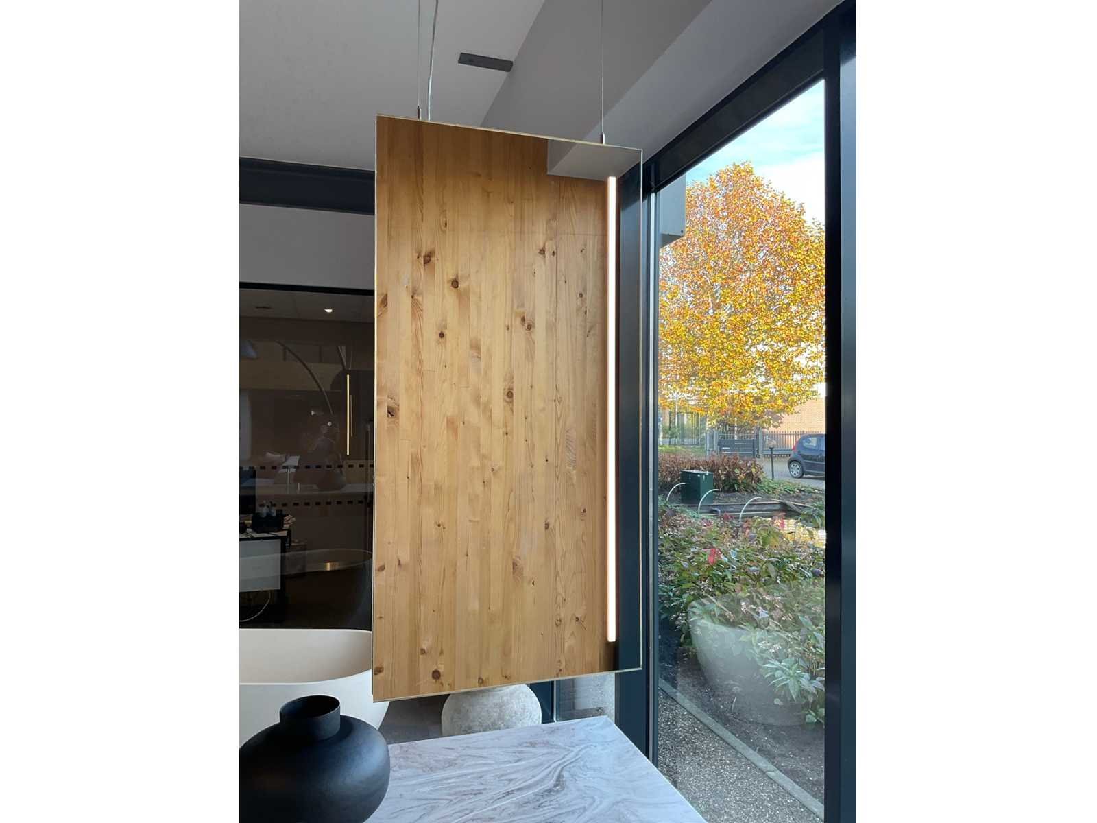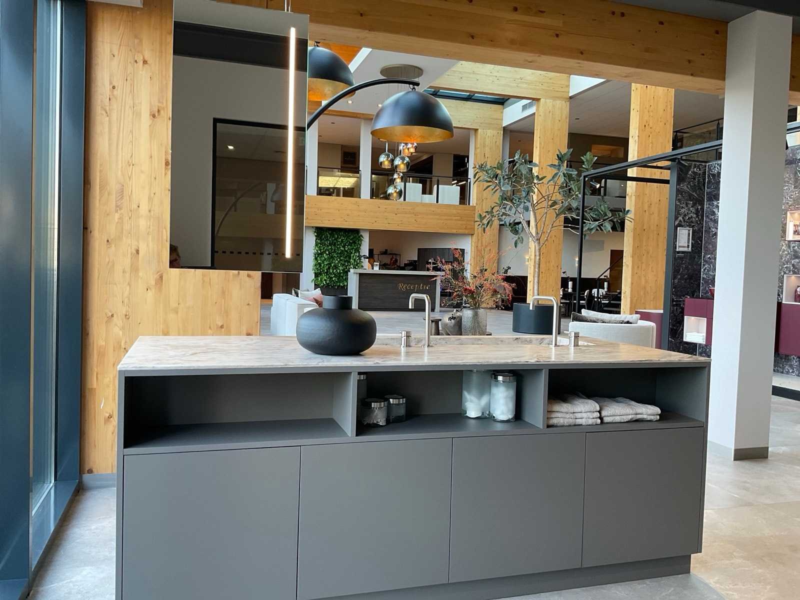 Vrijstaand meubel met 6 laden en 1 binnenlade en stopcontact; 2 onderkasten en 3 open regaalvakken; push-to-open; Corian werkblad kleur Smoke DCrift; 2 Jee-O wastafelmengkranen rvs; Mene vrijhangende spiegel met verlichting; afm. 50x100 mm; LET OP: door koper zelf ter plaatse nog te demonteren; zonder de getoonde accessoires Nee Merk: Elis Hoogte: 90cm Lengte: 222cm Breedte: 91cm Kleur: warm grey soft mat