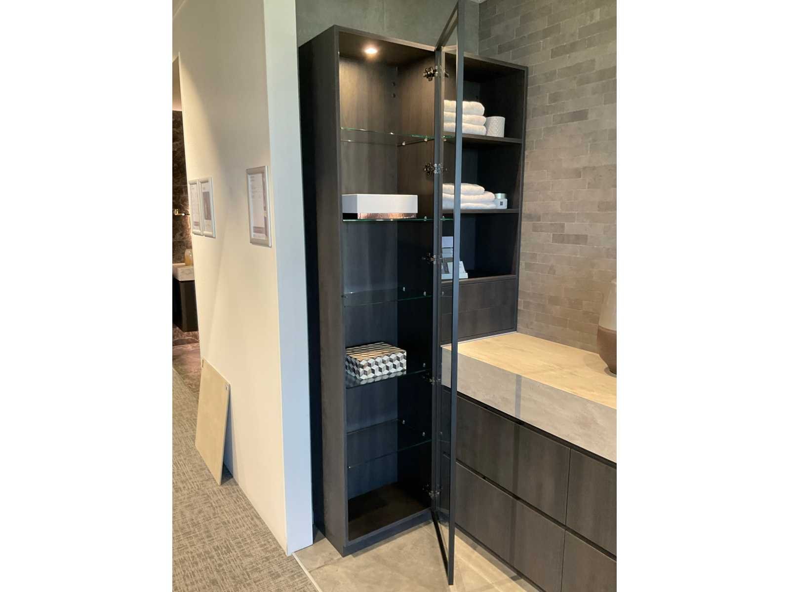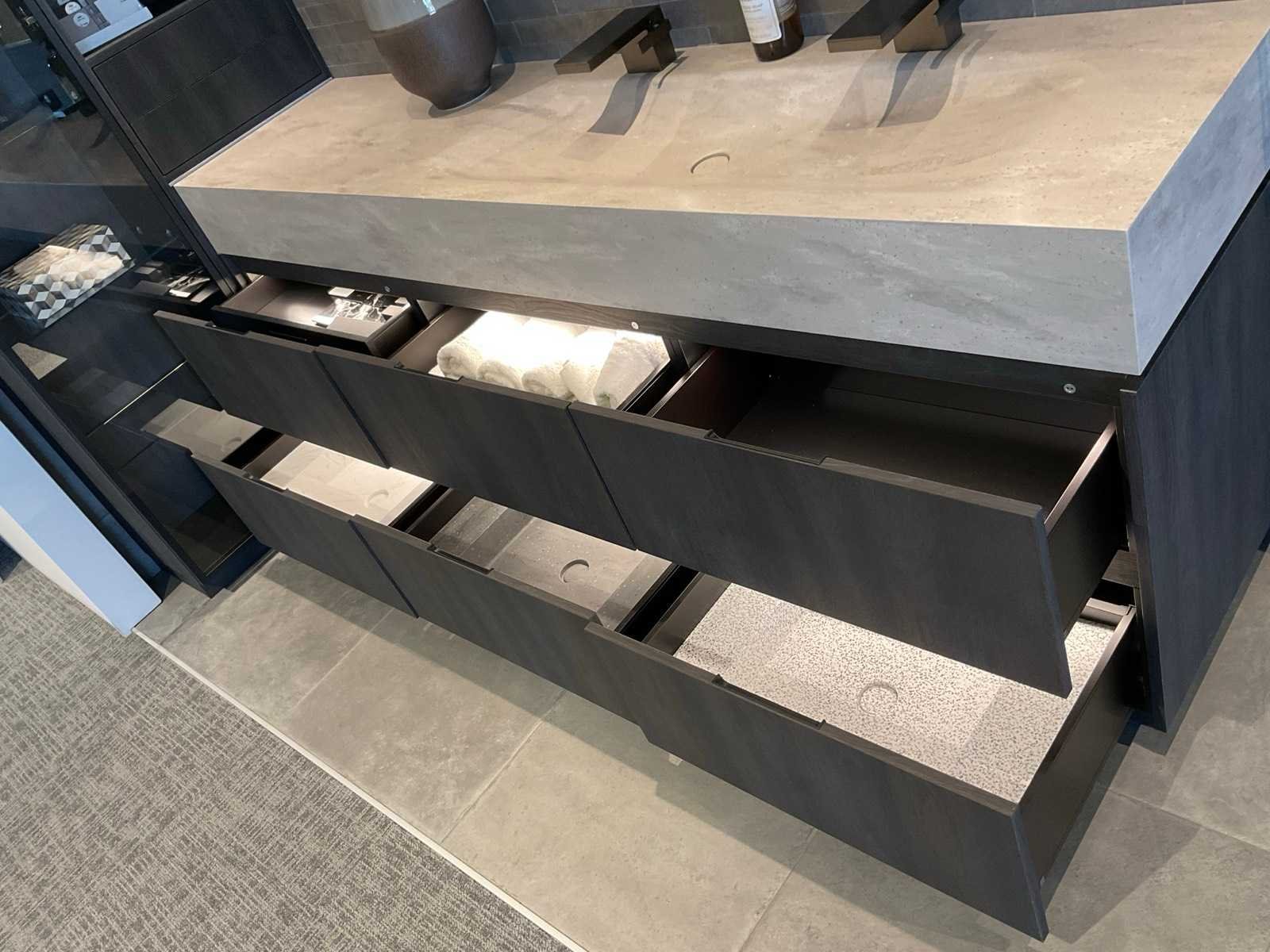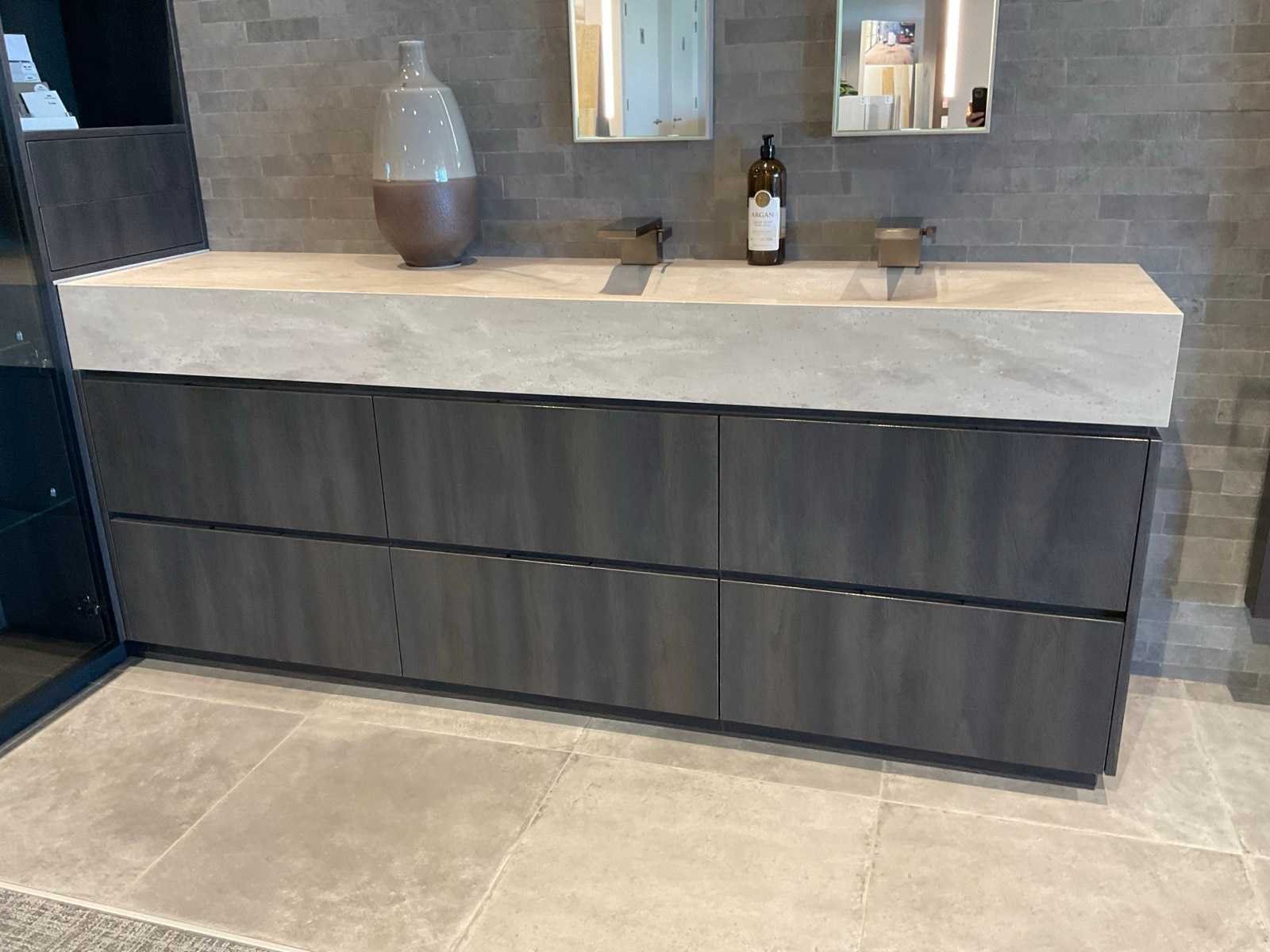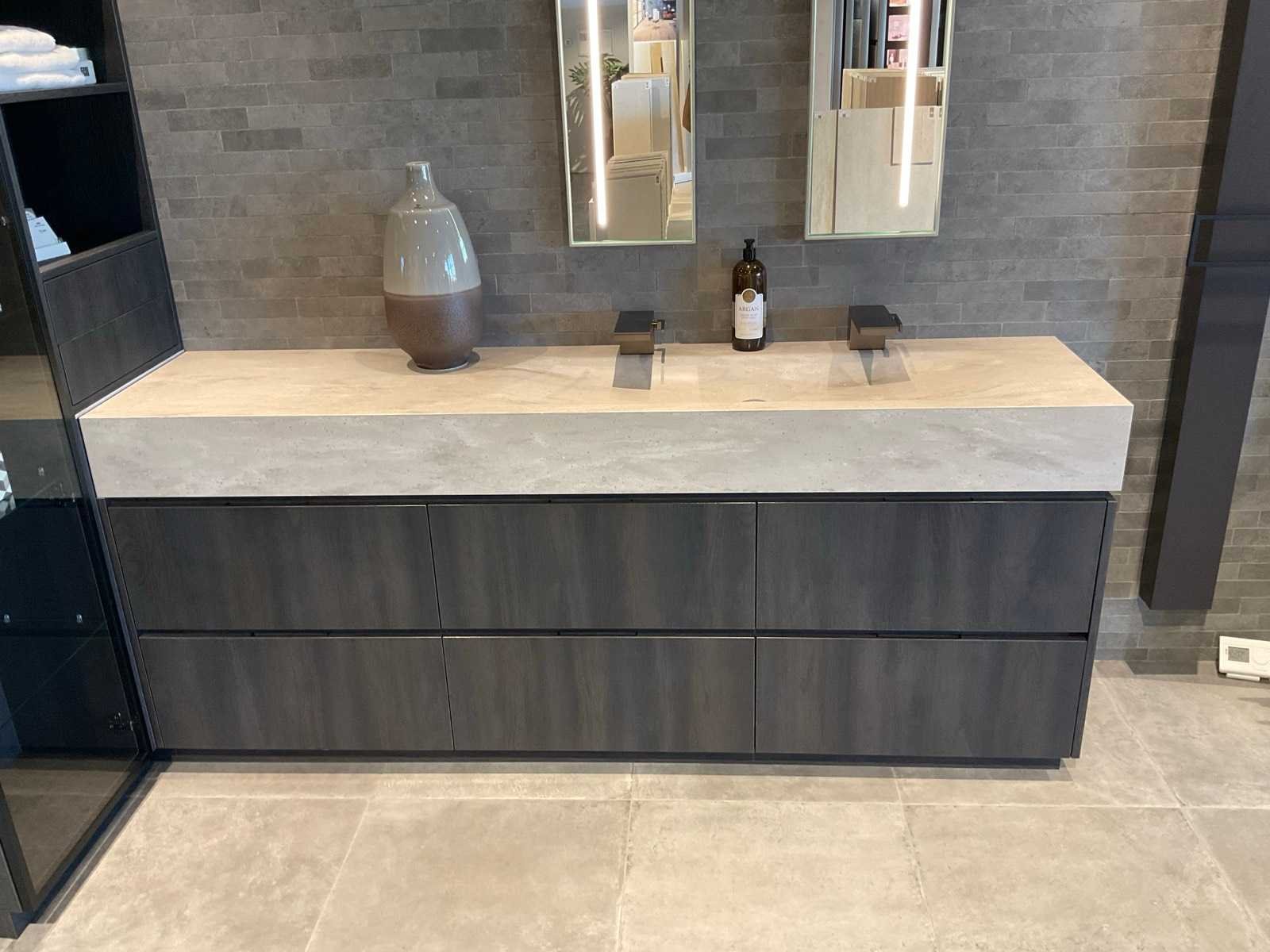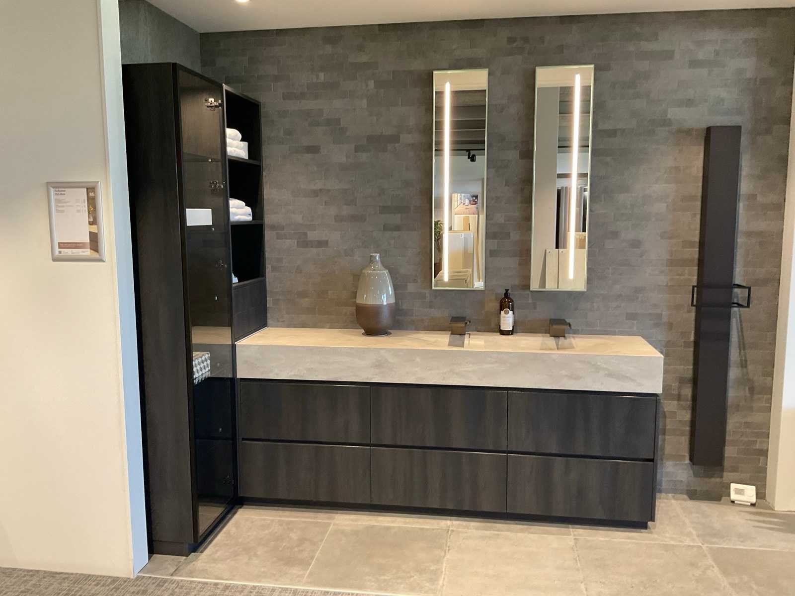 Badmeubel met 6 laden en 1 binnenlade; met ladeverlichting; werkblad Corian; 2 stuks Axor wastafelmengkranen; Gun Metal; 2 wandkasten waarvan 1 met glasdeur en 5 glazen legplanken en 1 met 2 lades en 2 open vakken; 2 badkamerspiegel; in Corian kader; met verlichting; LET OP: door koper zelf ter plaatse nog te demonteren; zonder de getoonde accessoires Nee Merk: Elise Hoogte: 90cm Lengte: 250cm Breedte: 51cm Kraan: Axor