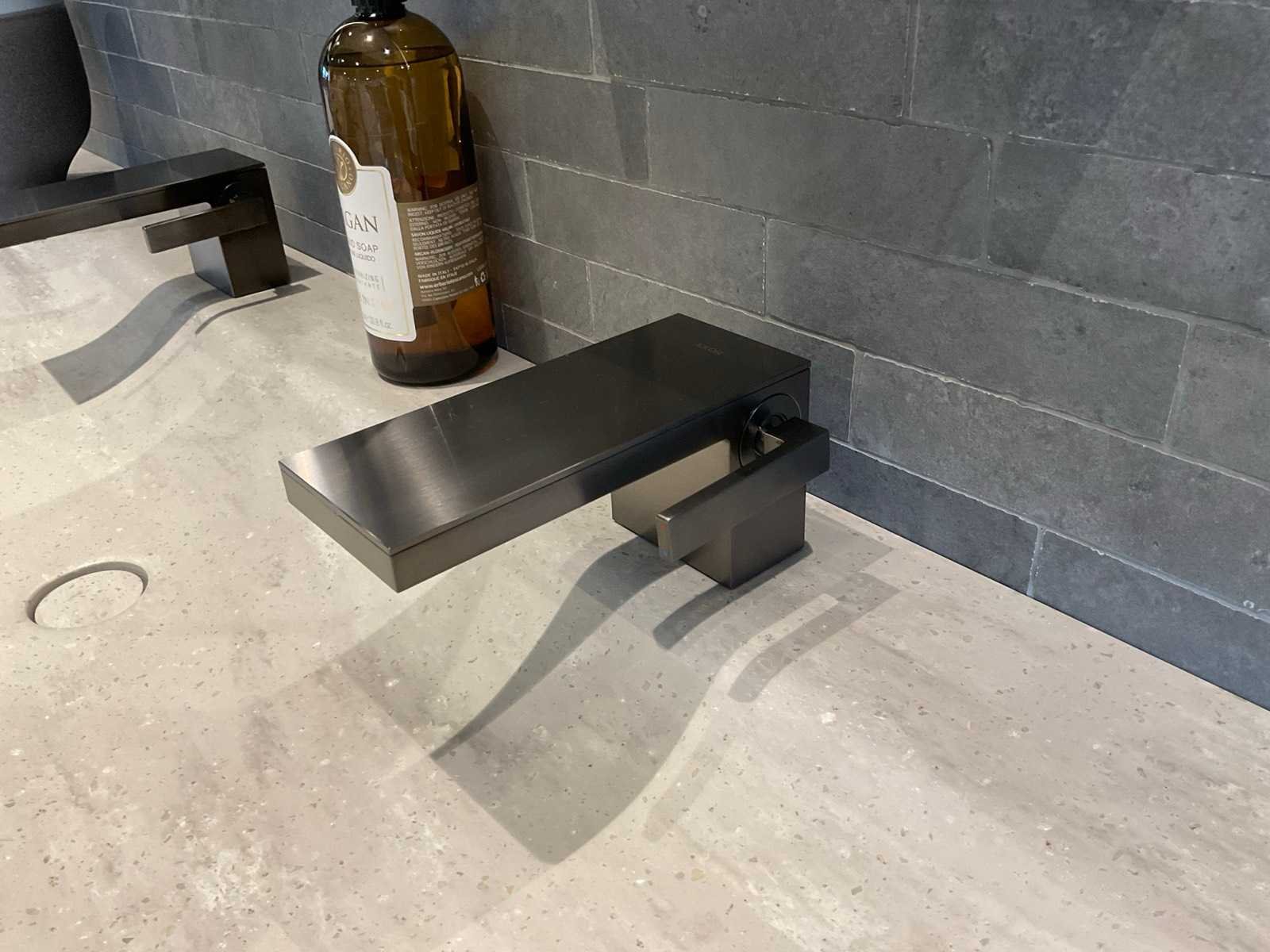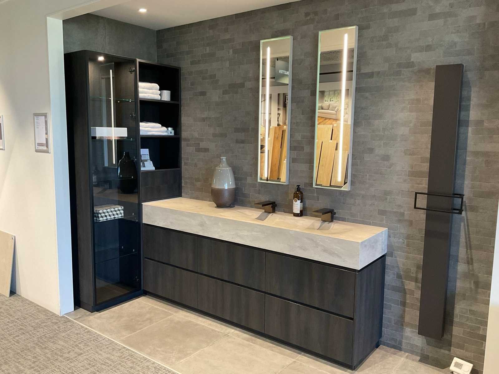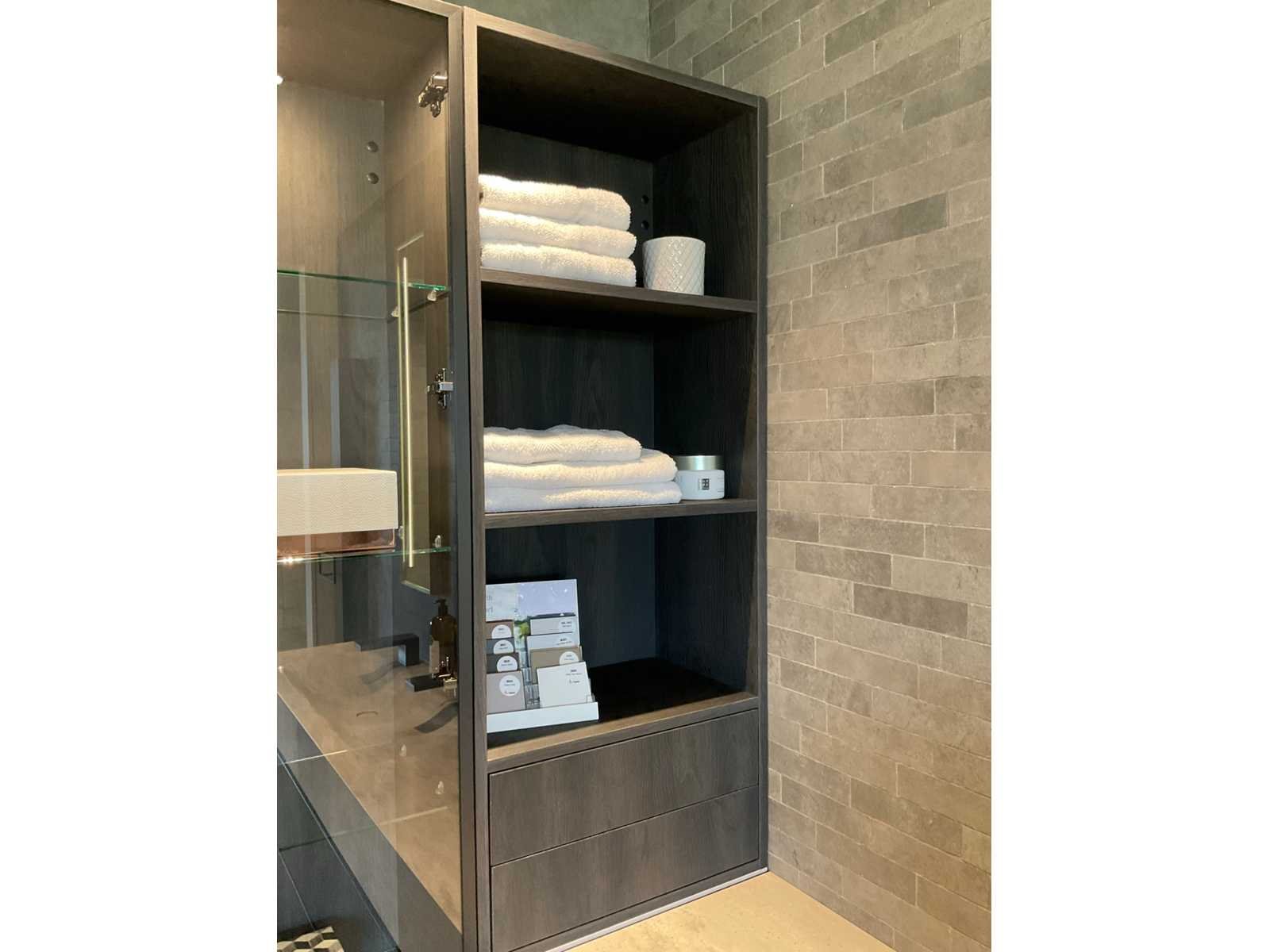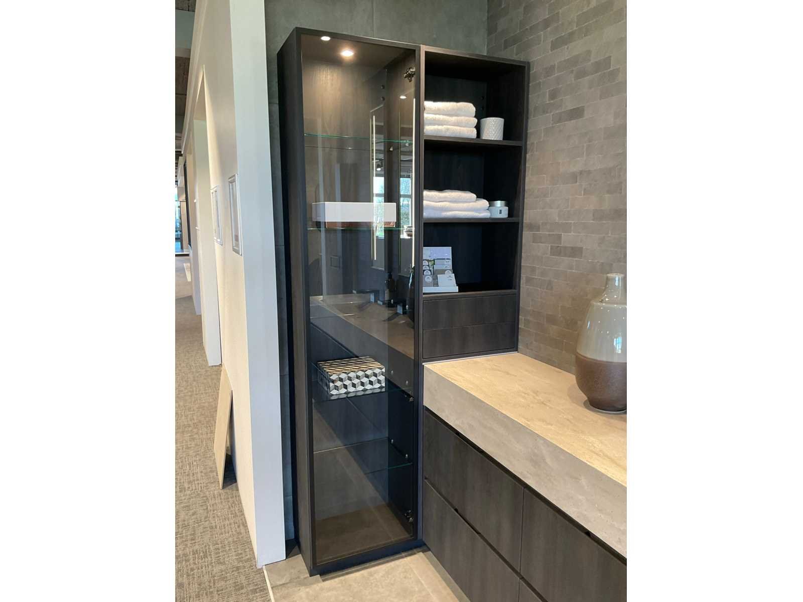 Badmeubel met 6 laden en 1 binnenlade; met ladeverlichting; werkblad Corian; 2 stuks Axor wastafelmengkranen; Gun Metal; 2 wandkasten waarvan 1 met glasdeur en 5 glazen legplanken en 1 met 2 lades en 2 open vakken; 2 badkamerspiegel; in Corian kader; met verlichting; LET OP: door koper zelf ter plaatse nog te demonteren; zonder de getoonde accessoires Nee Merk: Elise Hoogte: 90cm Lengte: 250cm Breedte: 51cm Kraan: Axor