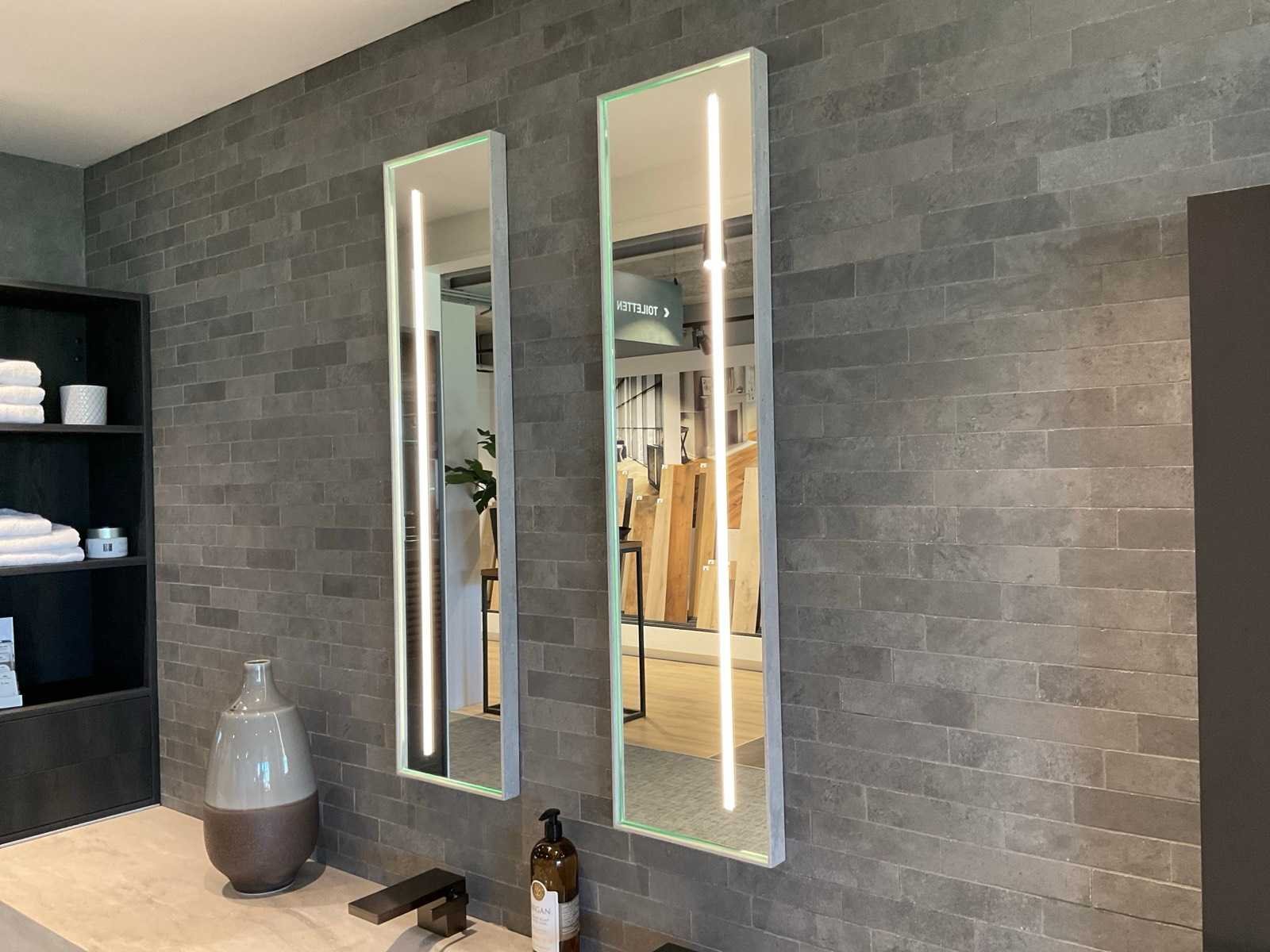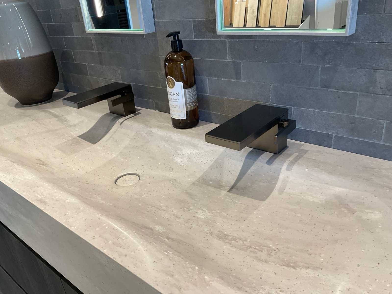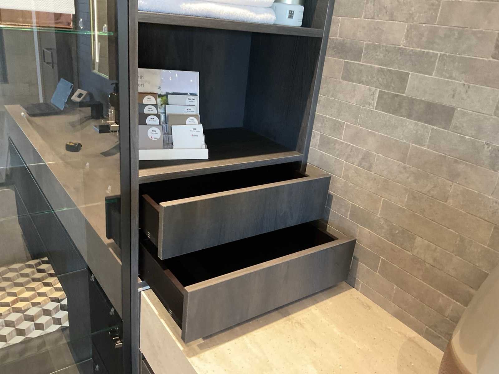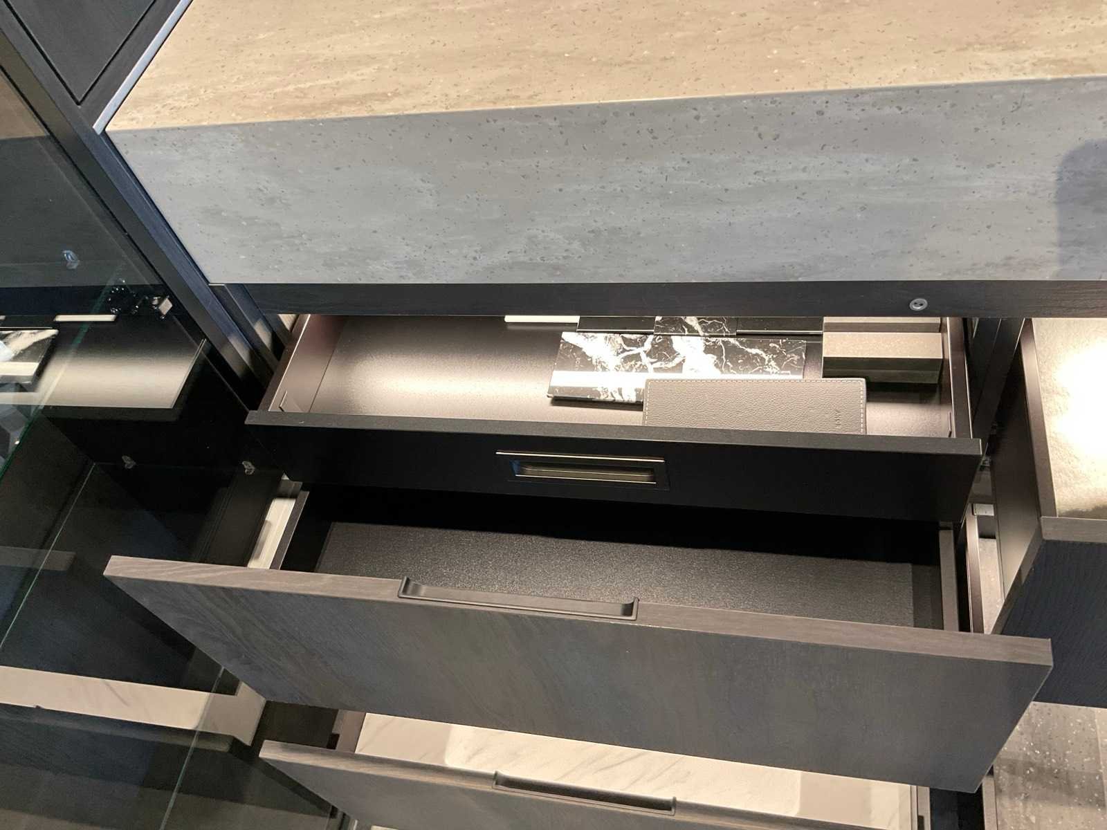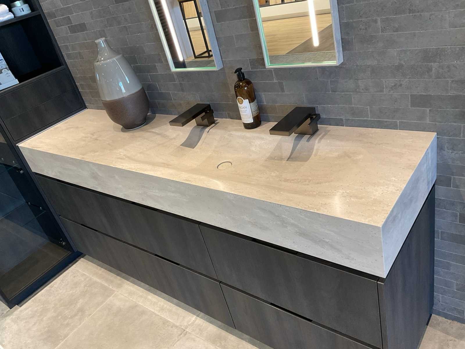 Badmeubel met 6 laden en 1 binnenlade; met ladeverlichting; werkblad Corian; 2 stuks Axor wastafelmengkranen; Gun Metal; 2 wandkasten waarvan 1 met glasdeur en 5 glazen legplanken en 1 met 2 lades en 2 open vakken; 2 badkamerspiegel; in Corian kader; met verlichting; LET OP: door koper zelf ter plaatse nog te demonteren; zonder de getoonde accessoires Nee Merk: Elise Hoogte: 90cm Lengte: 250cm Breedte: 51cm Kraan: Axor