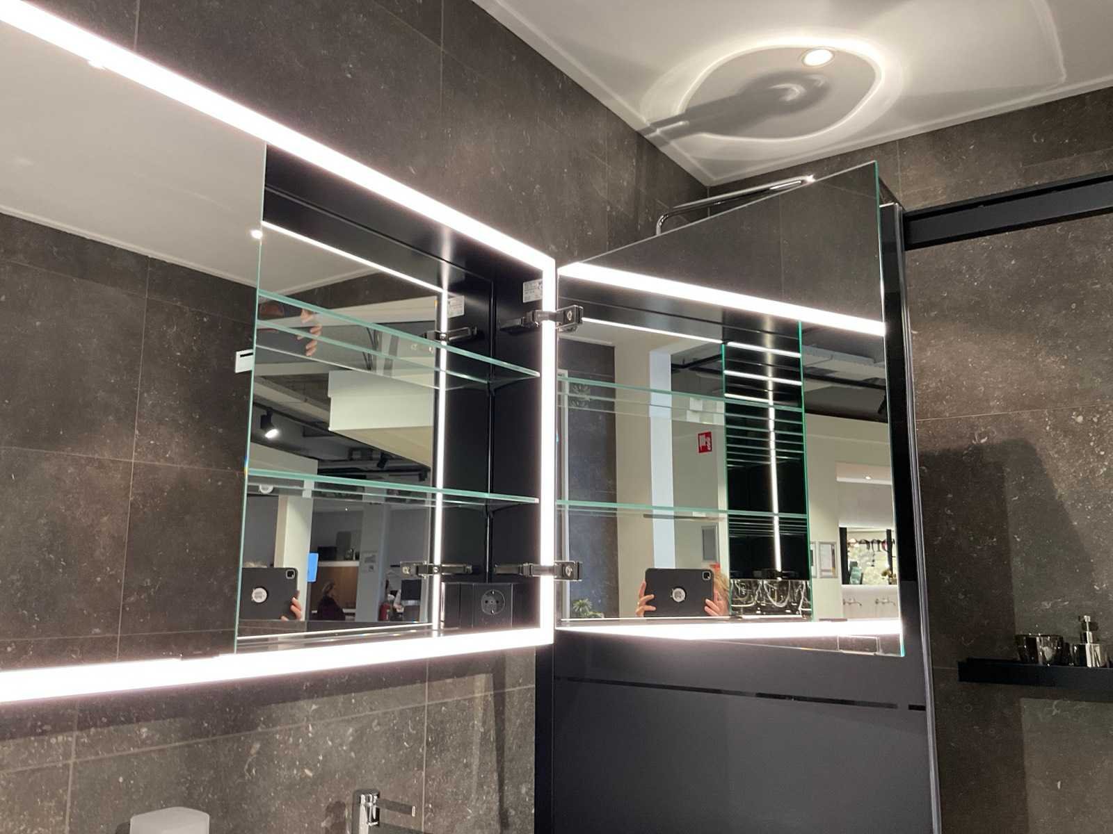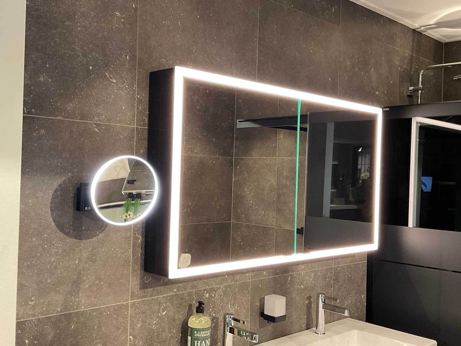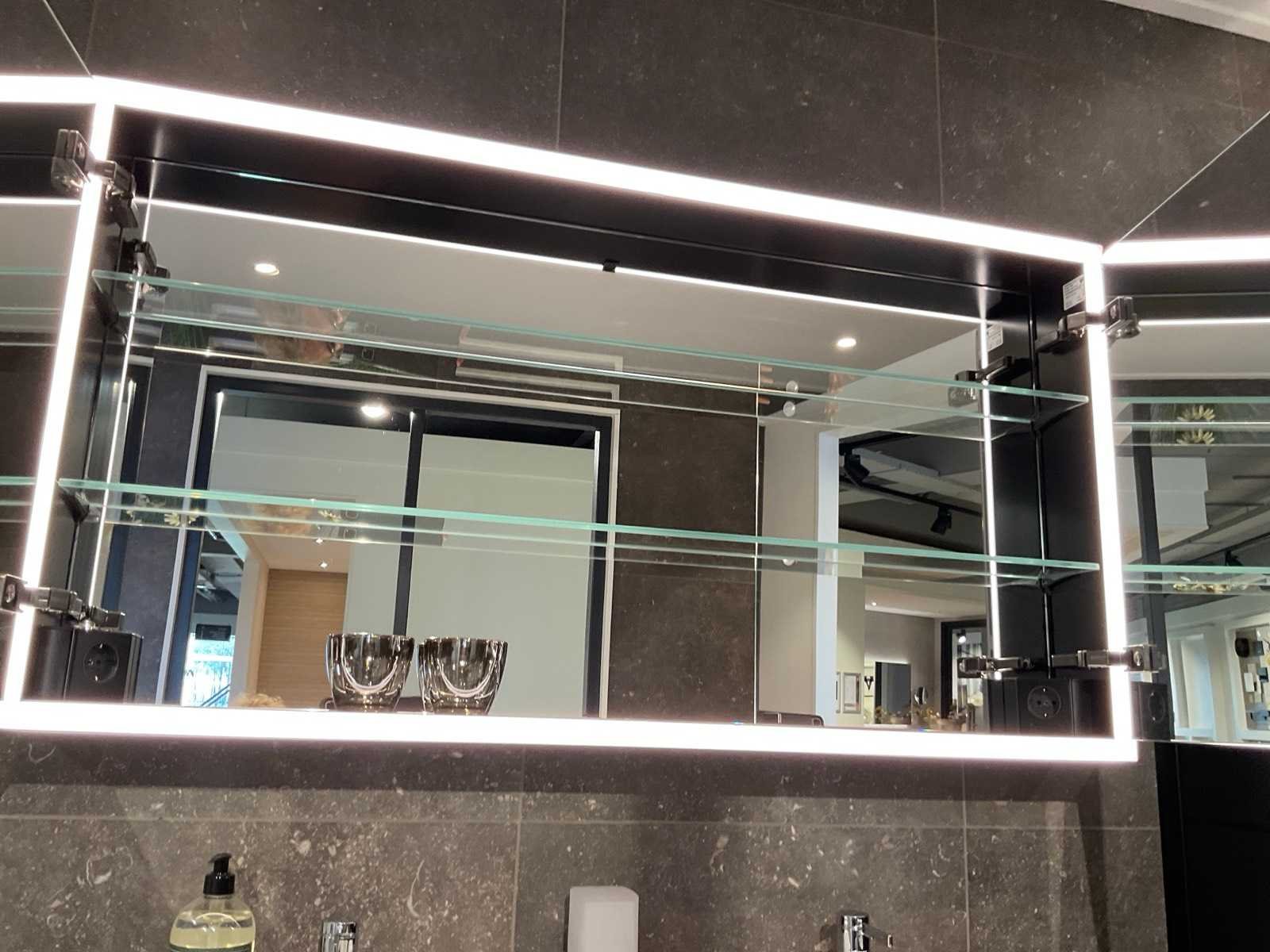 2 dubbelzijdige spiegeldeuren met 2 glazen legplanken; achterwand spiegel; 2 wandcontactdozen; scheerspiegel diameter 21 cm; LET OP: door koper zelf ter plaatse nog te demonteren; zonder de getoonde accessoires Nee Merk: Emco Lengte: 130cm Breedte: 150cm Hoogte: 70cm