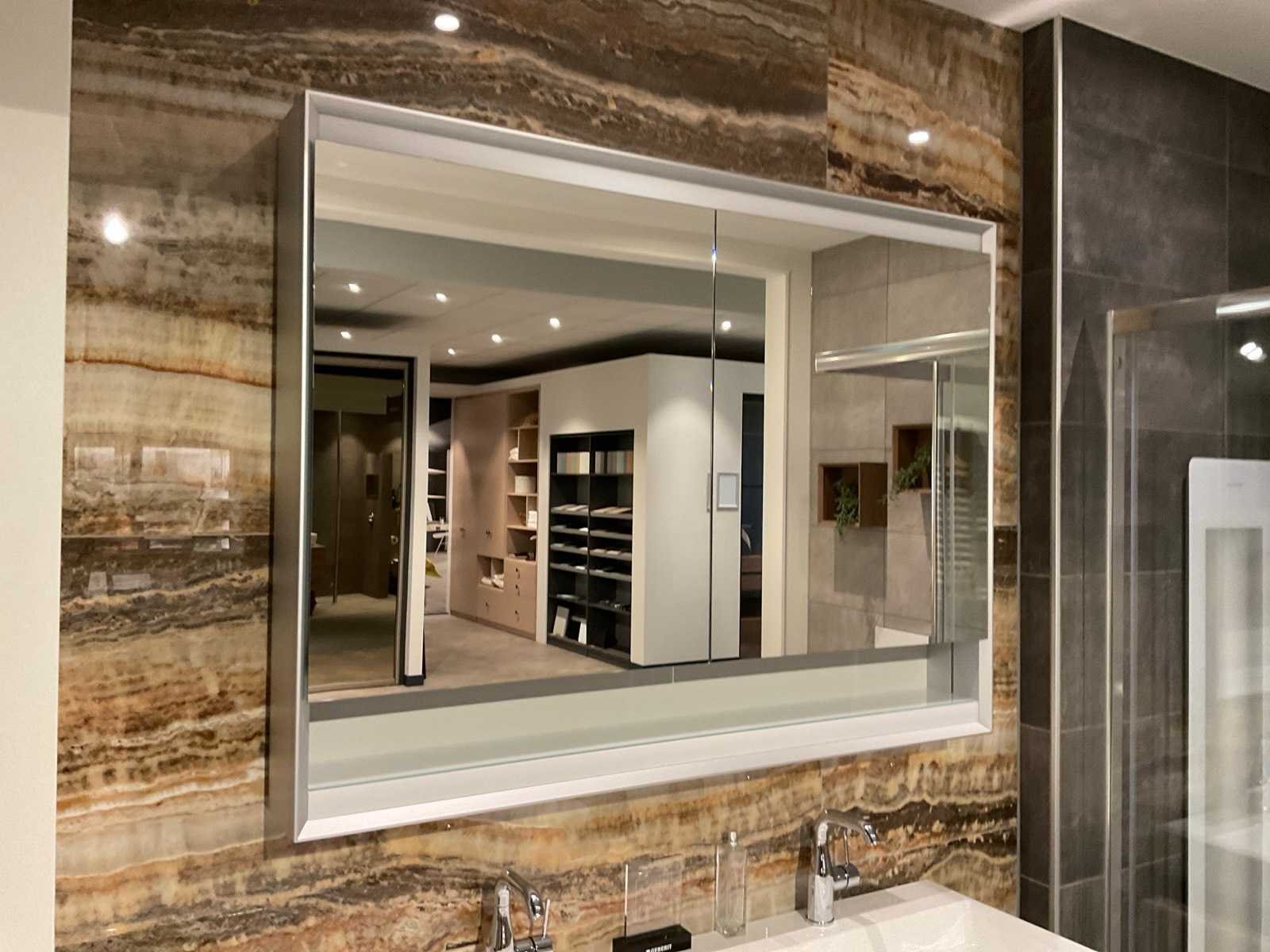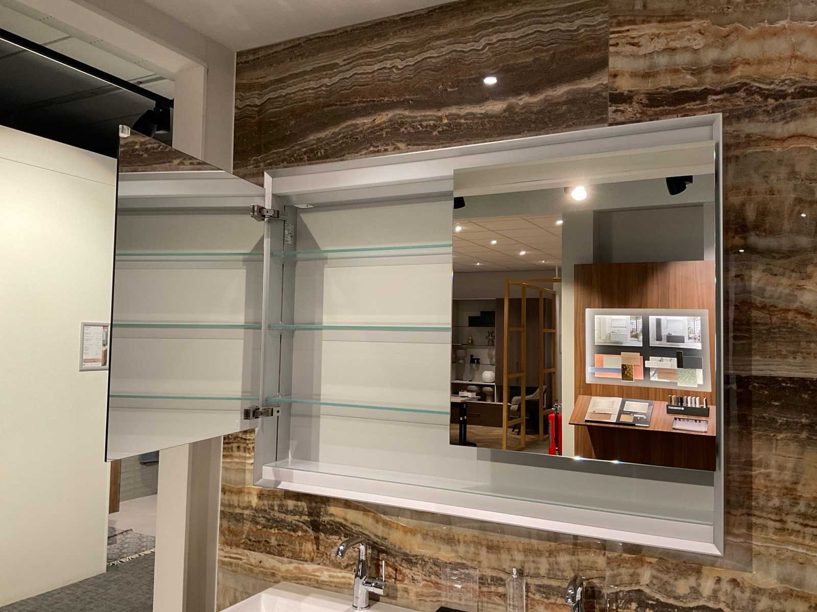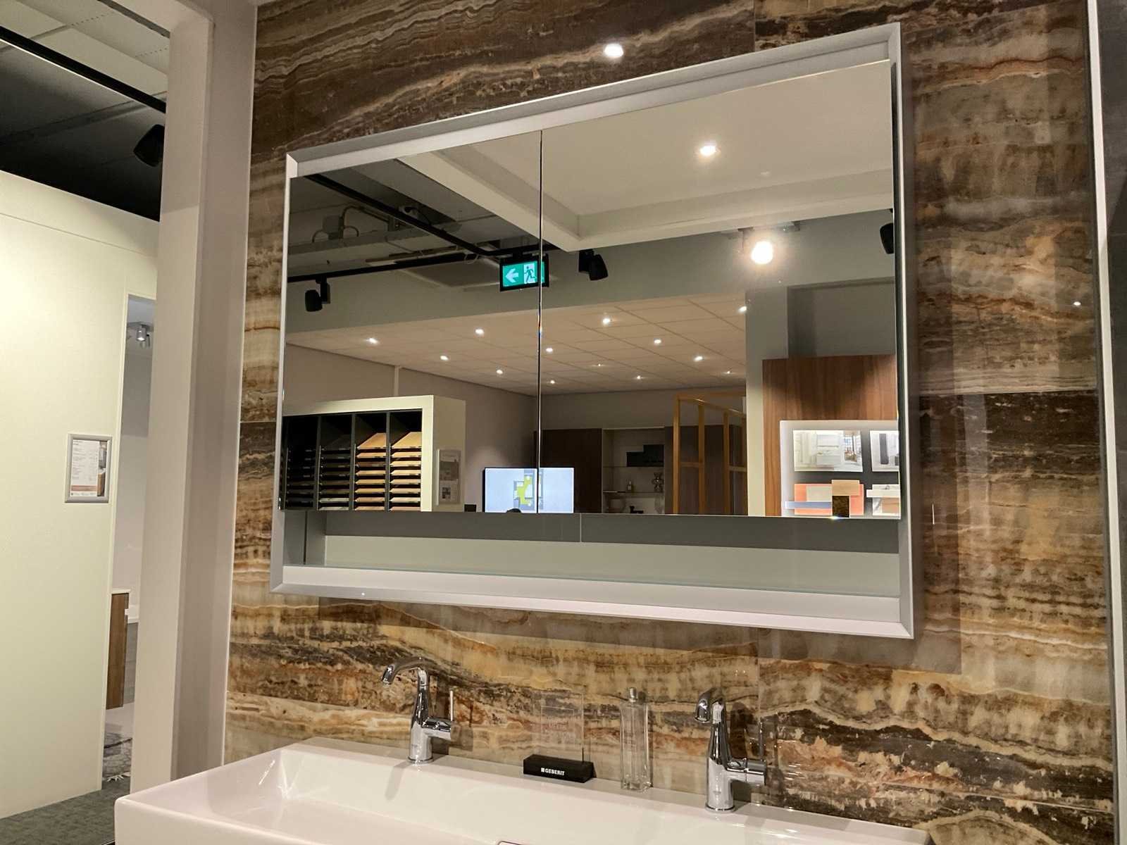 2 dubbelzijdige spiegeldeuren; met 3 glazen legplanken; 1 open vak; 2 stopcontacten; LET OP: door koper zelf ter plaatse nog te demonteren; zonder de getoonde accessoires Nee Merk: Geberit Lengte: 120cm Breedte: 150cm Hoogte: 90cm