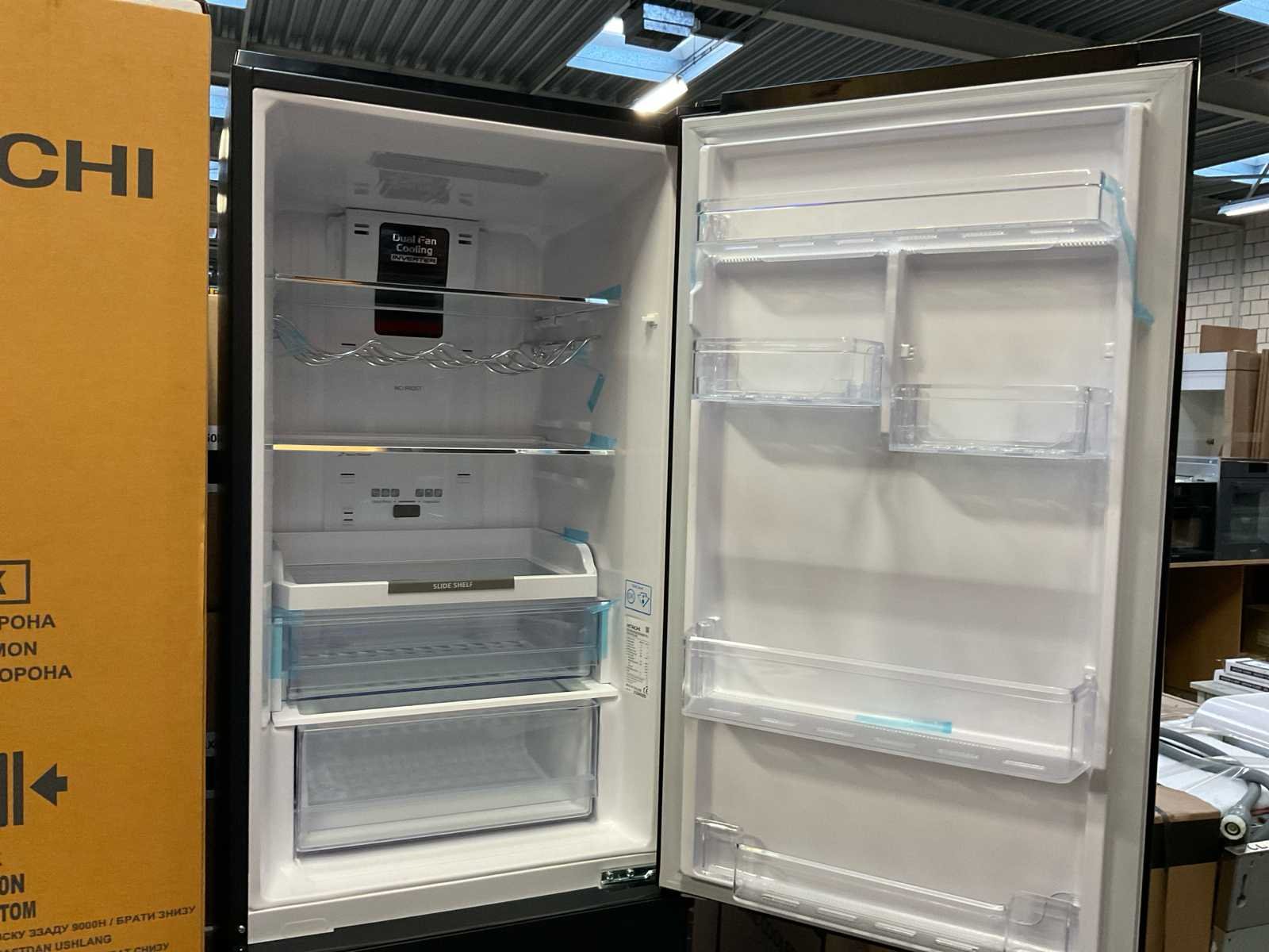 Colorglass black deur; Dual Fan cooling Nee Merk: Hitachi Model: R-BGX411PRUO Netto inhoud koelvakken: 215l Netto inhoud Vriesvak: 115l Lengte: 60cm Breedte: 65cm Hoogte: 186cm