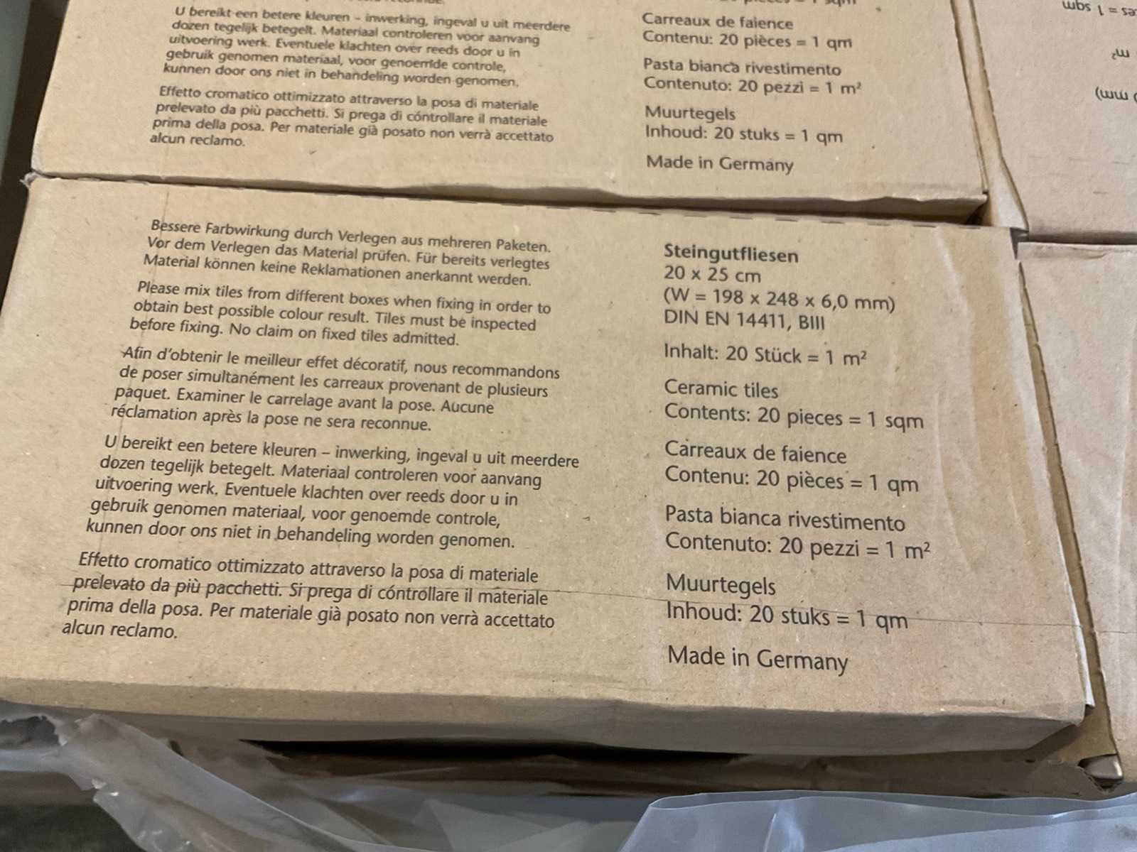 20 stuks per pak; 1 m²; totaal 92 pakken; ca. 92 m² Nee Merk: Steingutfliesen Kleur: mat wit Lengte: 25cm Breedte: 20cm Dikte: 6mm