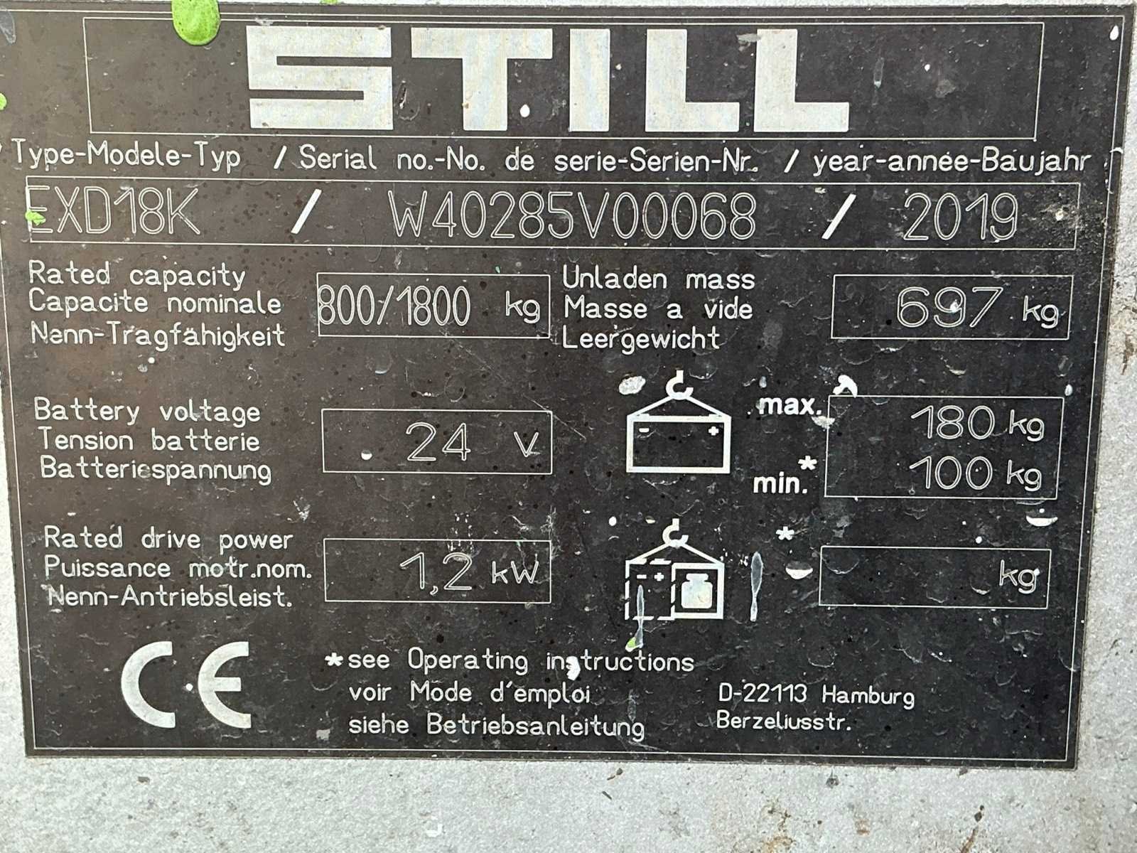 Nee Merk: Still Type: EXD18K Bouwjaar: 2019 Serienummer: W40285V00066 Hefvermogen: 1800kg Hefhoogte: 2100mm Lepellengte: 1150mm Eigen gewicht: 877kg Totale afmeting L: 1900mm Totale afmeting Breedte: 720mm Totale afmeting Hoogte: 1470mm