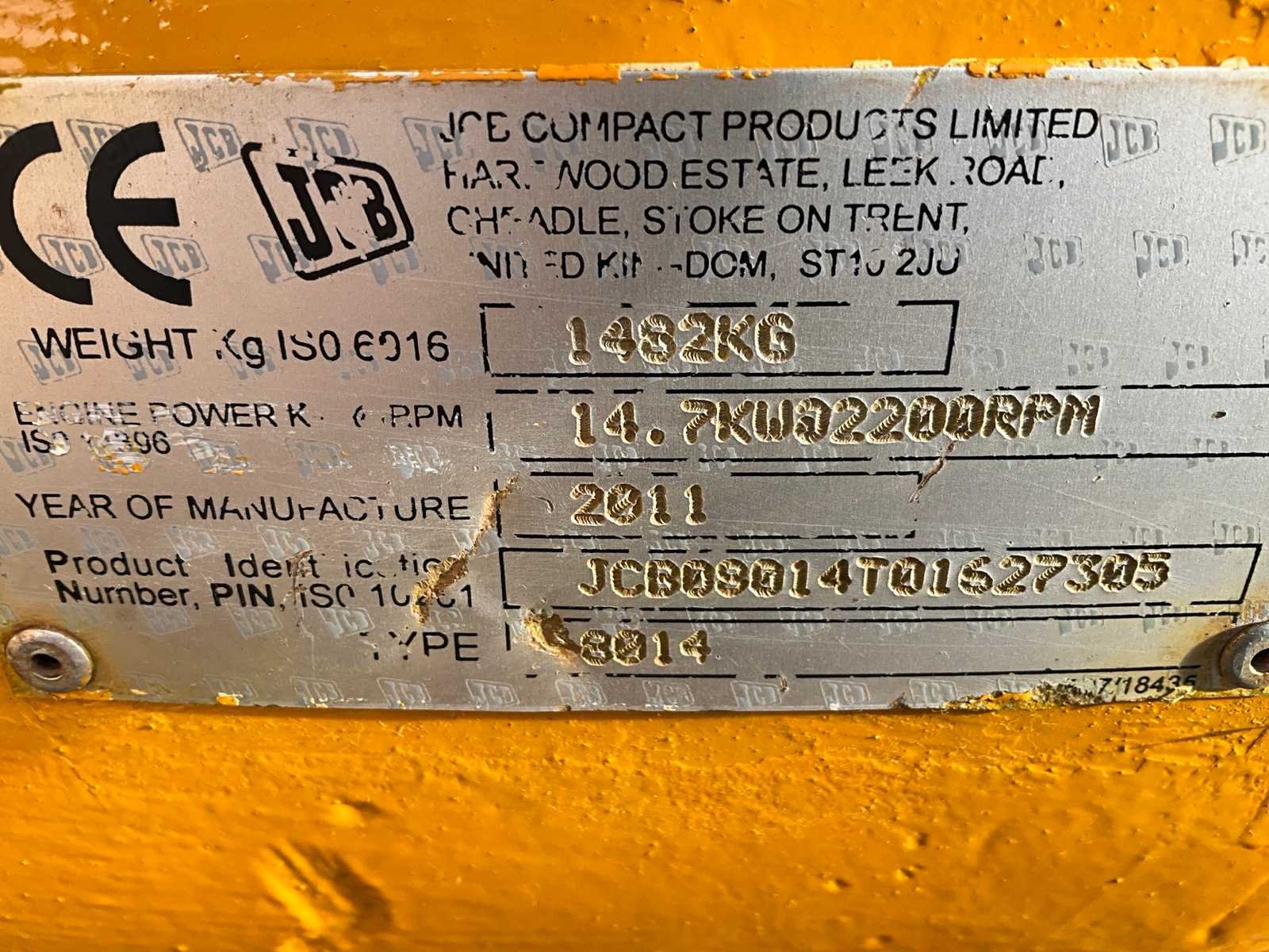 Nee Merk: JCB Type: 8014 CTS Bouwjaar: 2011 Serienummer: JCB08014T01627305 Merk motor: Perkins Brandstof: Diesel Bedrijfsgewicht: 1462kg Inclusief graafbak: Yes Graafbak afm. b: 880mm Rups breedte: 230mm Afgelezen urenstand: 2167 Totale afmeting Breedte: 960mm Totale afmeting Hoogte: 2300mm