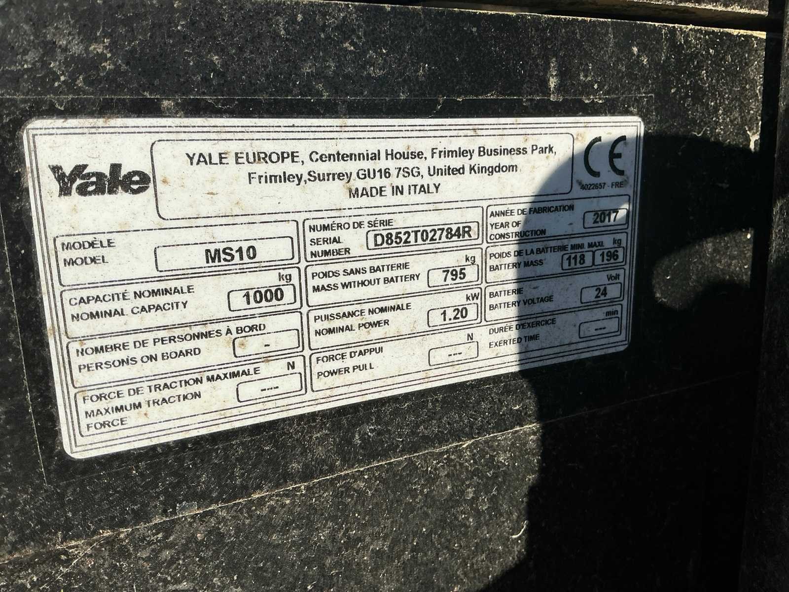 Nee Merk: Yale Type: MS10 Bouwjaar: 2017 Serienummer: D852T02784R Hefvermogen: 1000kg Hefhoogte: 3400mm Lepellengte: 1150mm Afgelezen urenstand: 466 Eigen gewicht: 910kg Totale afmeting L: 2550mm Totale afmeting Breedte: 800mm Totale afmeting Hoogte: 2150mm