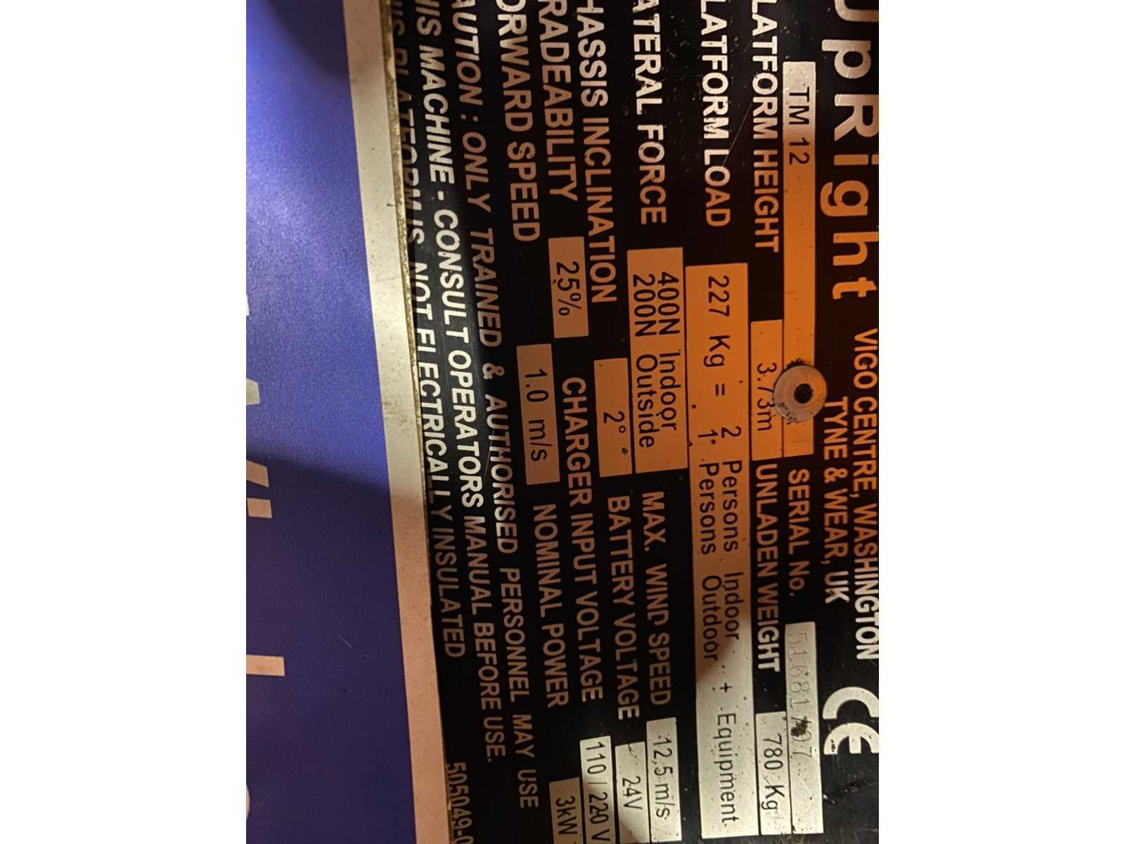 Joystick hapert, wil boven niet zakken. Nee Merk: Upright Type: TM12 Serienummer: 51681/07 Elektrisch: true Motorvermogen (kW): 3kW Telescoop hoogwerker: true Masthoogwerker: true Werkhoogte: 5800mm Plateau afm. l: 1040mm Plateau afm. b: 740mm Platform capaciteit: 227kg Accu lader: true Eigen gewicht: 780kg Totale afmeting L: 1350mm Totale afmeting Breedte: 760mm Totale afmeting Hoogte: 1800mm