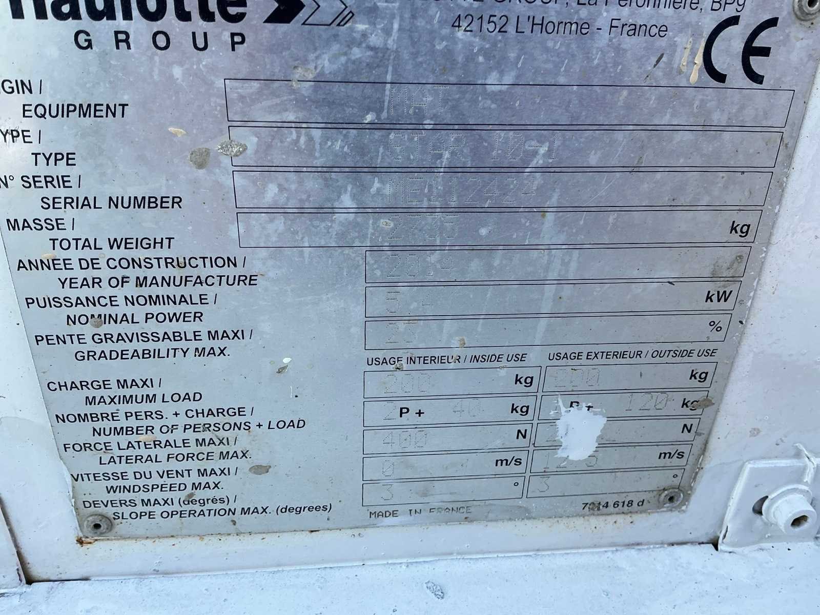 Nee Merk: Haulotte Type: Star 10-1 Bouwjaar: 2014 Serienummer: ME112424 Elektrisch: true Telescoop hoogwerker: true Knikarm hoogwerker: true Masthoogwerker: true Werkhoogte: 10000mm Plateau afm. l: 780mm Plateau afm. b: 980mm Platform capaciteit: 200kg Accu lader: true Afgelezen urenstand: 567 Eigen gewicht: 2735kg Totale afmeting L: 2700mm Totale afmeting Breedte: 1000mm Totale afmeting Hoogte: 2000mm