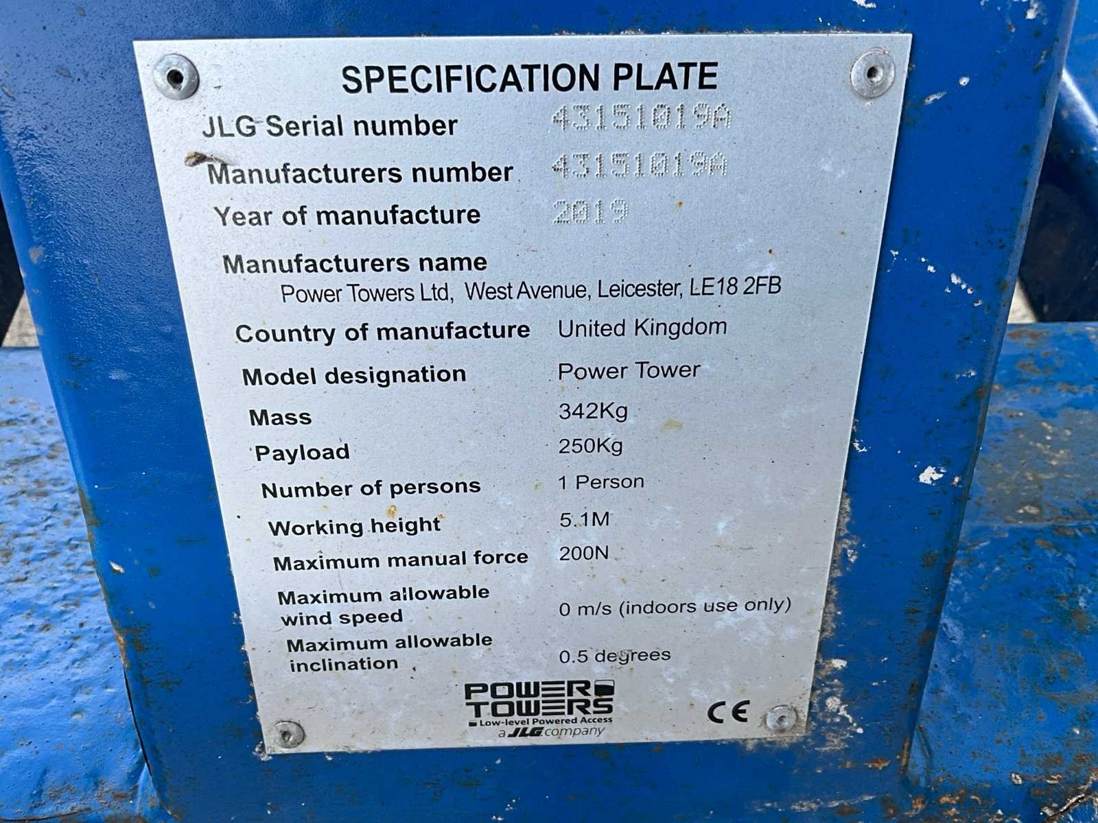 Nee Merk: JLG Type: Power tower Bouwjaar: 2019 Serienummer: 43151019A Elektrisch: true Knikarm hoogwerker: true Werkhoogte: 5100mm Plateau afm. l: 1500mm Plateau afm. b: 750mm Platform capaciteit: 250kg Accu lader: true Eigen gewicht: 342kg Totale afmeting L: 1700mm Totale afmeting Breedte: 760mm Totale afmeting Hoogte: 1850mm