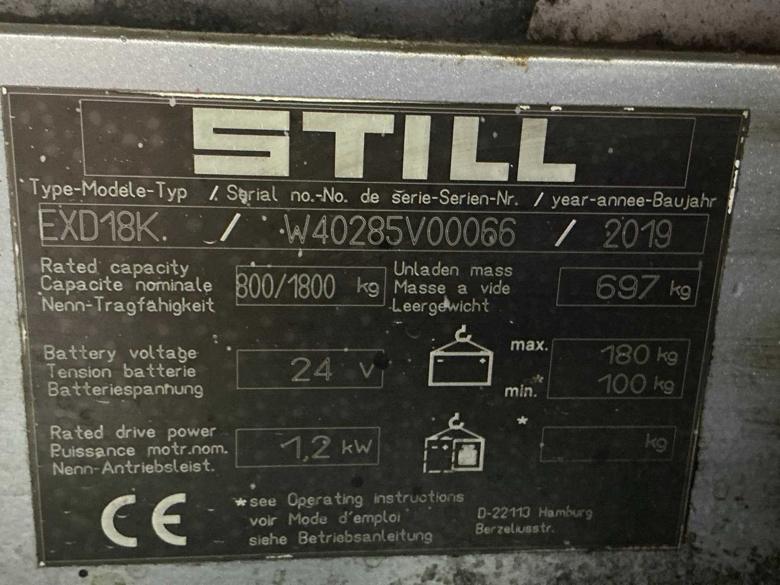 Voorzien van weegunit, geen accu/incompleet Nee Merk: Still Type: EXD18K Bouwjaar: 2019 Serienummer: W40285V00066 Hefvermogen: 1800kg Hefhoogte: 2100mm Lepellengte: 1150mm Eigen gewicht: 877kg Totale afmeting L: 1900mm Totale afmeting Breedte: 720mm Totale afmeting Hoogte: 1470mm