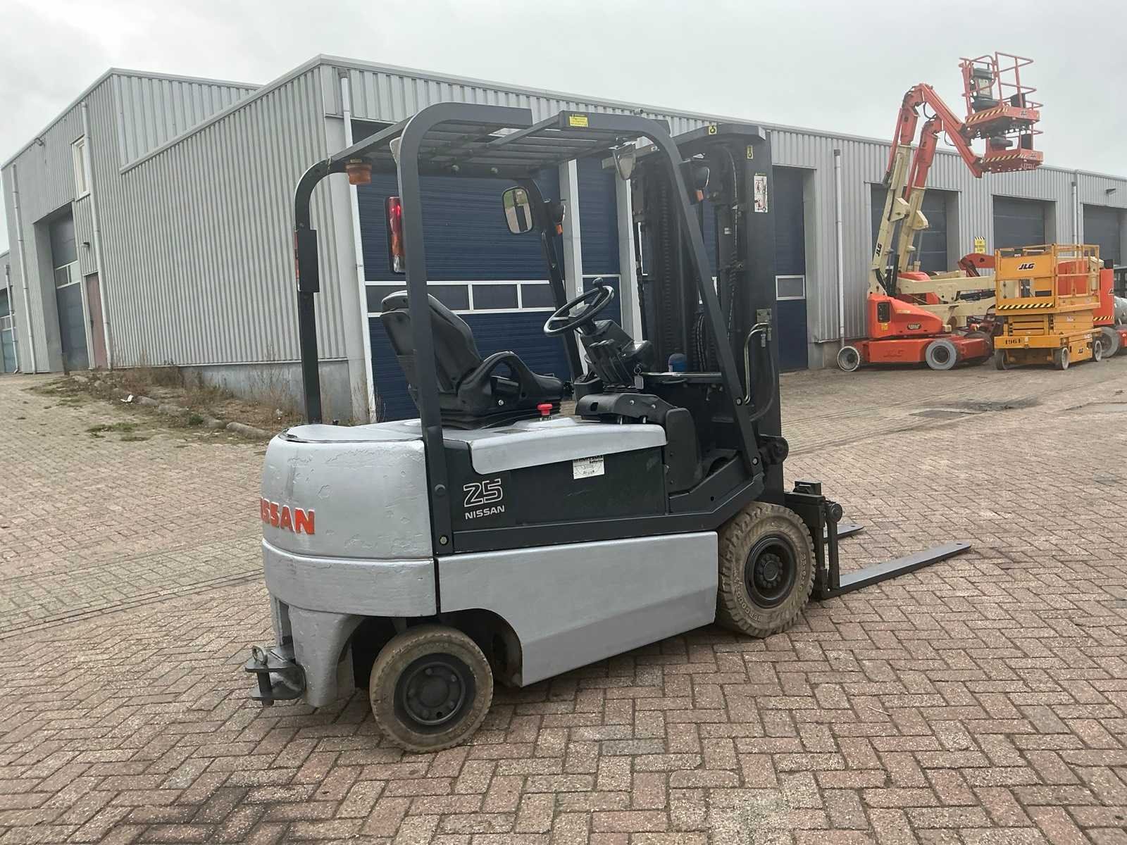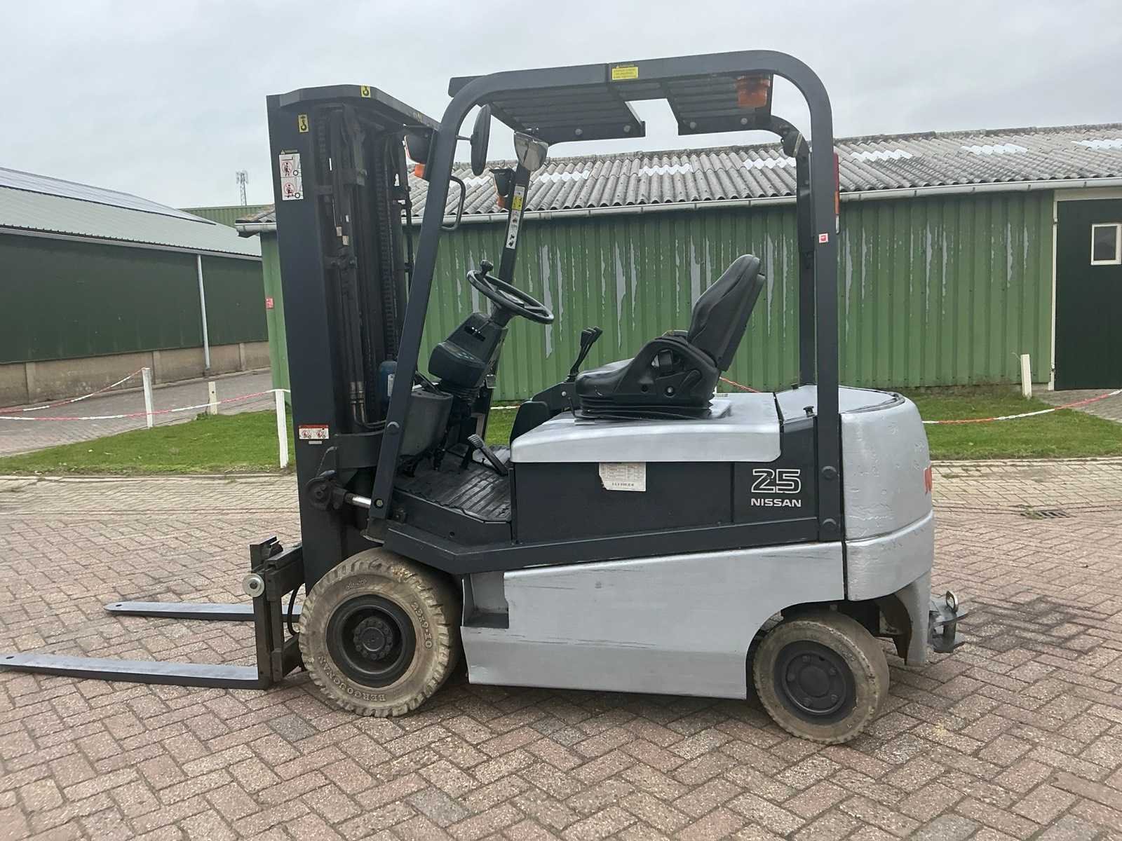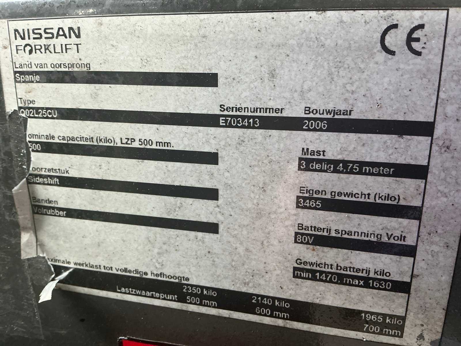 Nee Merk: Nissan Type: Q02L25CU Serienummer: E703413 Brandstof: Elektrisch Mast: Triple Soort band: Volrubber banden Aantal wielen: 4 Free-lift: true Side-shift: true Triple mast: true Eigen gewicht: 5000kg Hefvermogen: 2500kg Lepellengte: 1230mm Hefhoogte: 4750mm Vol rubber banden: true Totale afmeting L: 2500mm Totale afmeting Breedte: 1200mm Totale afmeting Hoogte: 2150mm