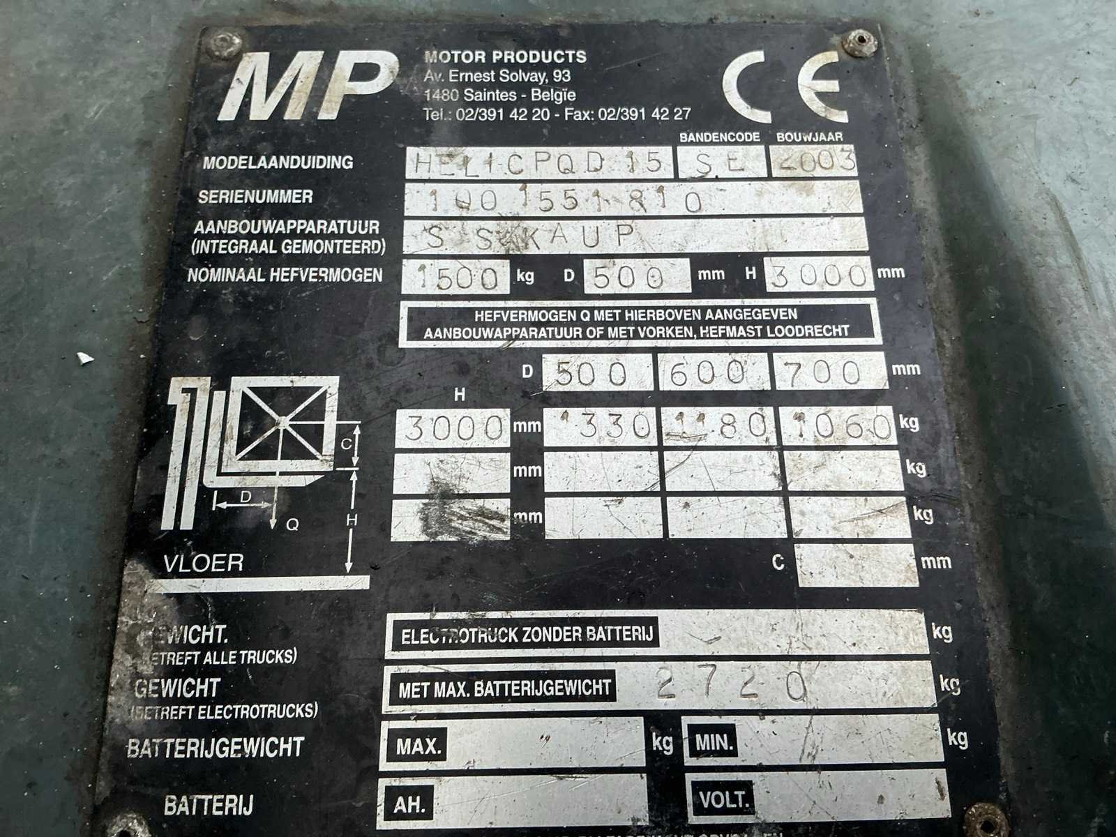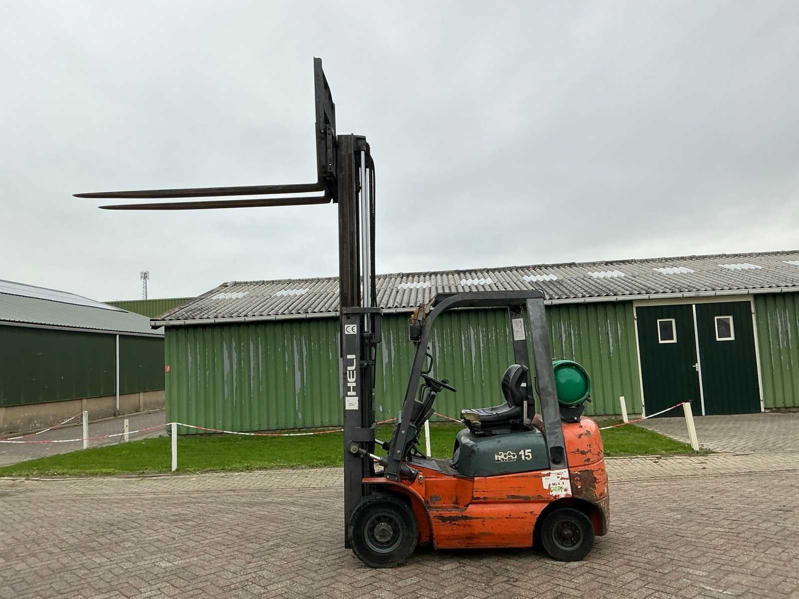 Nee Merk: HELI Bouwjaar: 2003 Serienummer: 1001551810 Brandstof: LPG Mast: Duplex Soort band: Volrubber banden Aantal wielen: 4 Side-shift: true Duplex mast: true Eigen gewicht: 2720kg Hefvermogen: 1500kg Lepellengte: 2000mm Totale afmeting L: 2300mm Totale afmeting Breedte: 1050mm Totale afmeting Hoogte: 2000mm