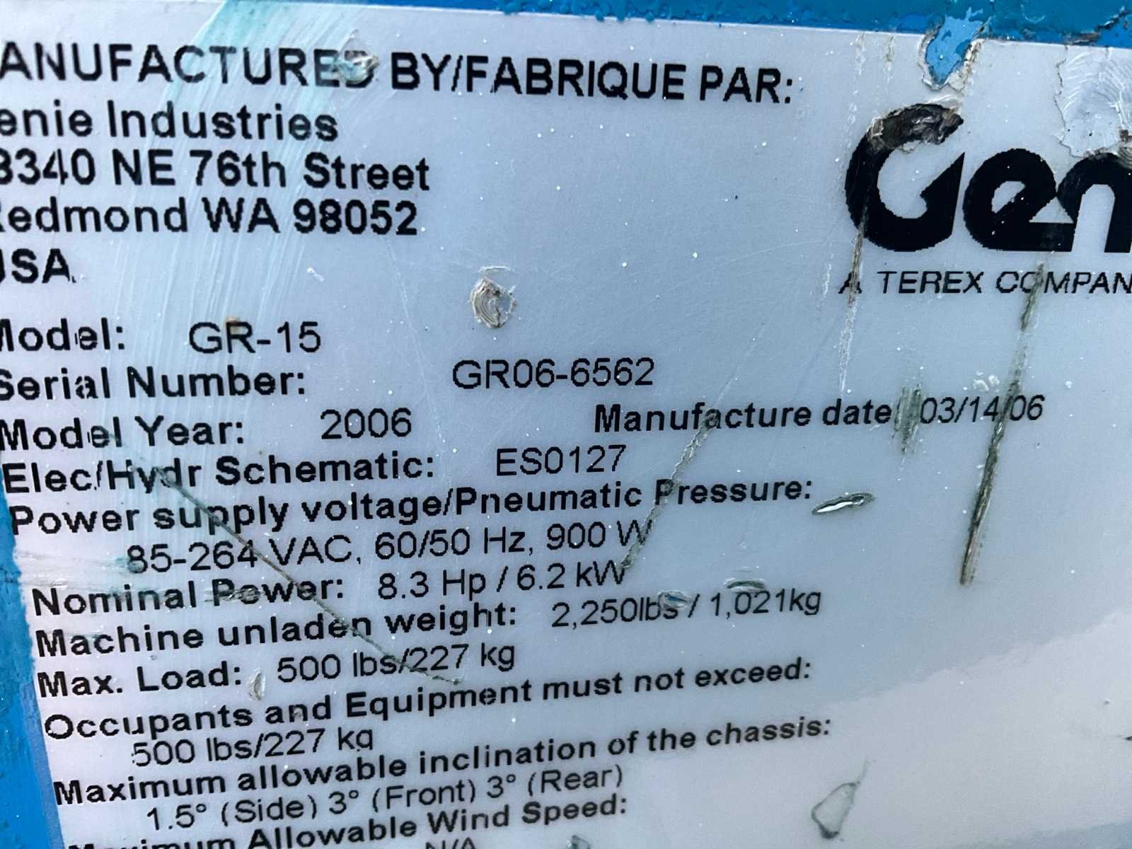 Nee Merk: Genie Type: GR-15 Bouwjaar: 2006 Serienummer: 6562 Telescoop hoogwerker: true Masthoogwerker: true Werkhoogte: 6470mm Plateau afm. l: 900mm Plateau afm. b: 750mm Platform capaciteit: 227kg Accu lader: true Afgelezen urenstand: 771 Eigen gewicht: 1021kg Totale afmeting L: 1380mm Totale afmeting Breedte: 760mm Totale afmeting Hoogte: 1700mm