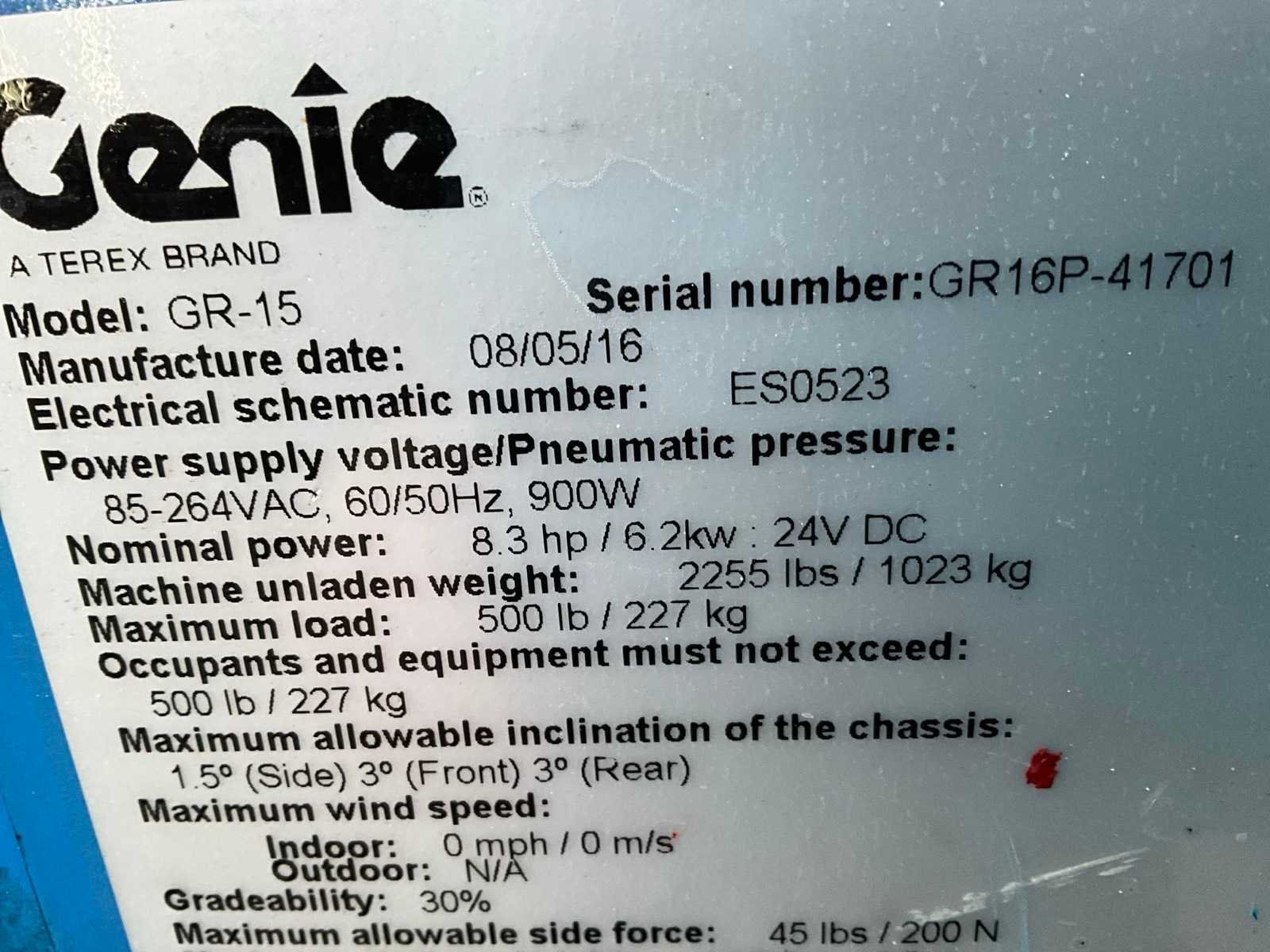 Nee Merk: Genie Type: GR-15 Bouwjaar: 2016 Serienummer: 41701 Telescoop hoogwerker: true Masthoogwerker: true Werkhoogte: 6470mm Plateau afm. l: 900mm Plateau afm. b: 750mm Platform capaciteit: 227kg Accu lader: true Afgelezen urenstand: 308 Eigen gewicht: 1023kg Totale afmeting L: 1380mm Totale afmeting Breedte: 760mm Totale afmeting Hoogte: 1700mm