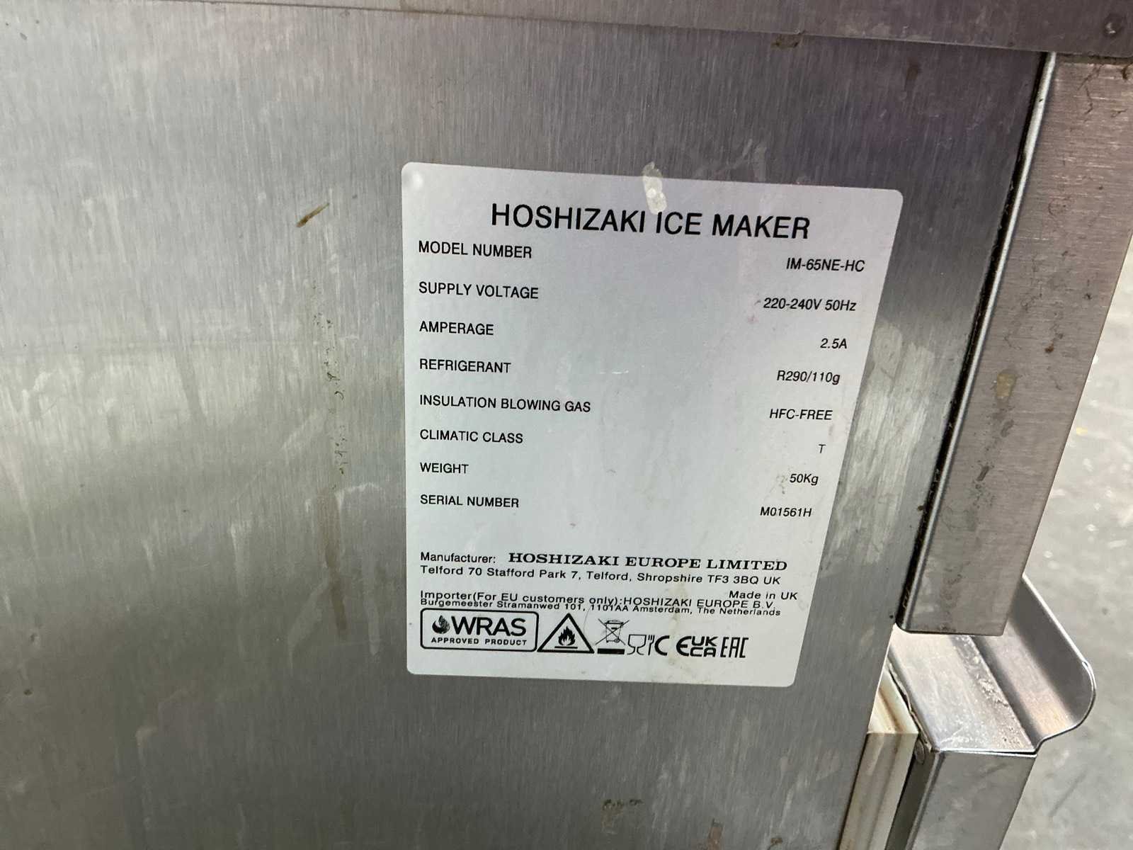 Nee Merk: Hoshizaki Type: IM-65NE-HC Materiaal: Rvs Hoeveelheid koudemiddel: 0.1kg Rvs: true Eigen gewicht: 50kg Aansluiting: 230V Soort koudemiddel: R290 Serienummer: M01561H Ingebouwde koelcompressor: true