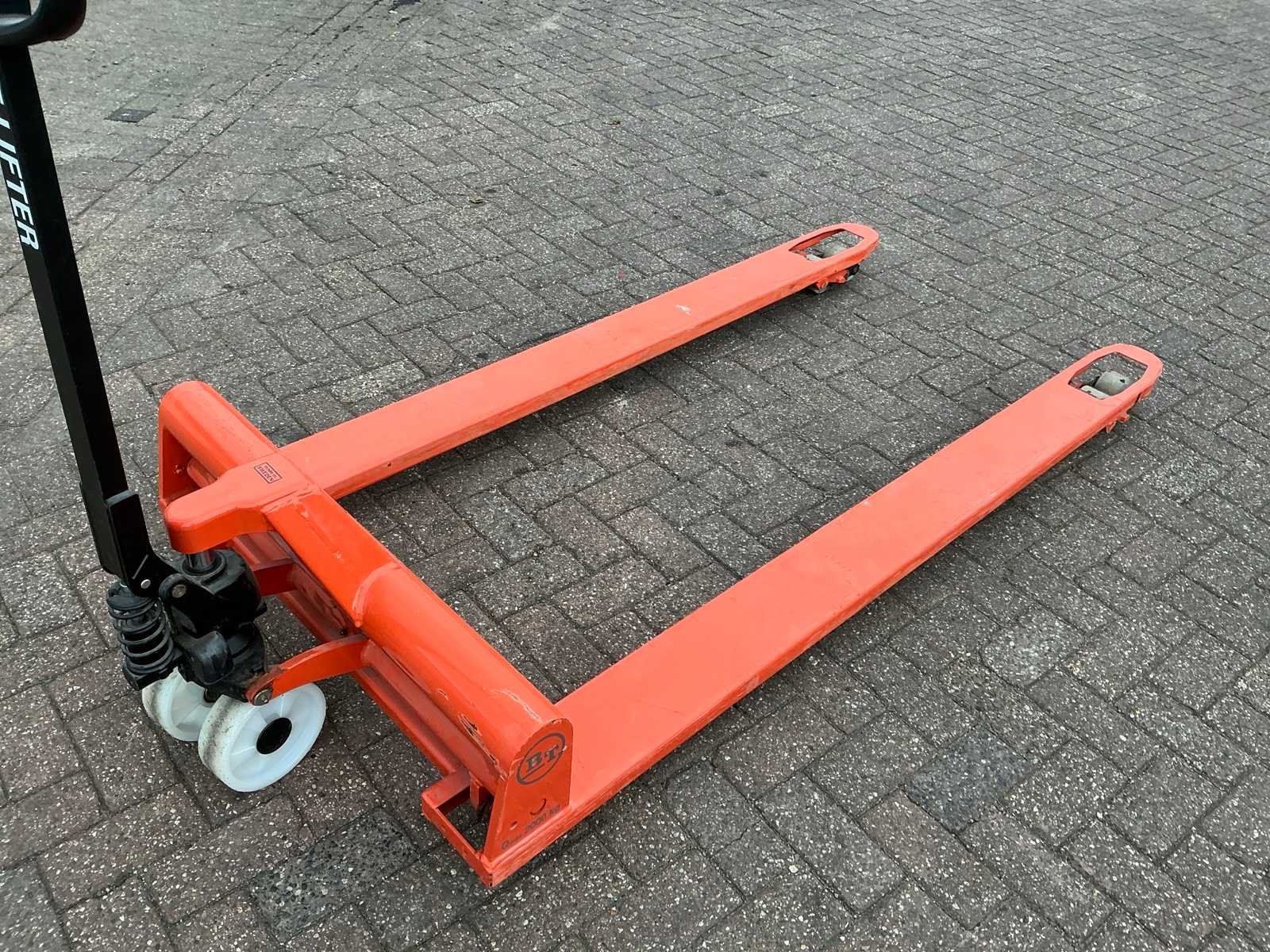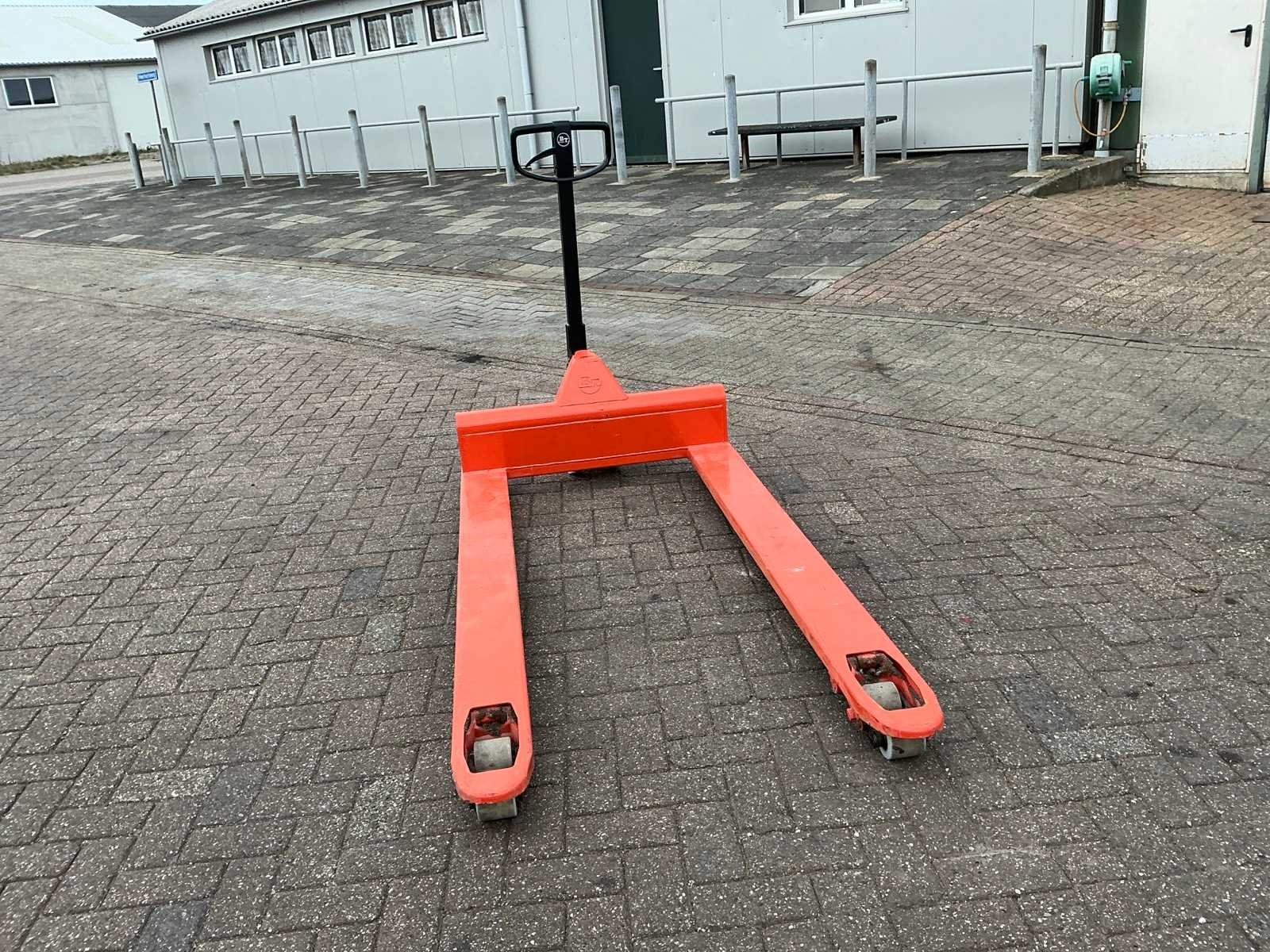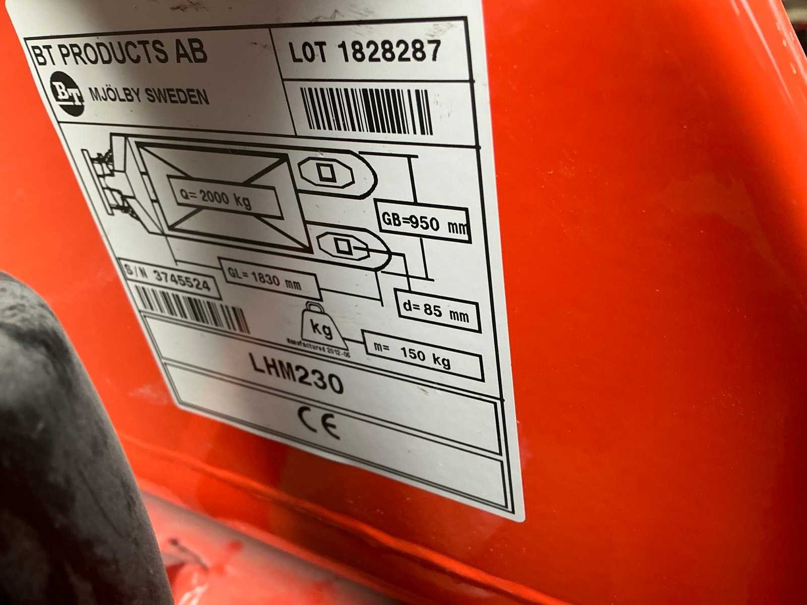 Nee Merk: BT Type: LHM230 Serienummer: 1828287 Hefvermogen: 2000kg Lepellengte: 1830mm Totale afmeting L: 2200mm Totale afmeting Breedte: 950mm Totale afmeting Hoogte: 450mm