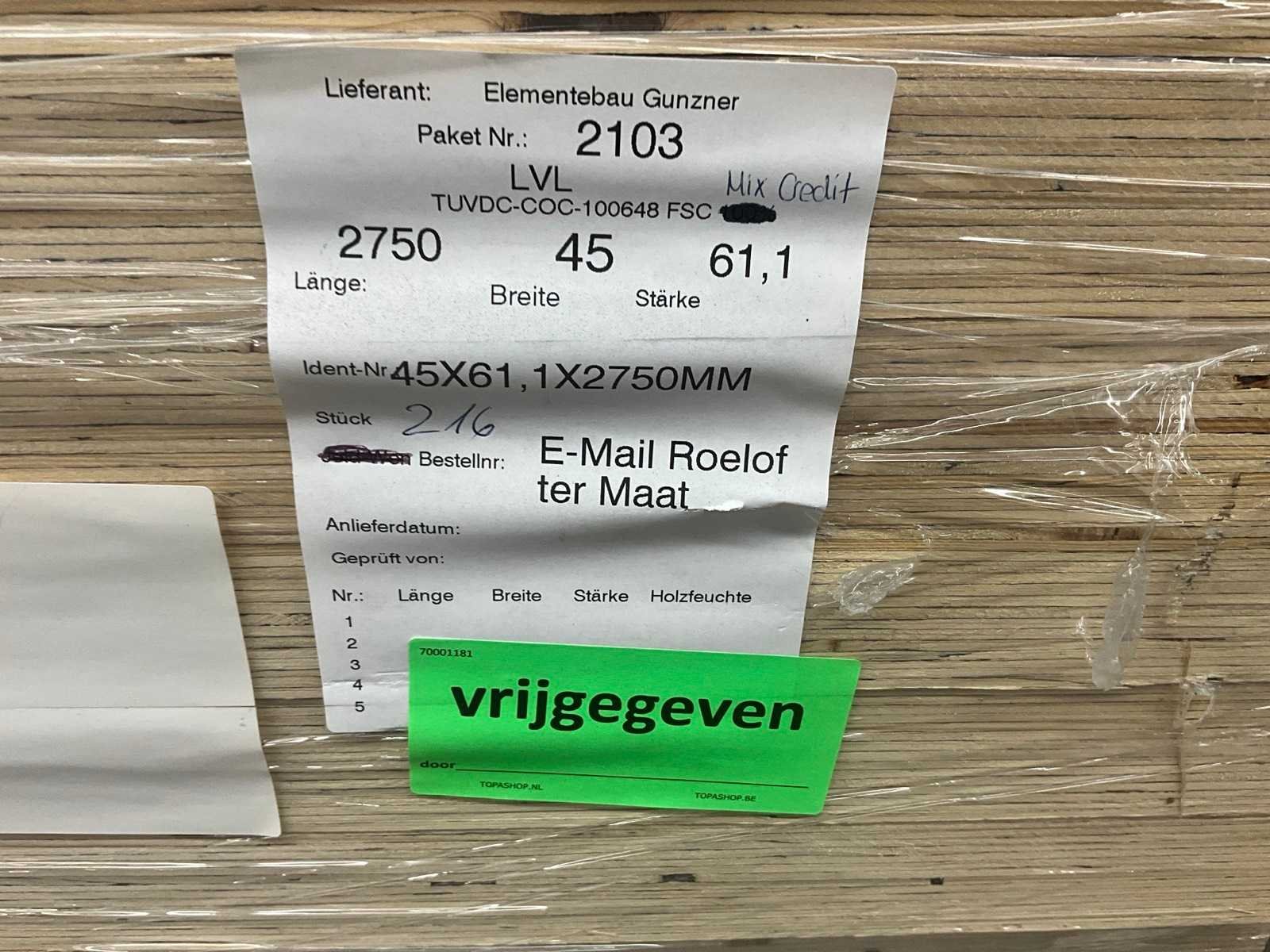 Op 2 pakketten. Nee Kopmaat: 61x45mm Lengte: 2750mm Breedte: 61mm Hoogte: 45mm Materiaal: LVL FSC