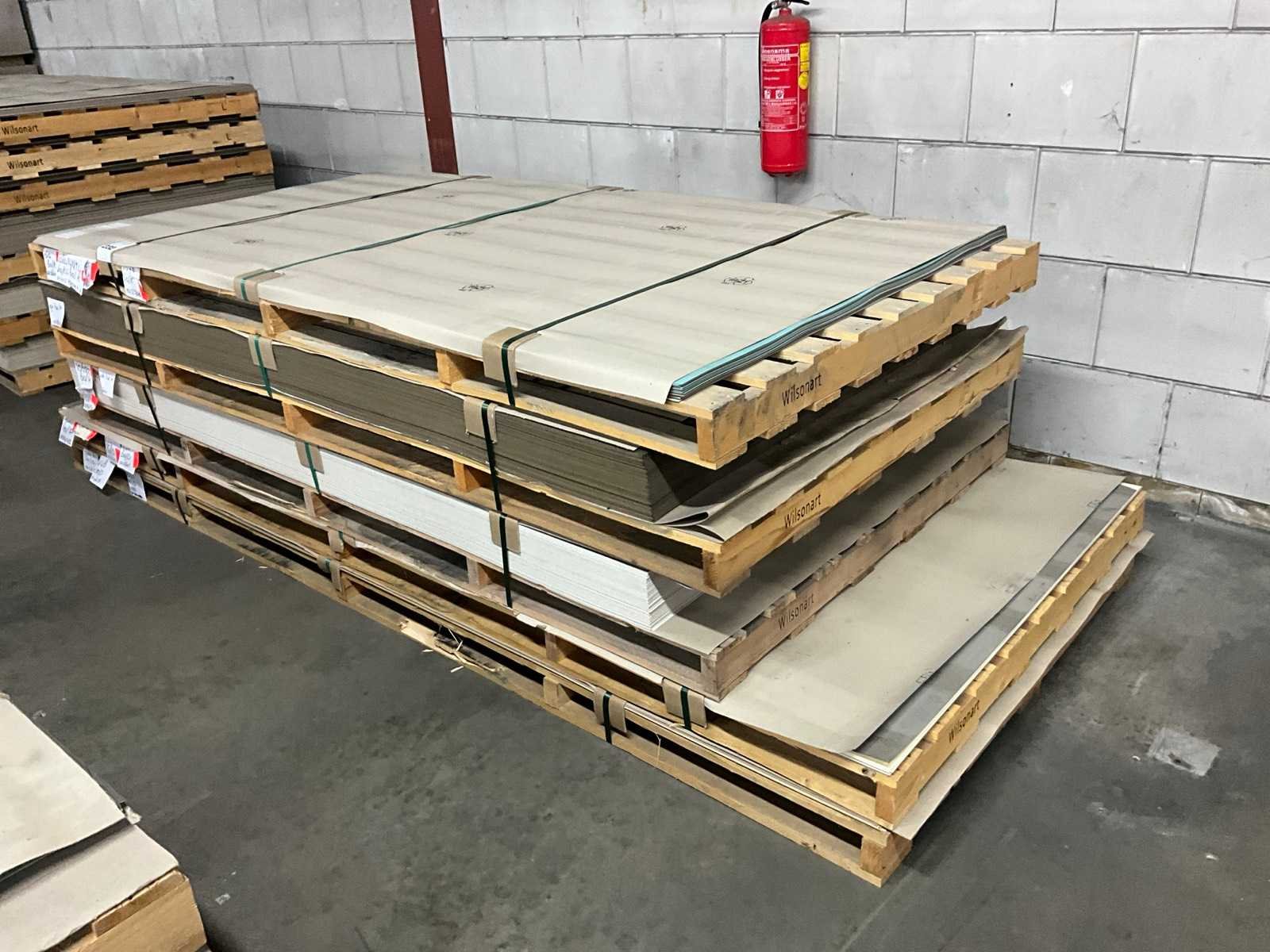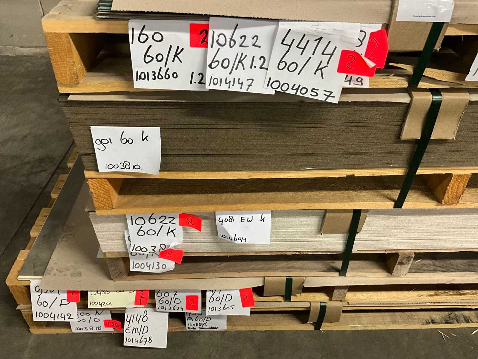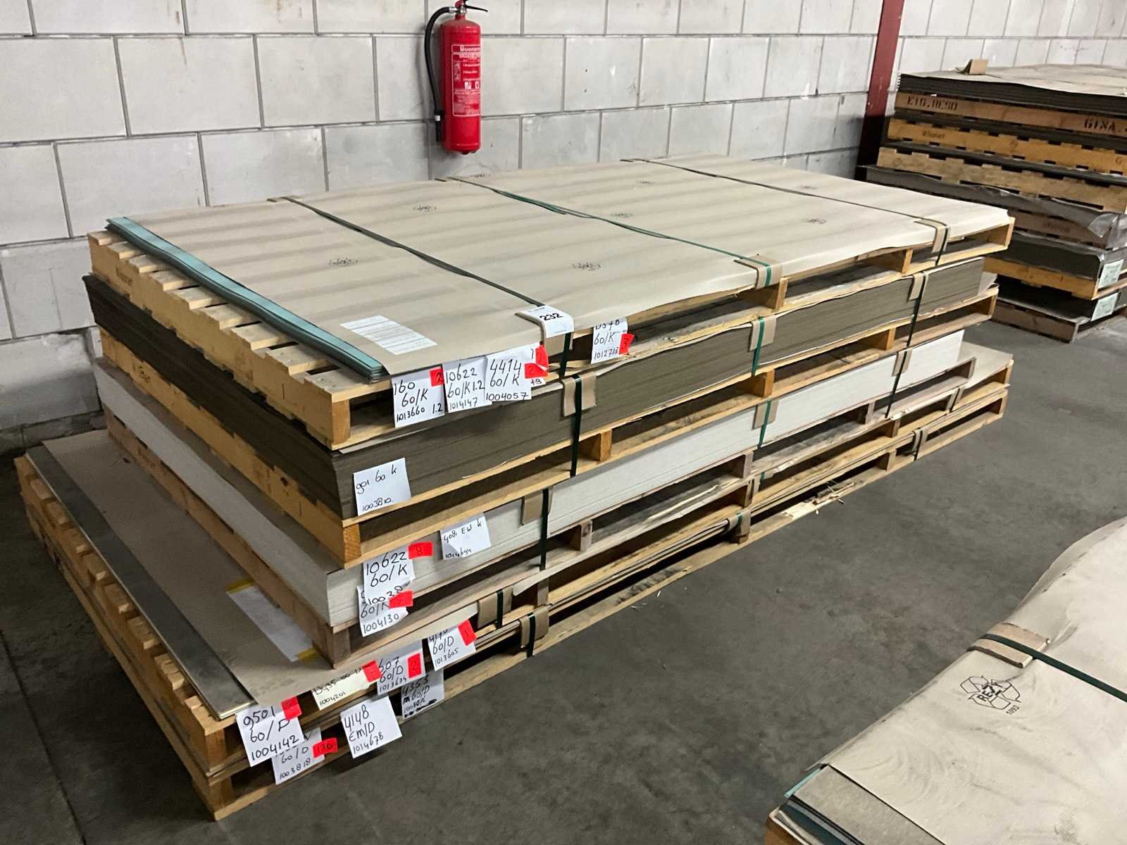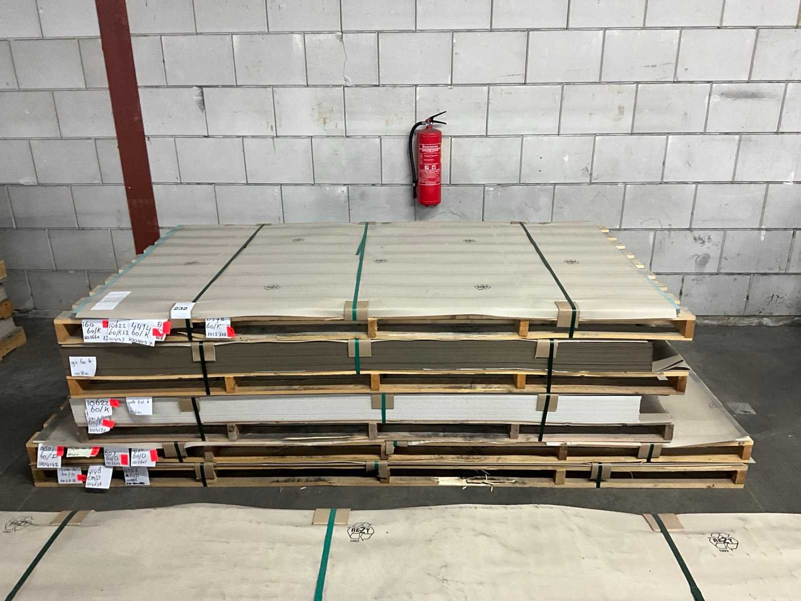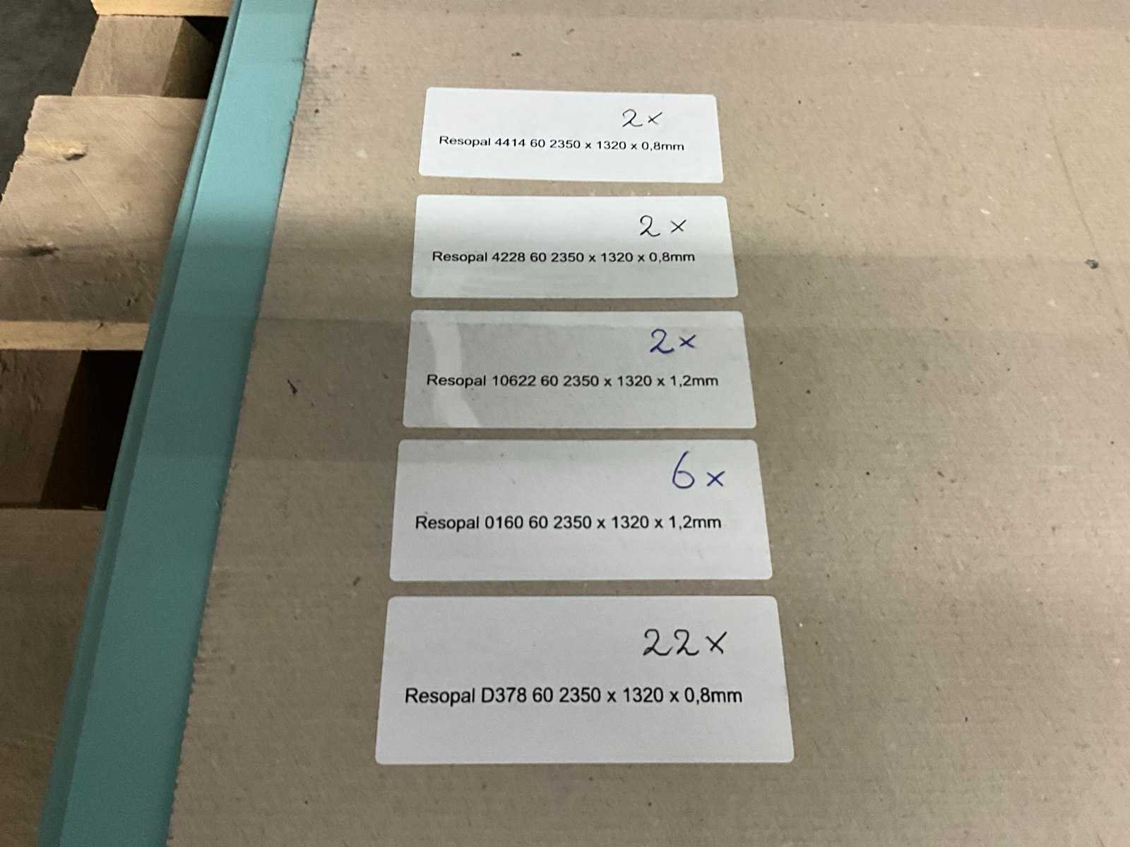 Waarvan de volgende formaten: 2350x1320x0.8mm, 2350x1320x1,2mm. Bestaande uit 5 pallets en diverse kleuren. Nee Merk: Resopal