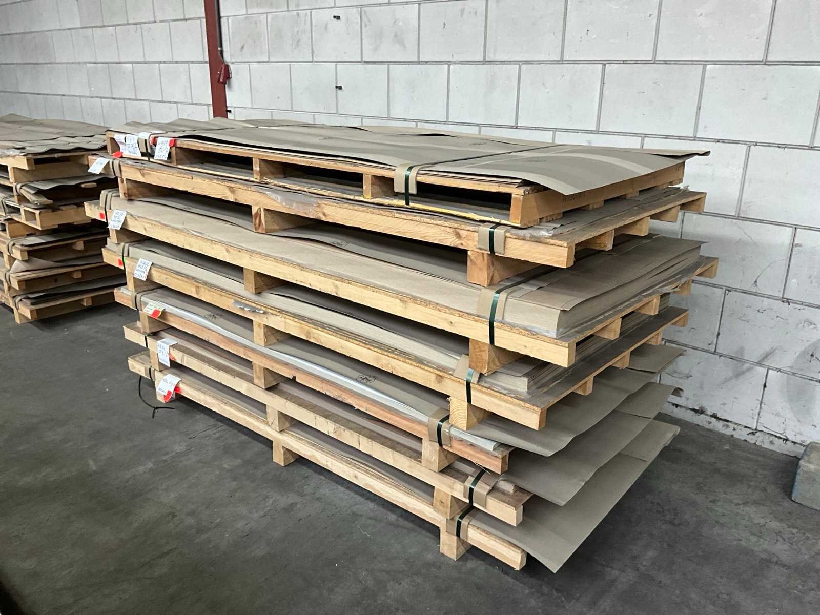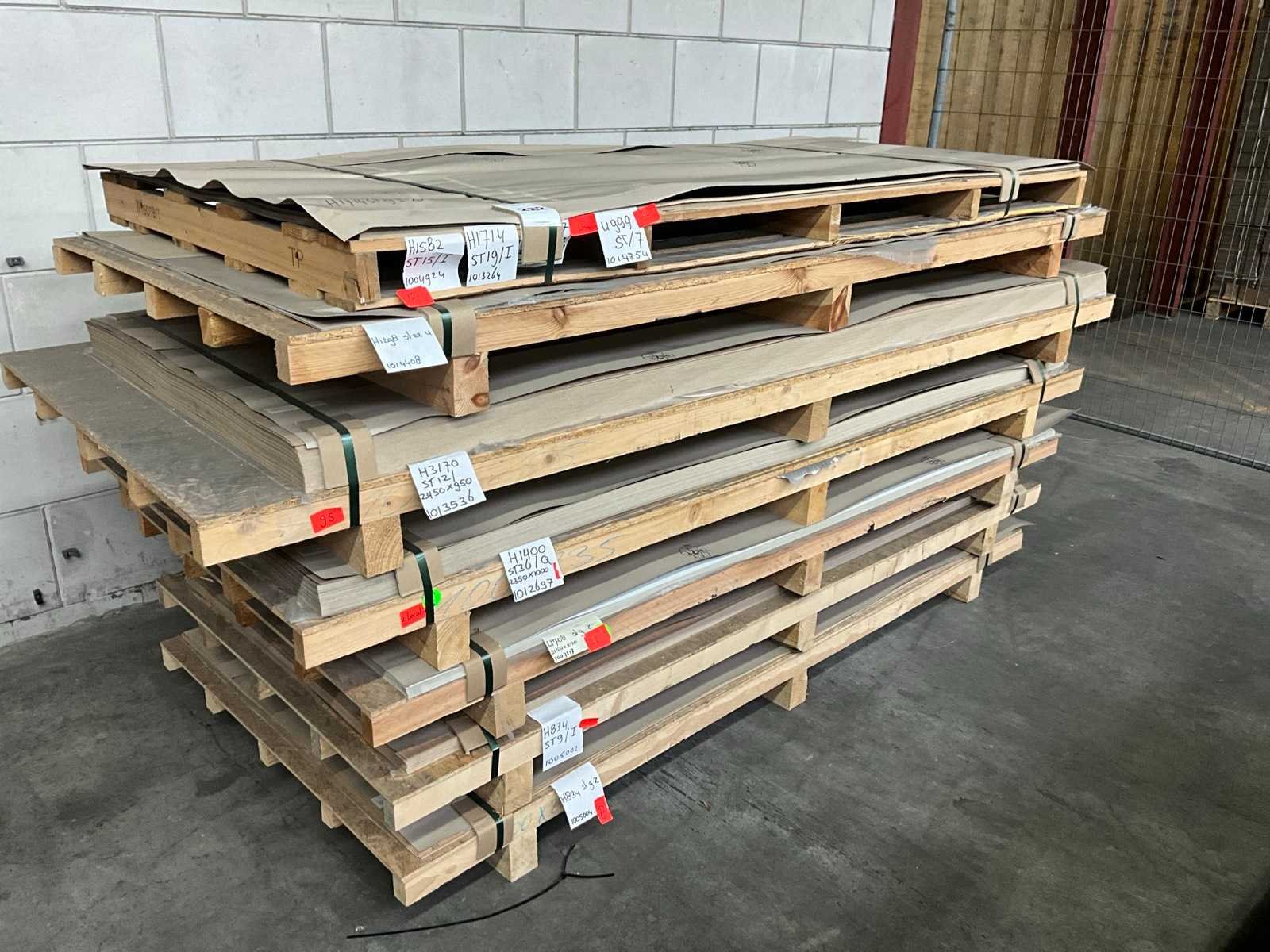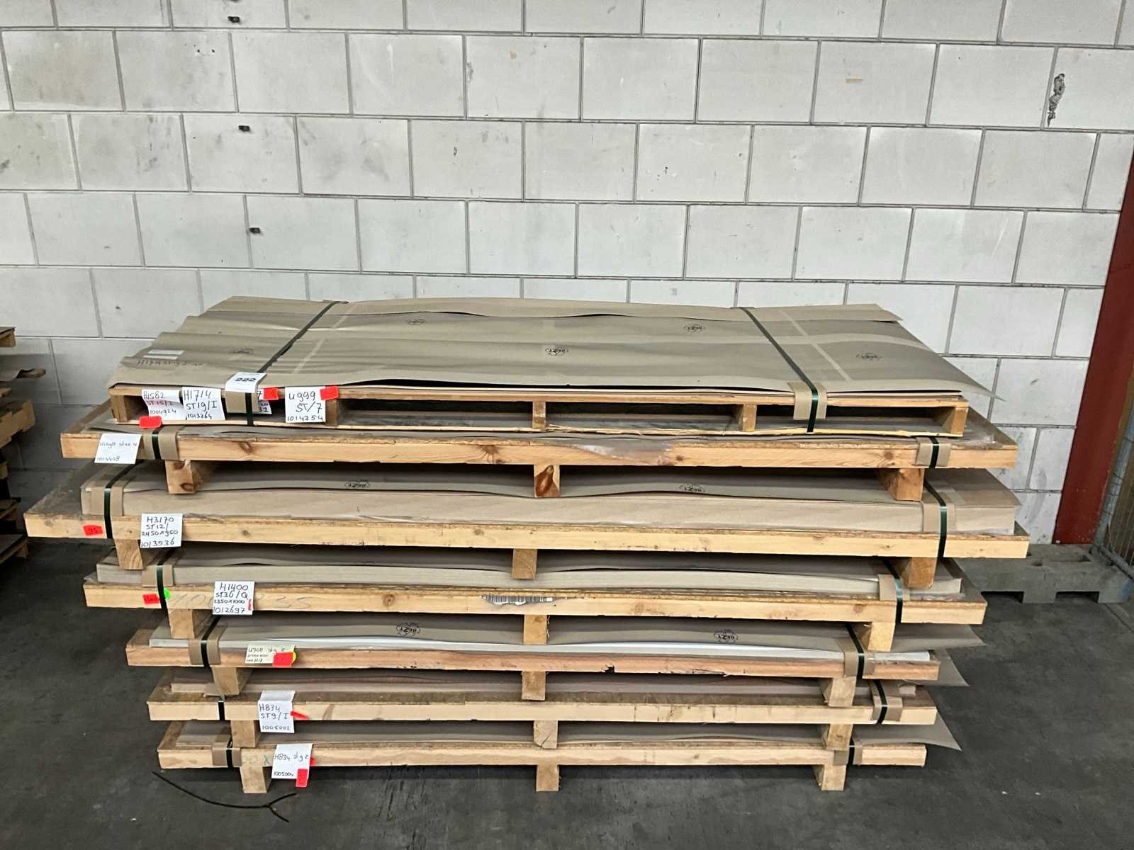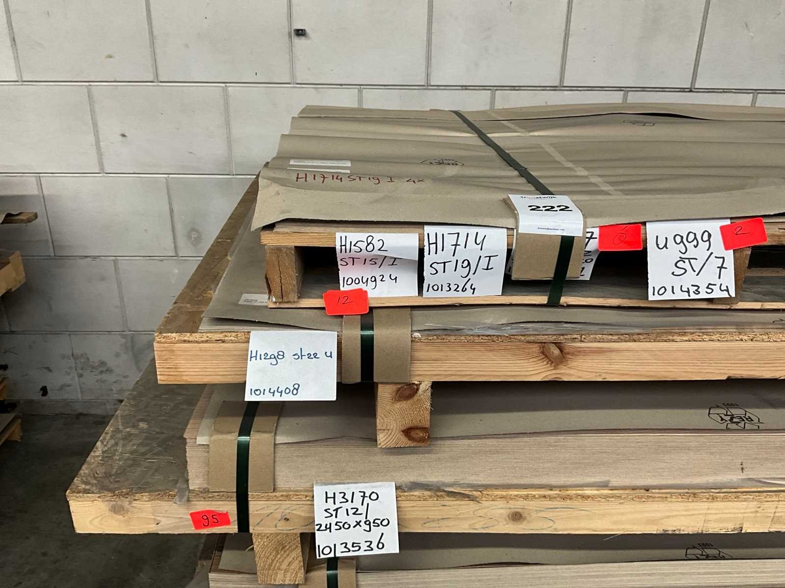 Waarvan de volgende formaten: 2150x1020x0.8mm, 2150x950x0.8mm, 2350x950x0.8mm, 2450x950mm, 2350x1000mm. Bestaande uit 7 pallets en diverse kleuren. Nee Merk: Egger