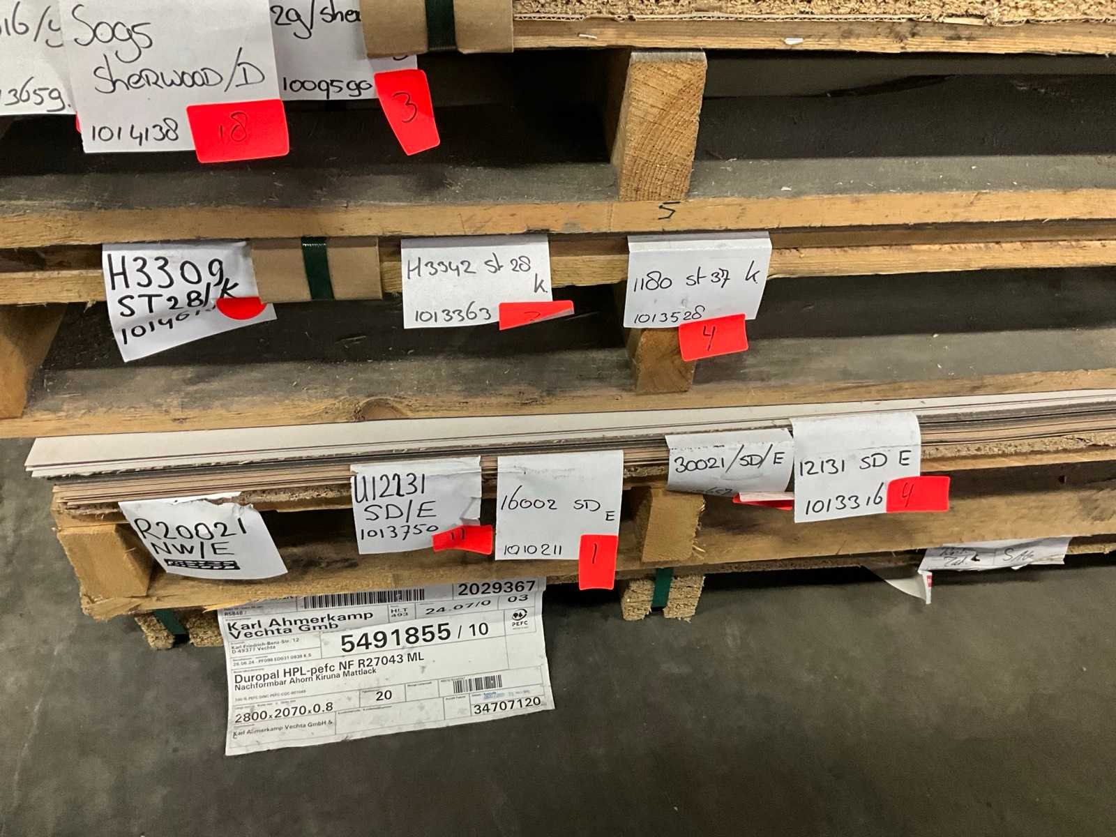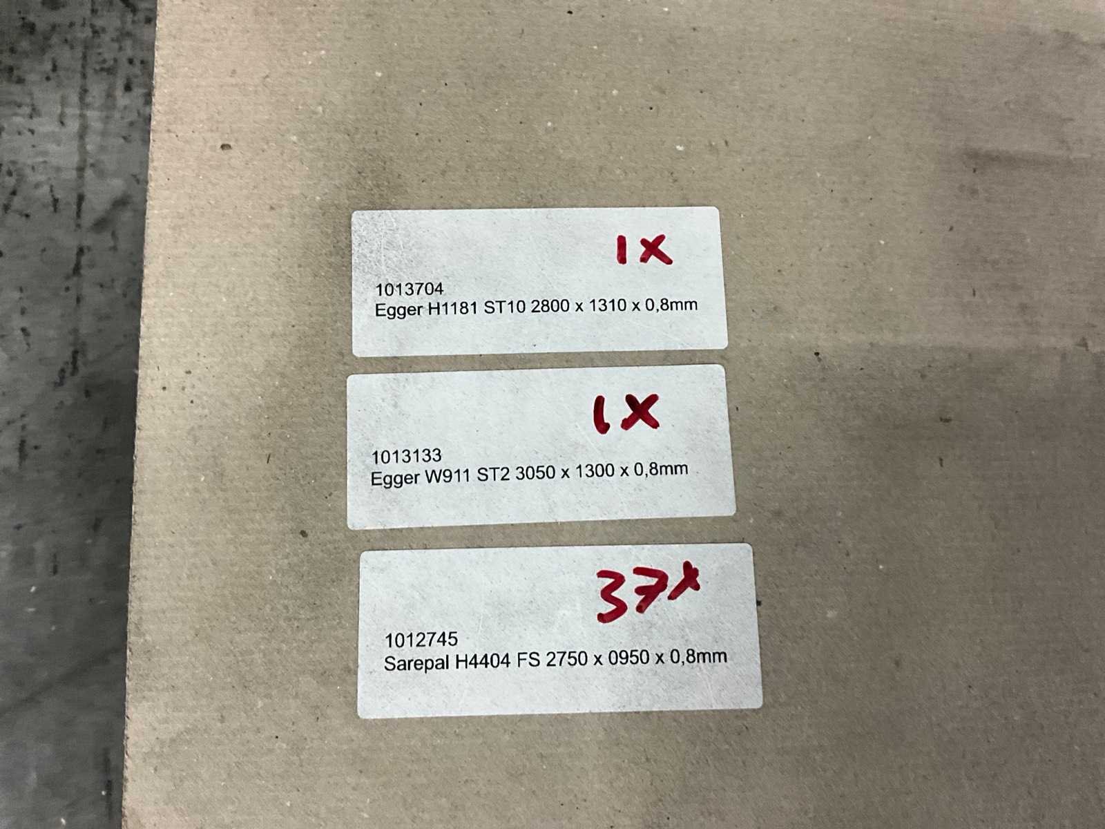 Waarvan de volgende formaten: 2800x1310x0.8mm, 2760x2040x0.9mm, 2800x2070x0.8mm. Bestaande uit 5 pallets en diverse kleuren. Nee Merk: Egger / Duropal / Decolegno