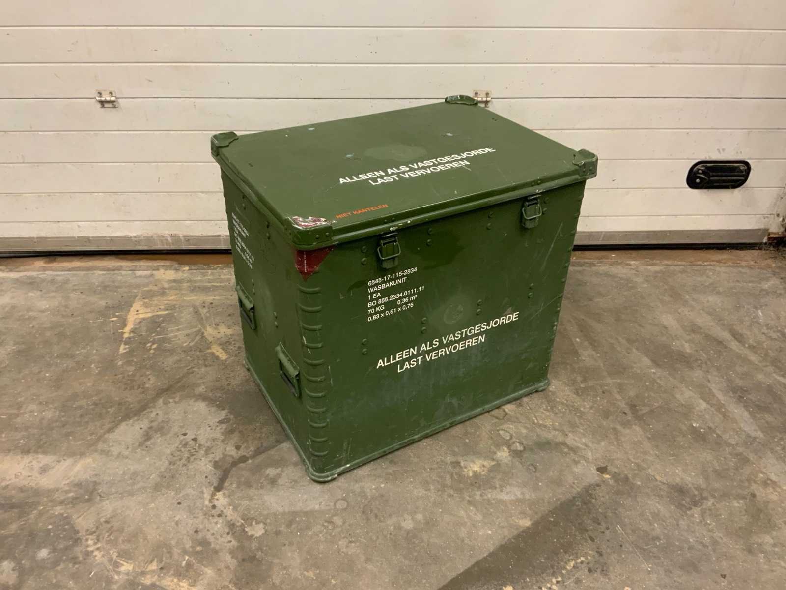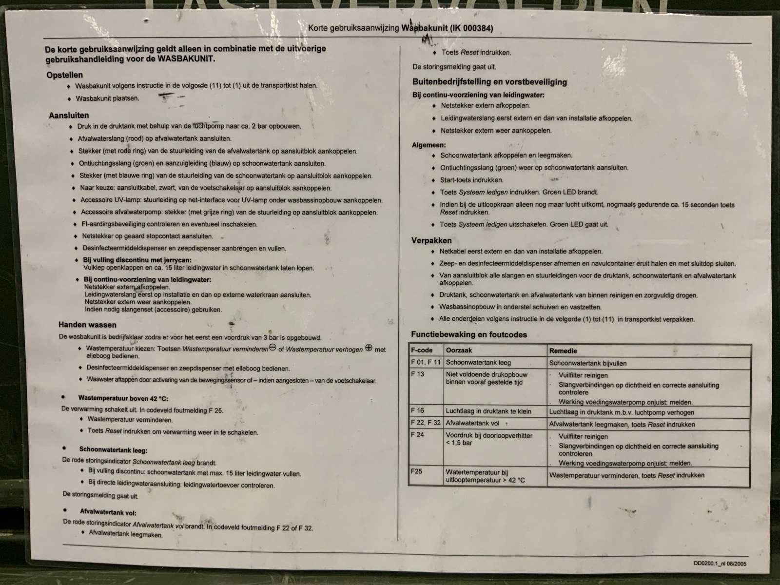 Wasbakunit in aluminium transportkist 83 x 61 x 76 cm ; met gebruiks aanwijzing en verpakkings instructie ; 230 volt ; bediening via sensor of voetpedaal ; 5 tasjes met o.a reservedelen Nee Merk: H+P Labortechnik AG Eigen gewicht: 70kg Totale afmeting L: 830mm Totale afmeting Breedte: 610mm Totale afmeting Hoogte: 760mm