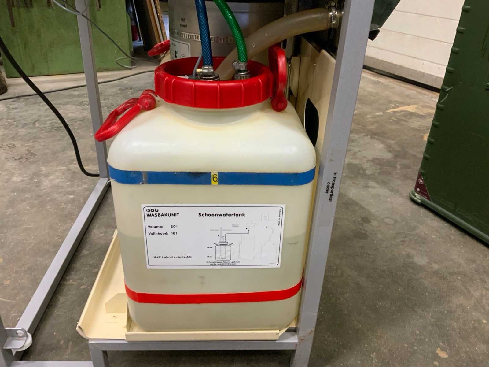 Wasbakunit in aluminium transportkist 83 x 61 x 76 cm ; met gebruiks aanwijzing en verpakkings instructie ; 230 volt ; bediening via sensor of voetpedaal ; 5 tasjes met o.a reservedelen Nee Merk: H+P Labortechnik AG Eigen gewicht: 70kg Totale afmeting L: 830mm Totale afmeting Breedte: 610mm Totale afmeting Hoogte: 760mm