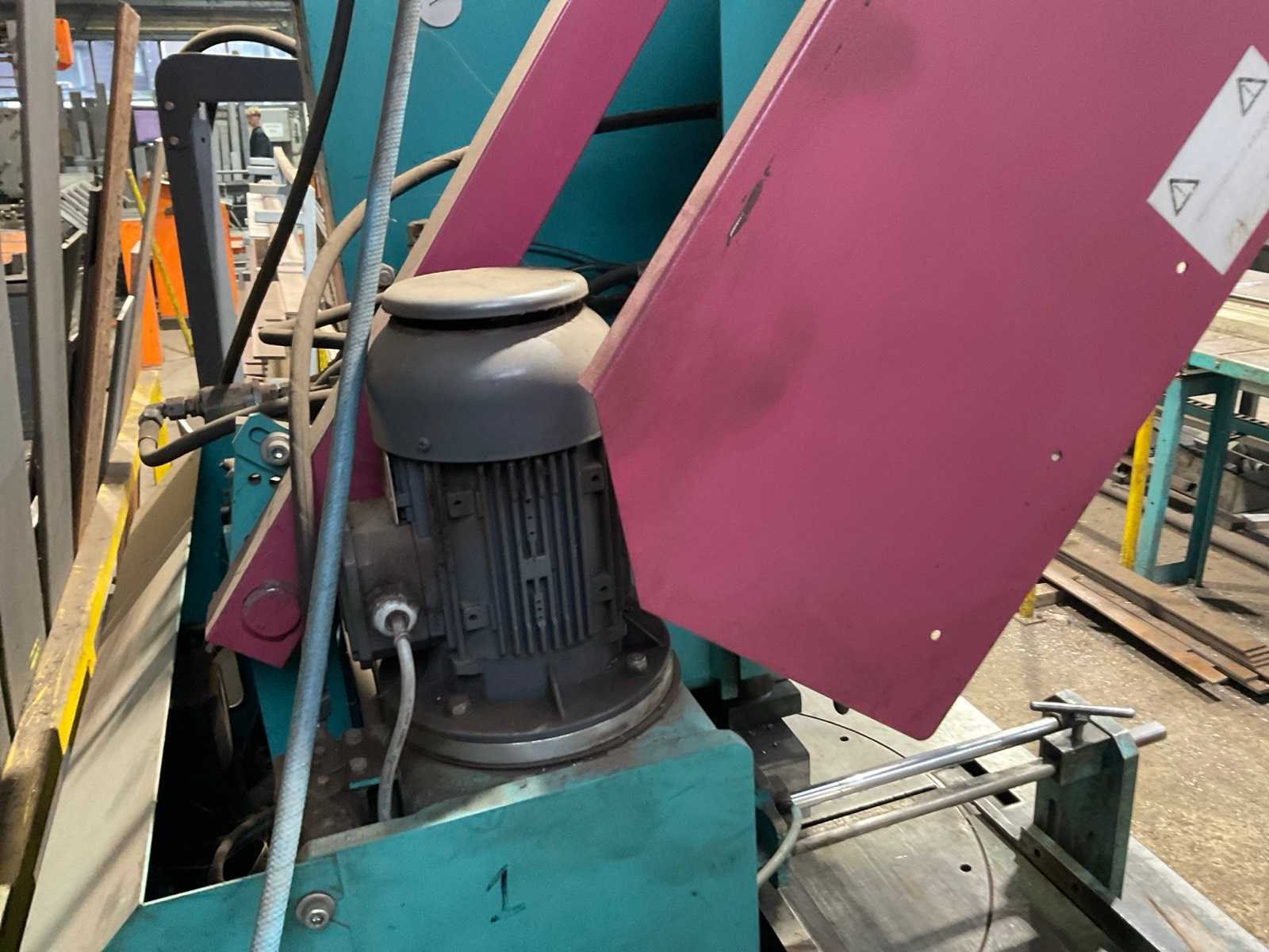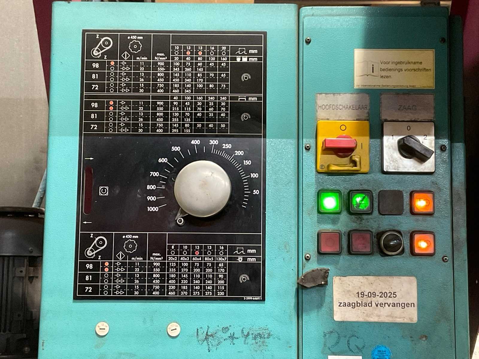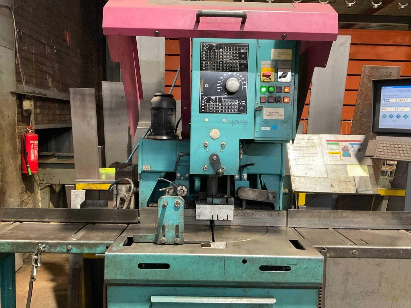 Zaagsnelheid bij Ø 400 mm 10/20m/min.; variabele snelheidsinstelling; v.v. aanvoertafel en automatische aanslag; lengte ca. 8000 mm; met digitale besturing; handboek aanwezig Nee Merk: Kaltenbach Type: KKS 450 E Zaagblad Ø: 450 Snelheid van n =: 0rpm Snelheid tot n =: 1000rpm Motorvermogen (kW): 2.6kW Aansluiting: 400V Machinegewicht: 950kg Afmeting l: 1020mm Afmeting b: 1150mm Afmeting h: 2000mm
