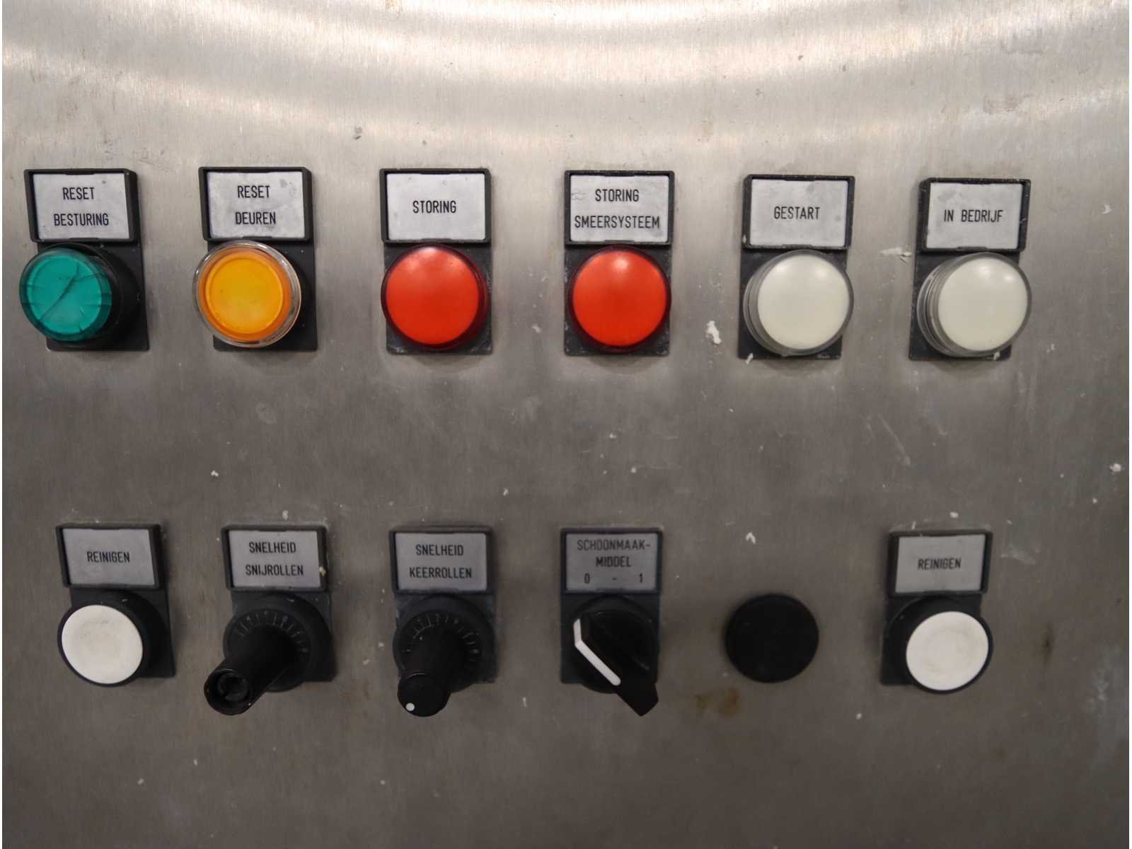 Werkbreedte 1200 mm, voorzien van opgebouwde invoer transportband, onderlopende uitvoer transportband en besturingskast met regelbare snijrollen snelheid Nee Merk: Finis Type: F.R.P.S.8 Bouwjaar: 2002 Aansluiting: 400V Totale afmeting L: 2900mm Totale afmeting Breedte: 1950mm Totale afmeting Hoogte: 2500mm