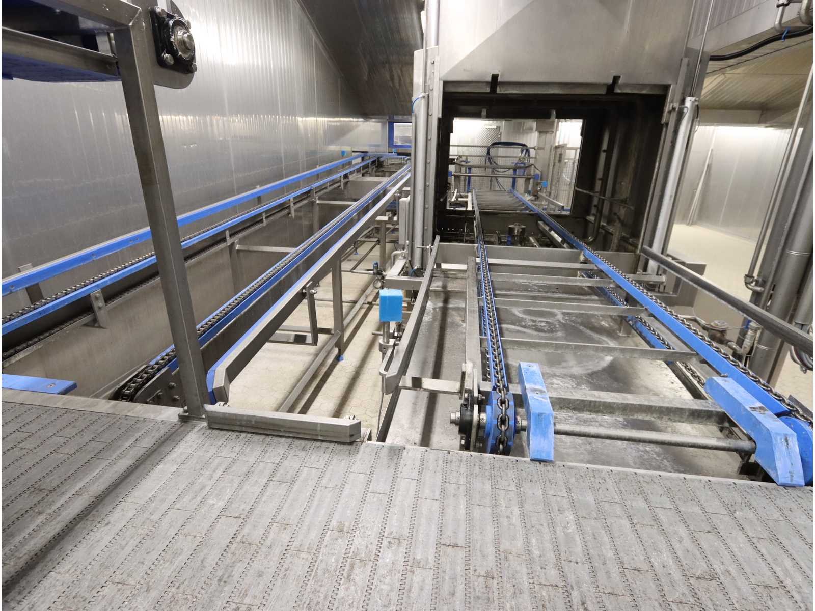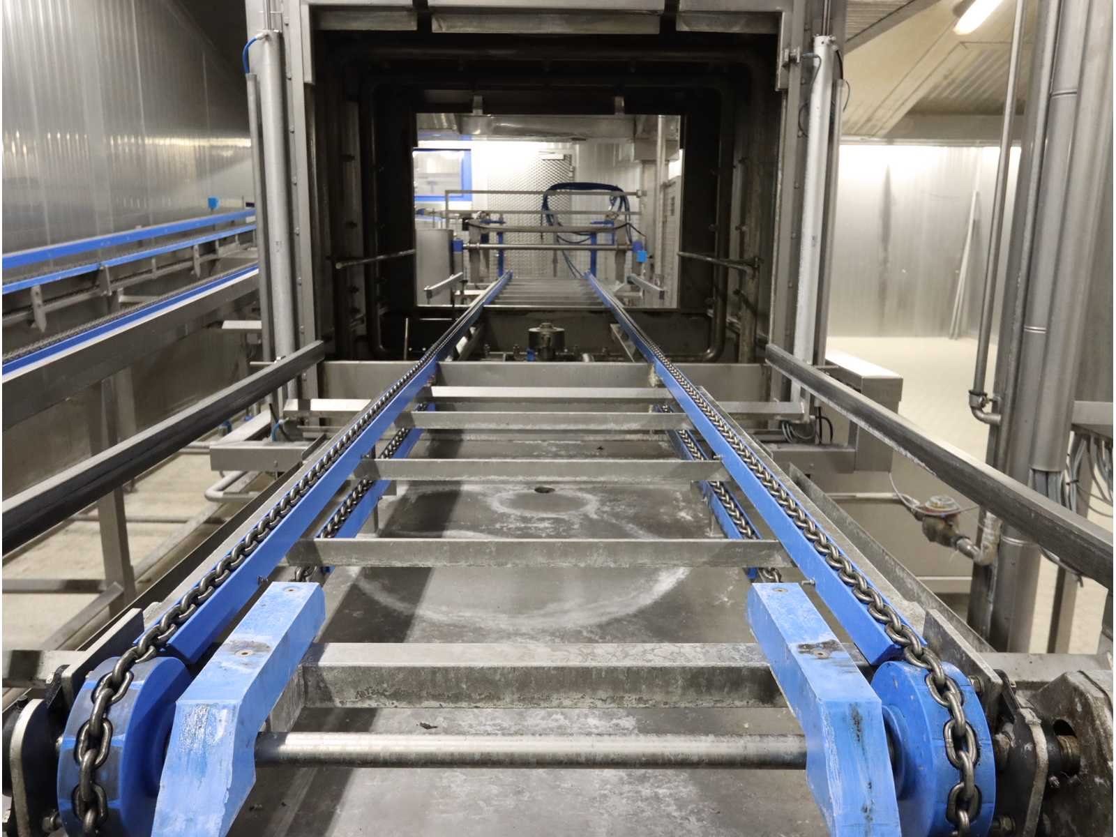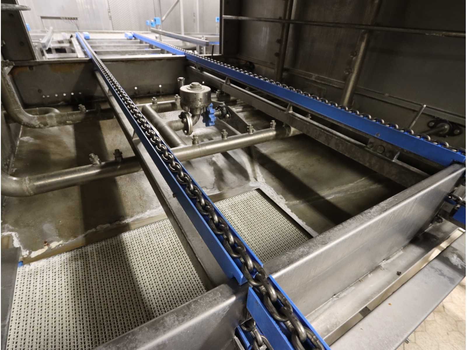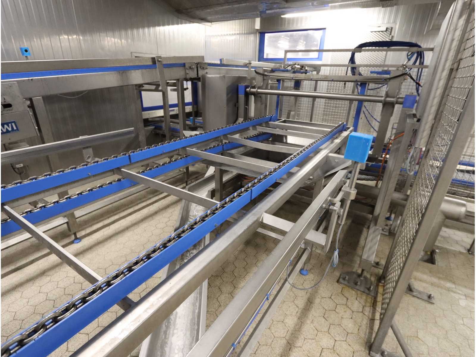 Bestaande uit: wasmachine met chemiedosering, doorvoer afmeting 1350x900 mm, ketting doorvoer transportbaan lengte 7750cmm, invoer kantel inrichting, ketting transportbaan, lengte 9800, schuingestelde lengte 7500 mm, transportbaan, lengte 7500 mm, uitvoer kantel inrichting, en 2 spoors uitvoer transportbaan, lengte 10500 mm, transport lift, bakken en snelloopdeuren niet inbegrepen Nee Merk: Nawi Bouwjaar: 2009 Serienummer: 200923 Aansluiting: 400V