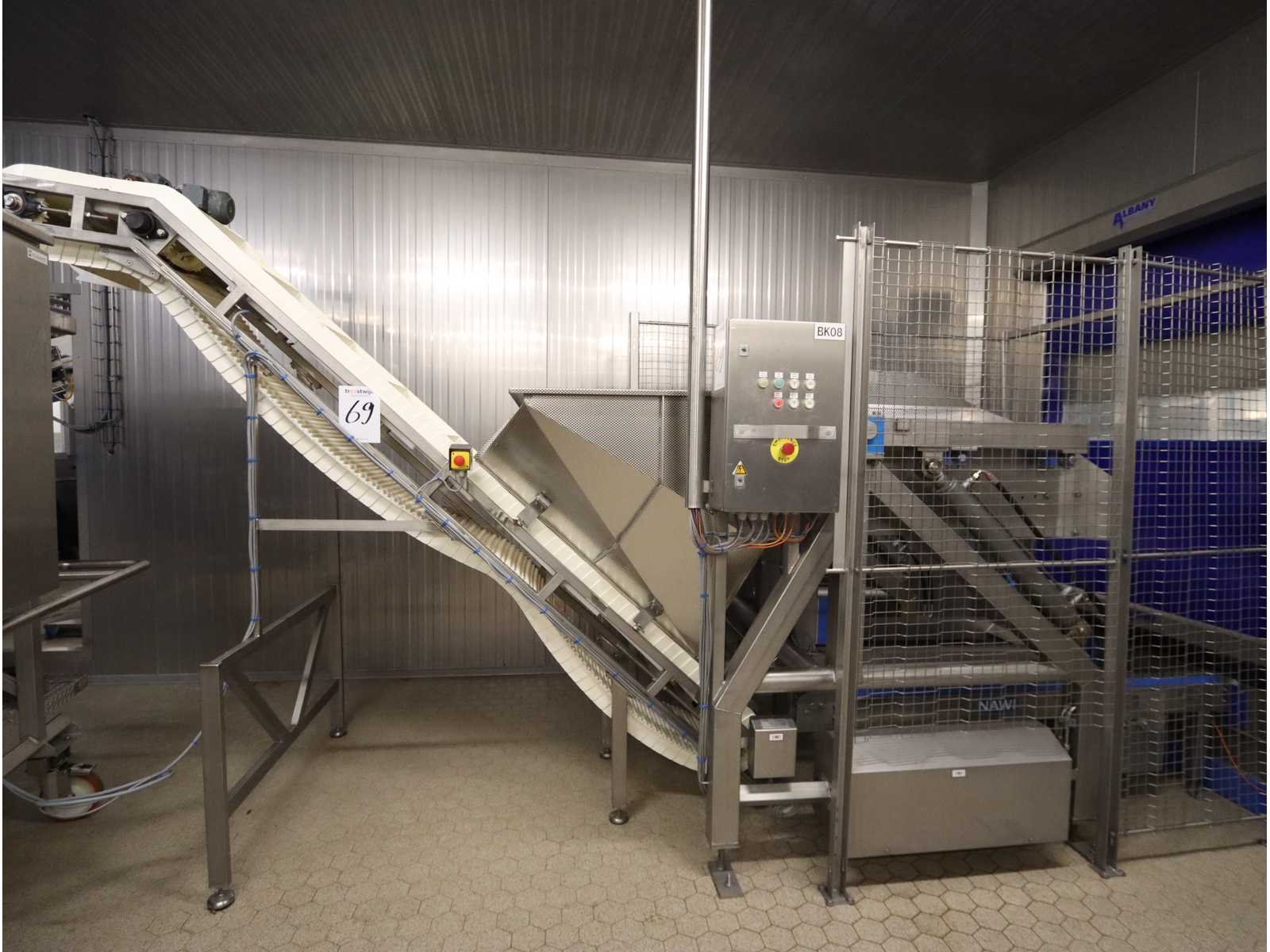 Voorzien van invoer ketting transportbaan, spoorbreedte 850 mm, lengte 2000 mm, inclusief opvoer transportband, breedte 430 mm, lengte 3700 mm, uitvoer hoogte 2250 mm, invoer opening bunker circa 1100x1100mm, zonder bordes en trappen Nee Merk: Nawi Bouwjaar: 2008