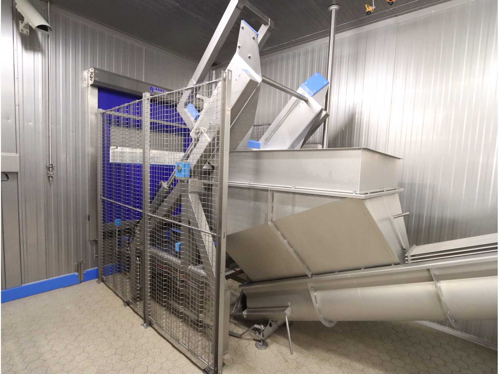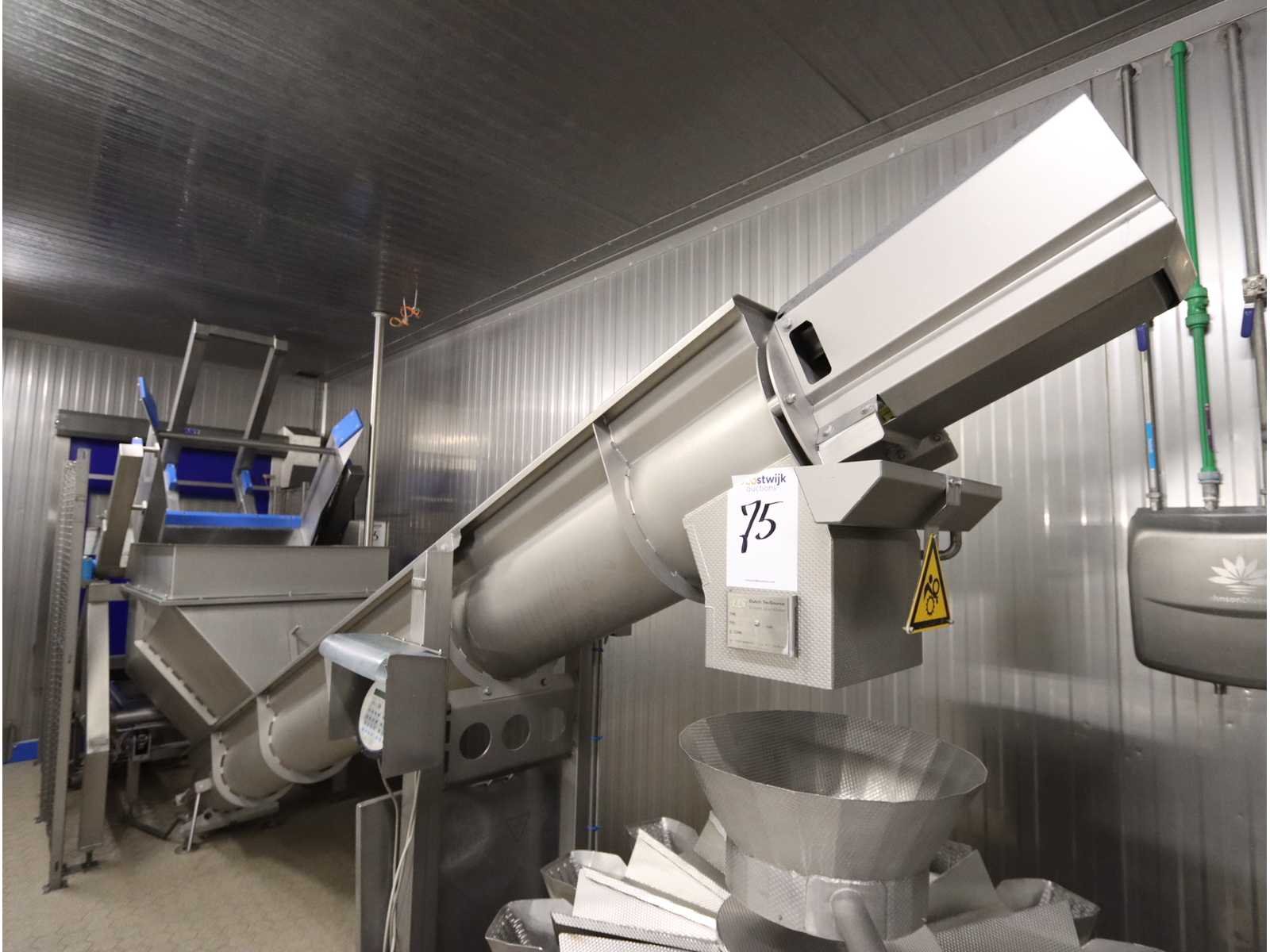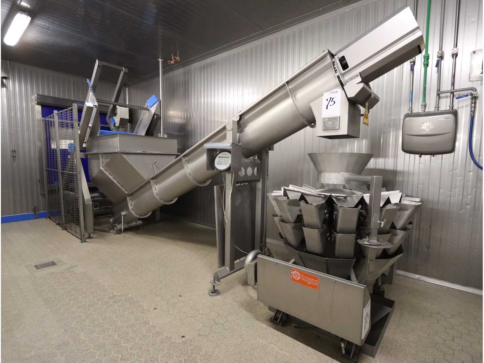 Bestaande uit: bakken kantelaar met invoer ketting transportbaan, spoorbreedte 850 mm, lengte 2000 mm, inclusief opvoer transportschroef met stortbunker, schroef Ø 400 mm, schroef lengte 4500 mm, uitvoer hoogte 1560 mm, invoer opening bunker circa 1100x1300 mm, “Bilwinco” multihead weger, type BW114W ,14 kops, weegbereik 10-1000 gram, vloer doorvoer niet inbegrepen Nee Merk: Nawi/Bilwinco