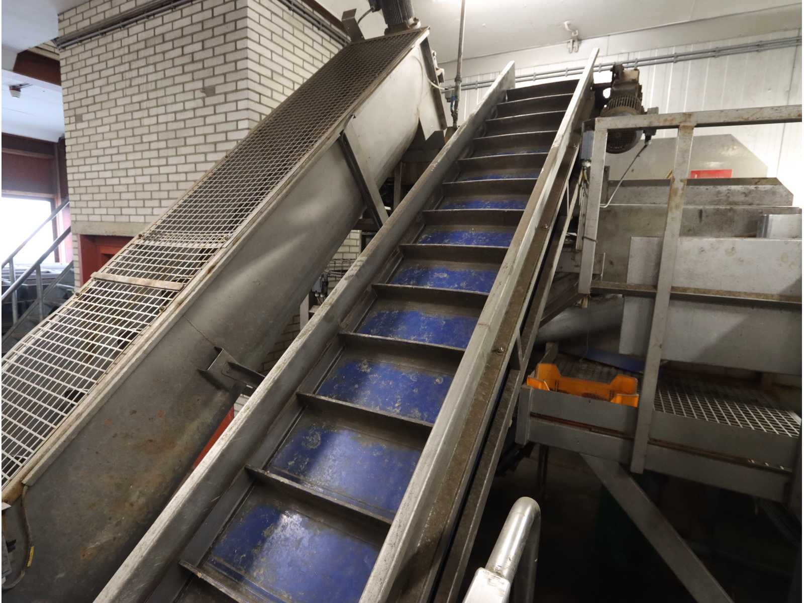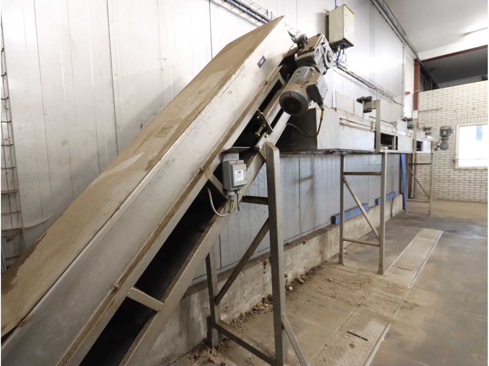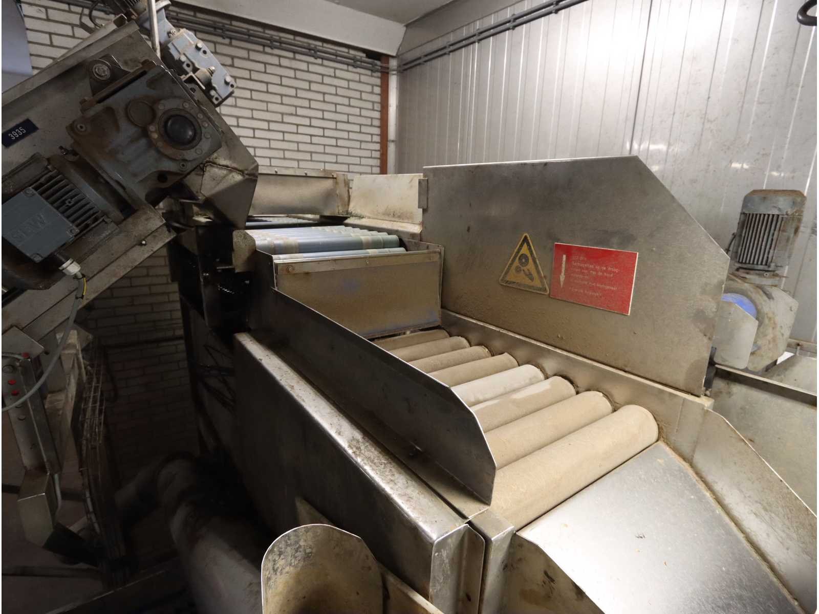 Bestaande uit: opvoer transportschroef, opvoer transportband, rollen sorteerlijn, 10 voudige zeef sorteer lijn, bakken kantel inrichting, geheel voorzien van diverse transportbanden en centrale besturing, gebruikte vloer oppervlakte 9000x13500 mm Nee