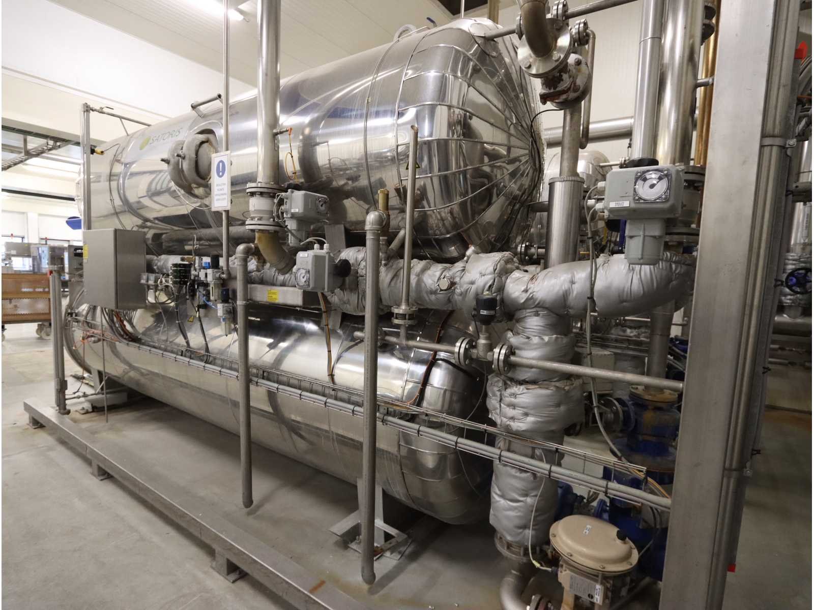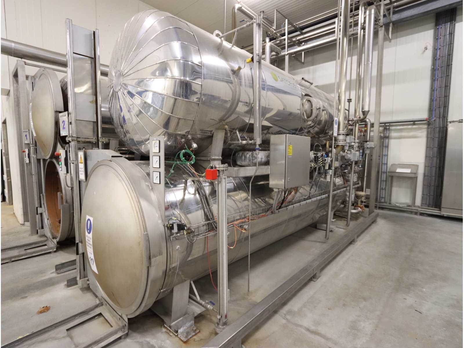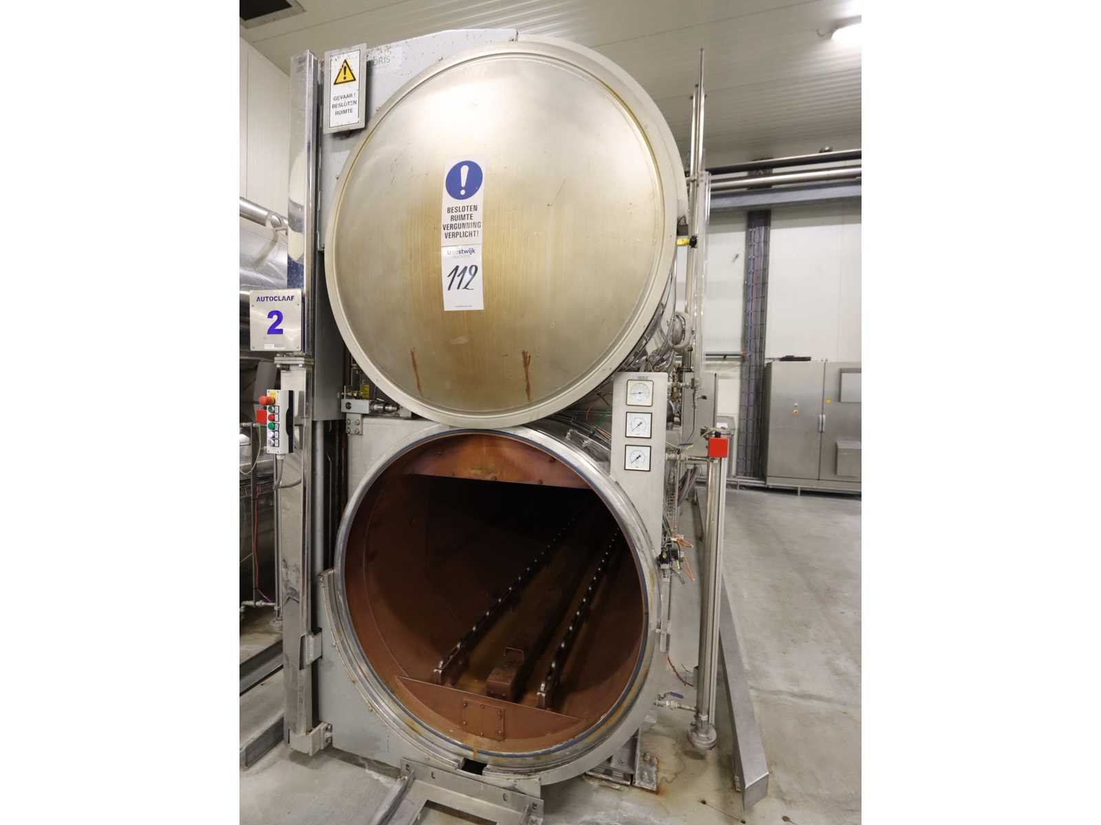 Geschikt voor krat afmeting 810x810 mm, Voorzien 1x buffer tank (5700 liter) en autoclaaf tank (6000 liter), tank afmeting Ø 1400 mm, lengte 4750 mm, liftdeur, diverse pompen en besturingskast, inclusief 15 kratten Nee Merk: Satoris Type: SAZ-1300-5-HV-VA Bouwjaar: 2006 Serienummer: 64739 Inhoud: 11700l Sterilisatietemperatuur: 165°c Aansluiting: 400V