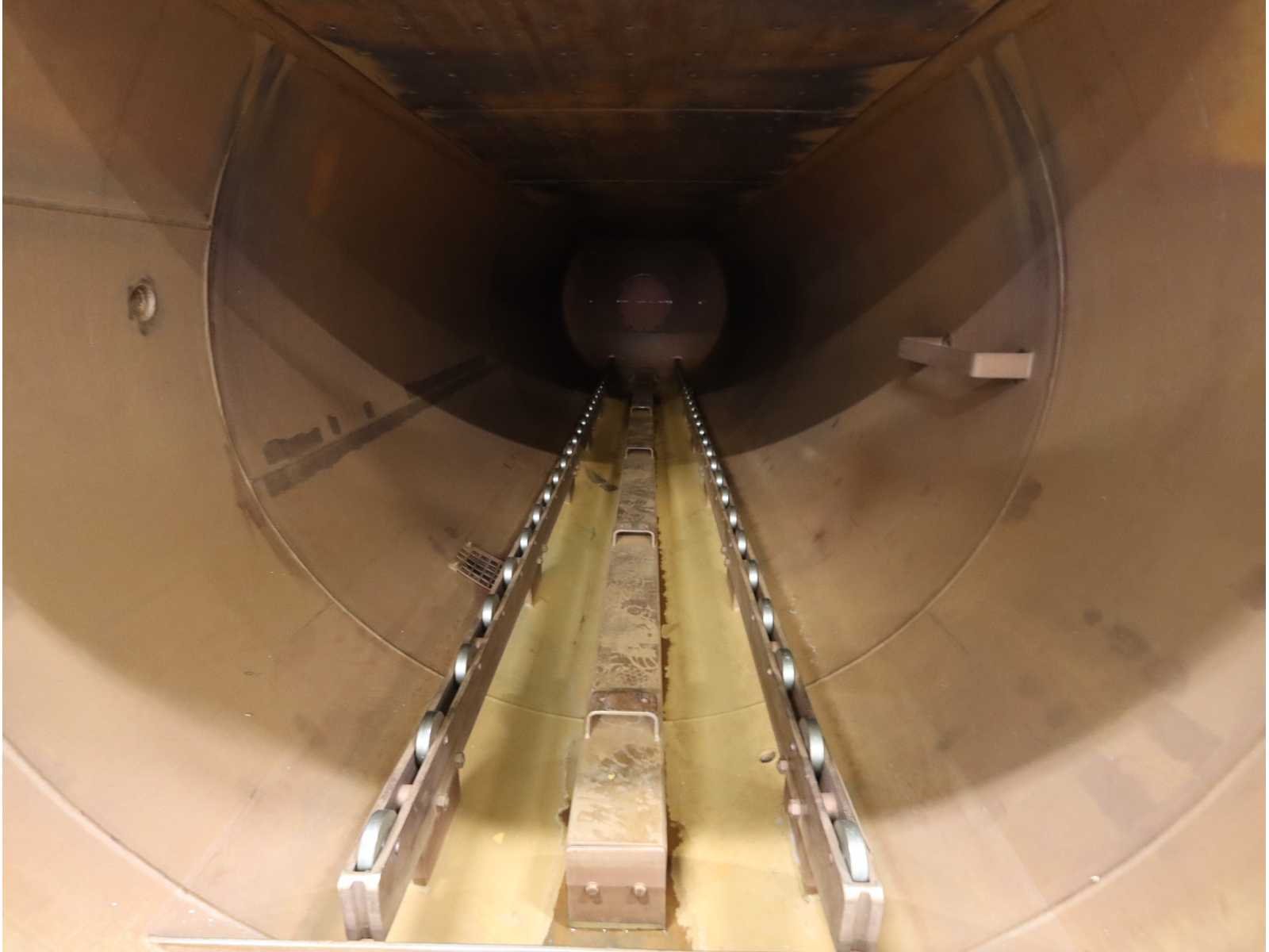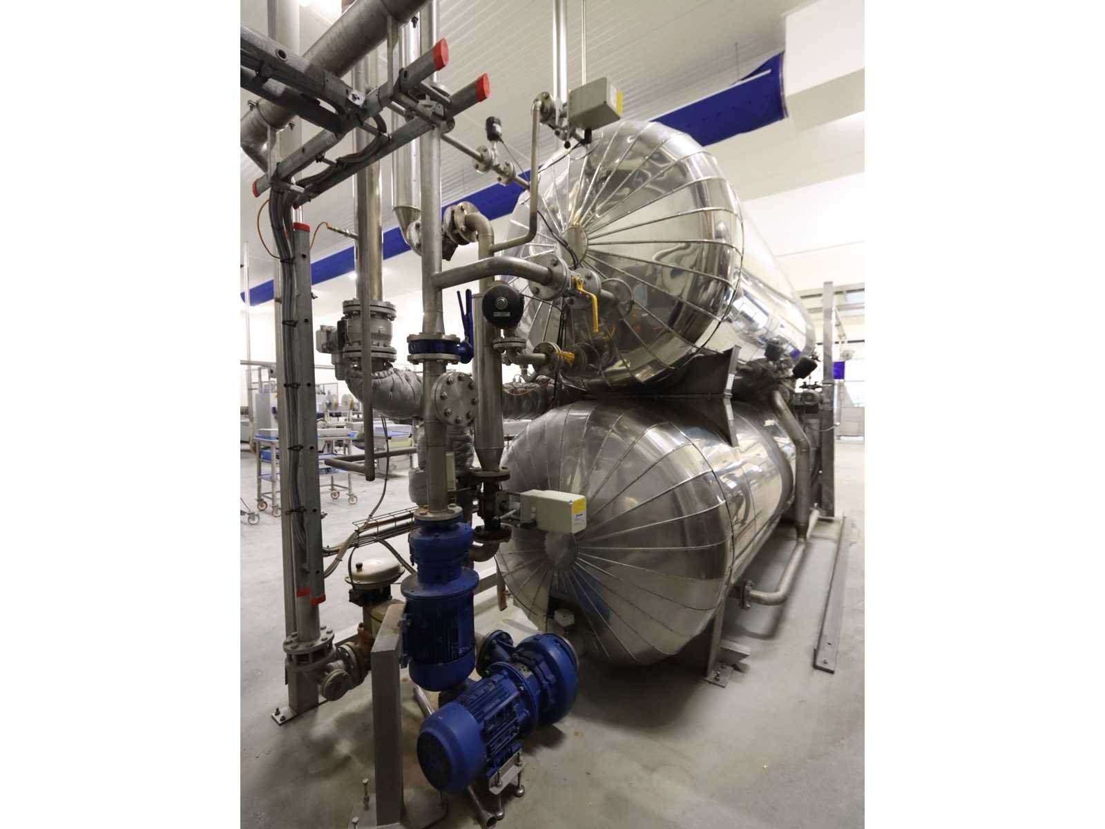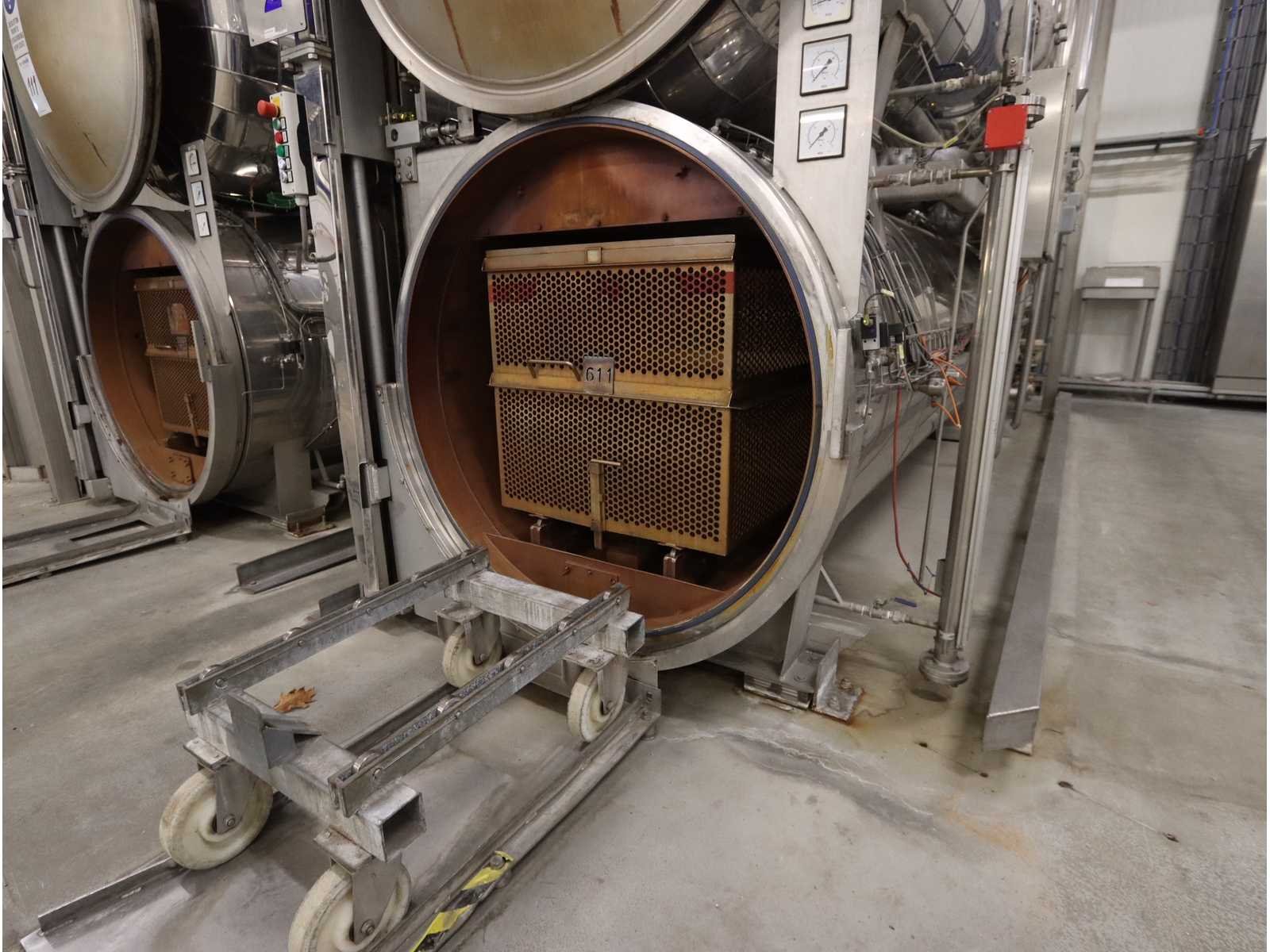 Geschikt voor krat afmeting 810x810 mm, Voorzien 1x buffer tank (5700 liter) en autoclaaf tank (6000 liter), tank afmeting Ø 1400 mm, lengte 4750 mm, liftdeur, diverse pompen en besturingskast, inclusief 15 kratten Nee Merk: Satoris Type: SAZ-1300-5-HV-VA Bouwjaar: 2006 Serienummer: 64739 Inhoud: 11700l Sterilisatietemperatuur: 165°c Aansluiting: 400V