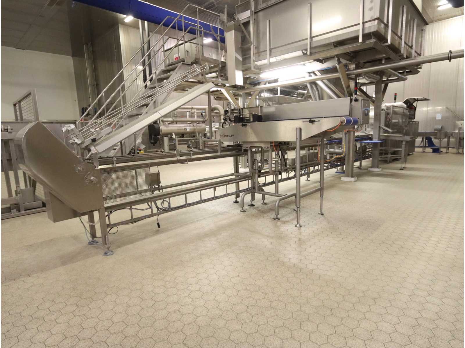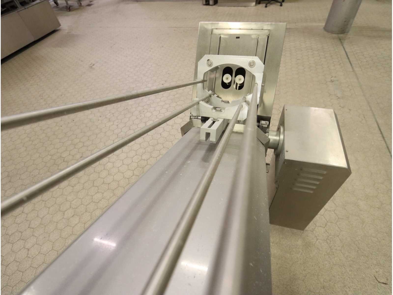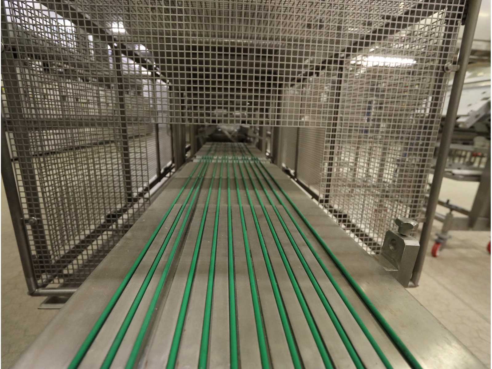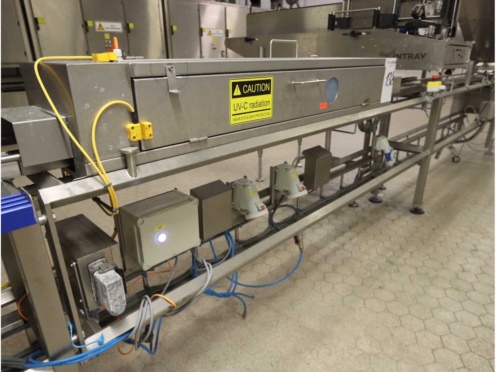 Voorzien van RVS ketting invoer transport met meenemers, bufferstation, tray invoerunit, UV-C desinfectie unit, uitwerp station, digitale uitlezing Nee Merk: G. Mondini Type: E 365 T Bouwjaar: 2008 Transportband: true Transportband afm. b: 300mm Aansluiting: 400V