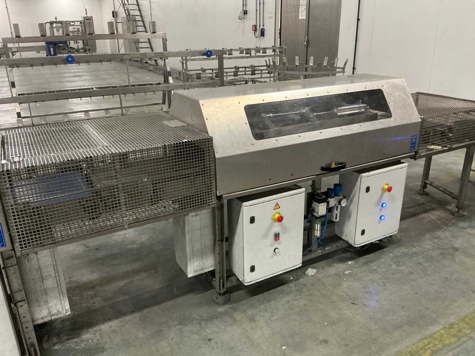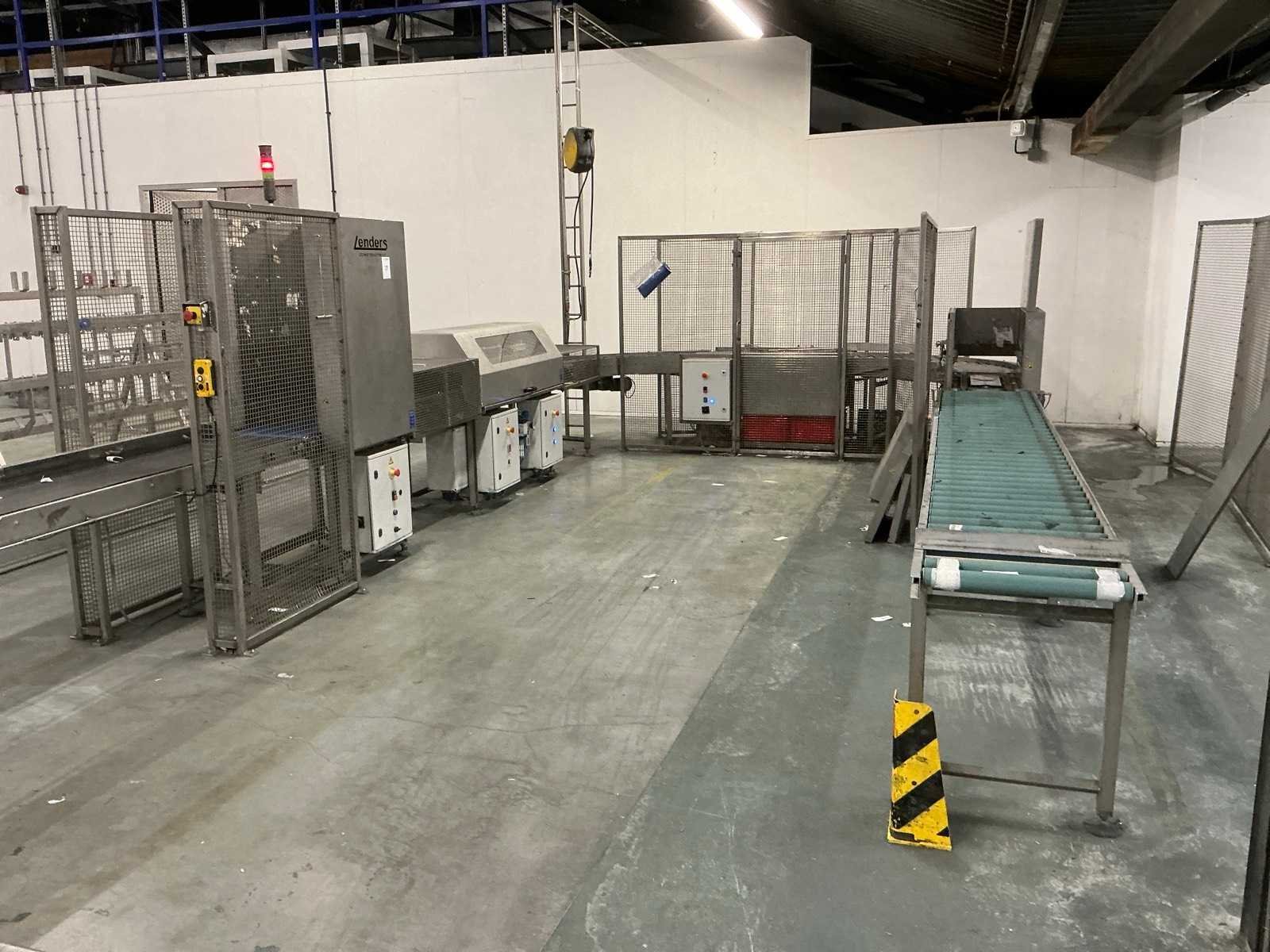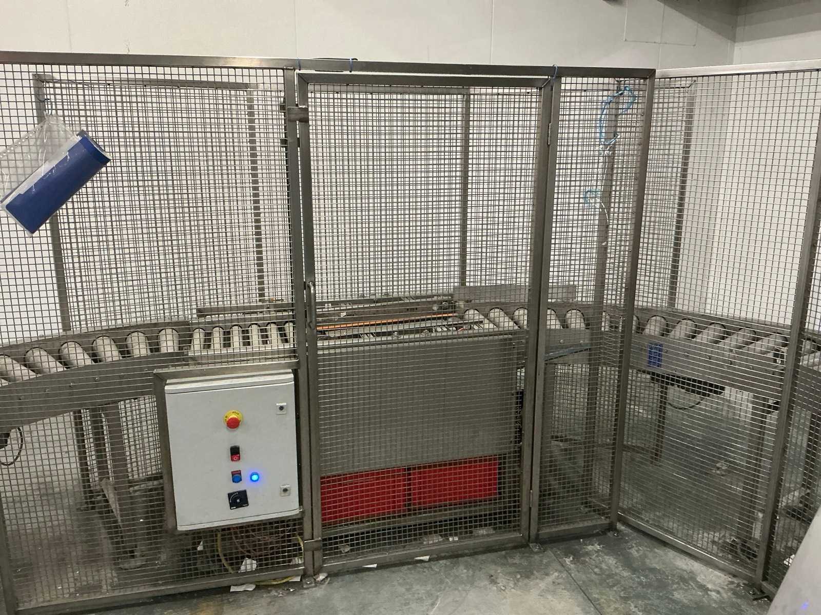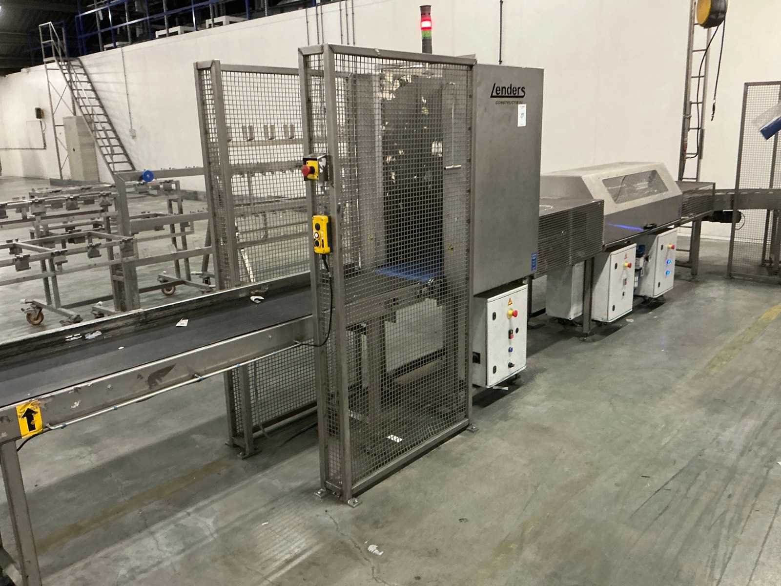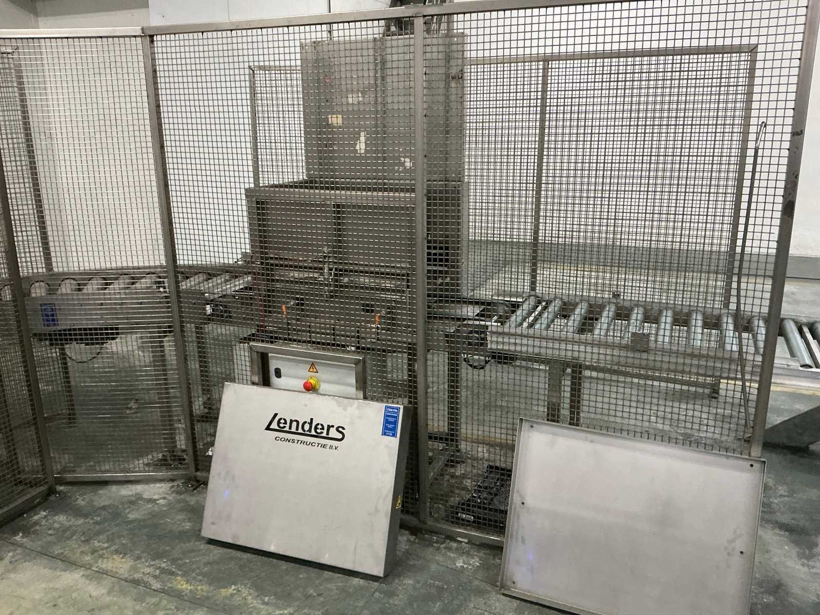 Bestaande uit: heftafel, kratten ontstapel unit, kratten uitvouwmachine, kratten stapelaar, doorlopende rollen transportband, breedte 450 mm, inclusief divers veiligheid hekwerk, gebruikte vloer oppervlakte 9000x4000 mm Nee Merk: Lenders Aansluiting: 400V