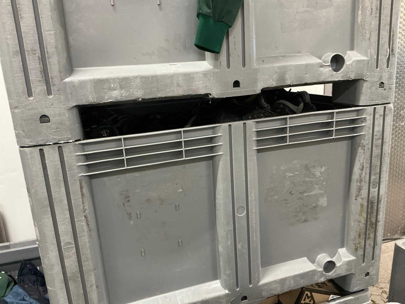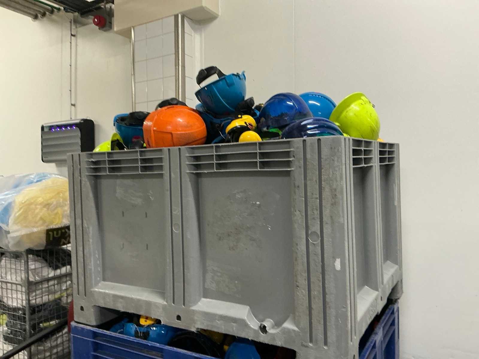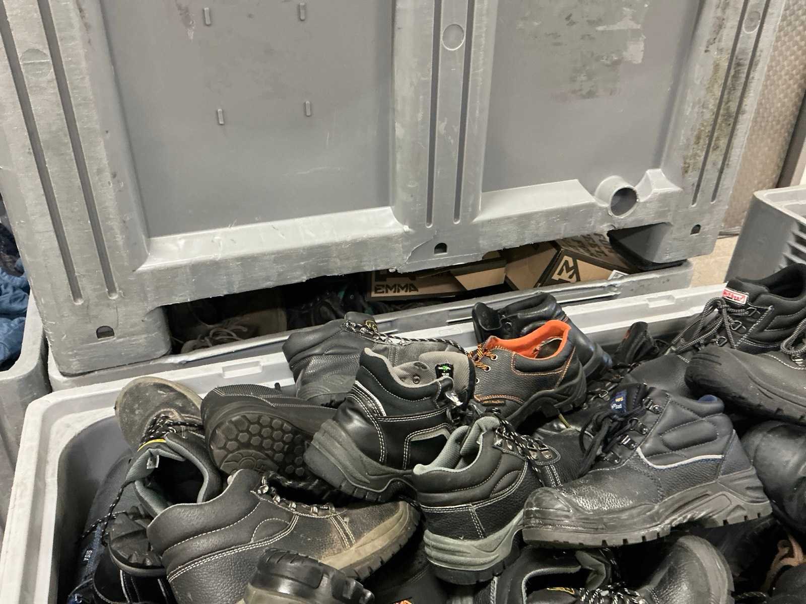 Waaronder schoenen, in diverse maten, veiligheidshelmen, laarzen, en diverse jassen, in 9 kunststof boxen Nee