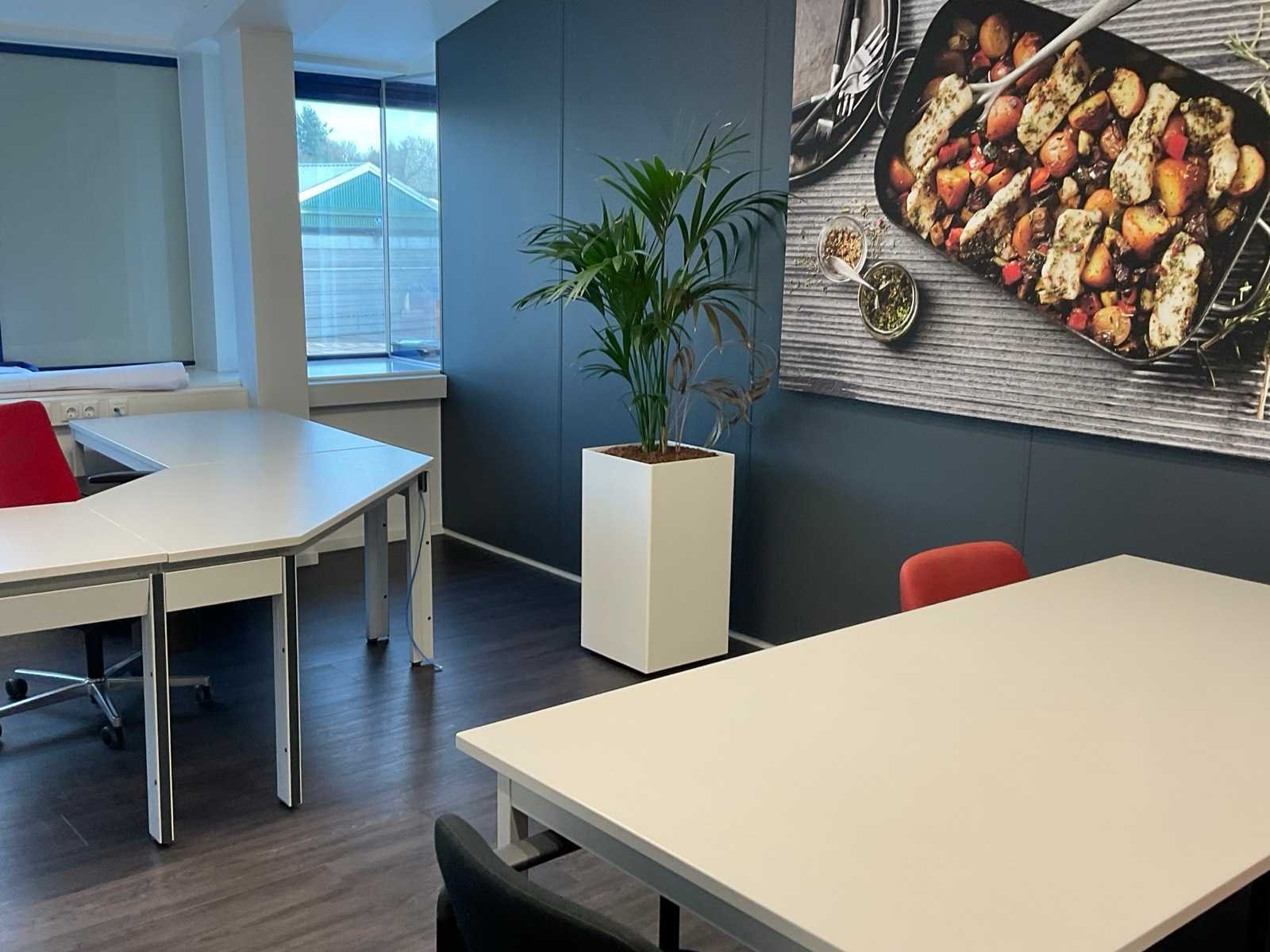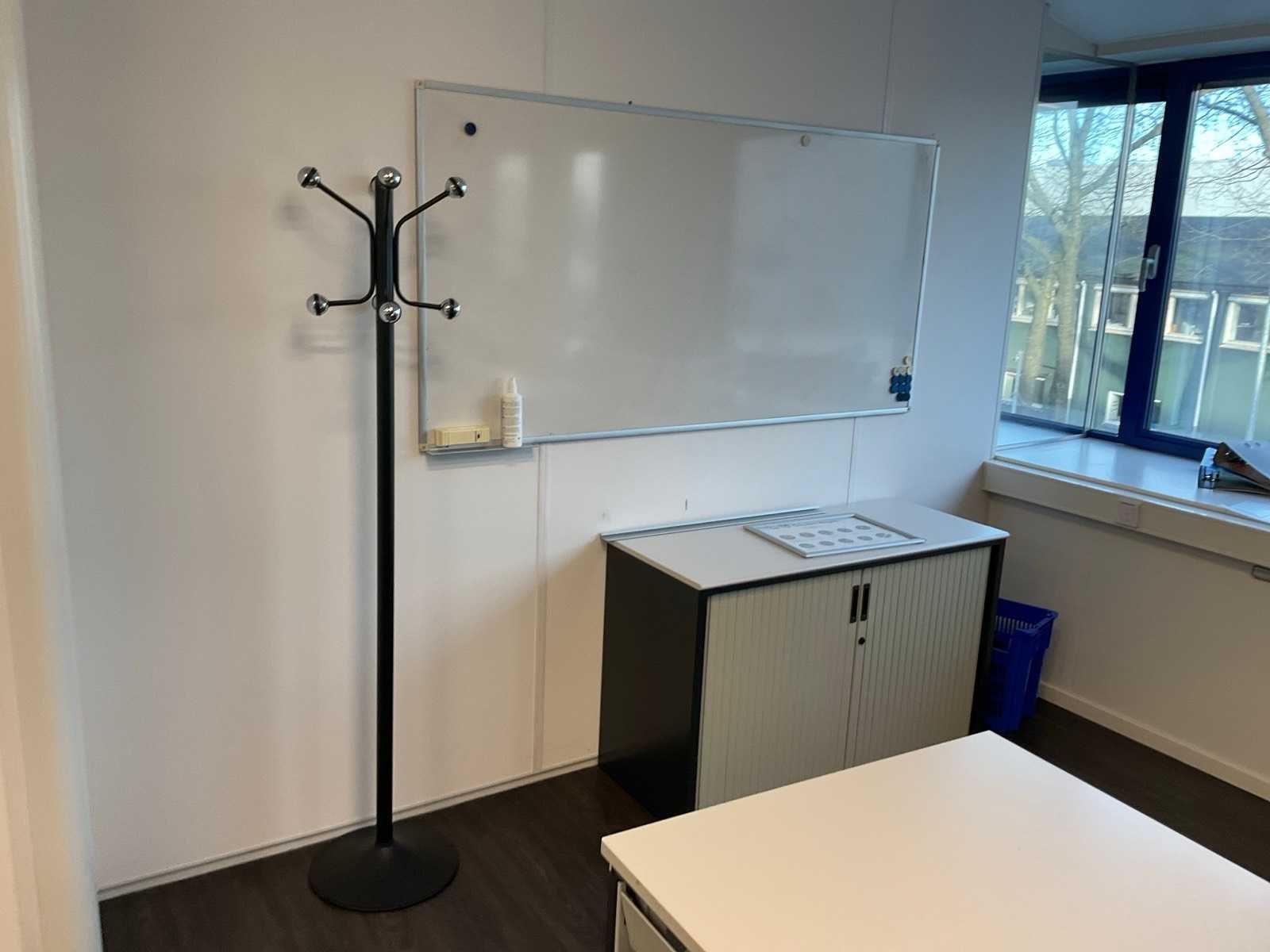W.o. hoekbureau; vergadertafel met stoelen; plantenbak; porte-manteau en whiteboard Nee