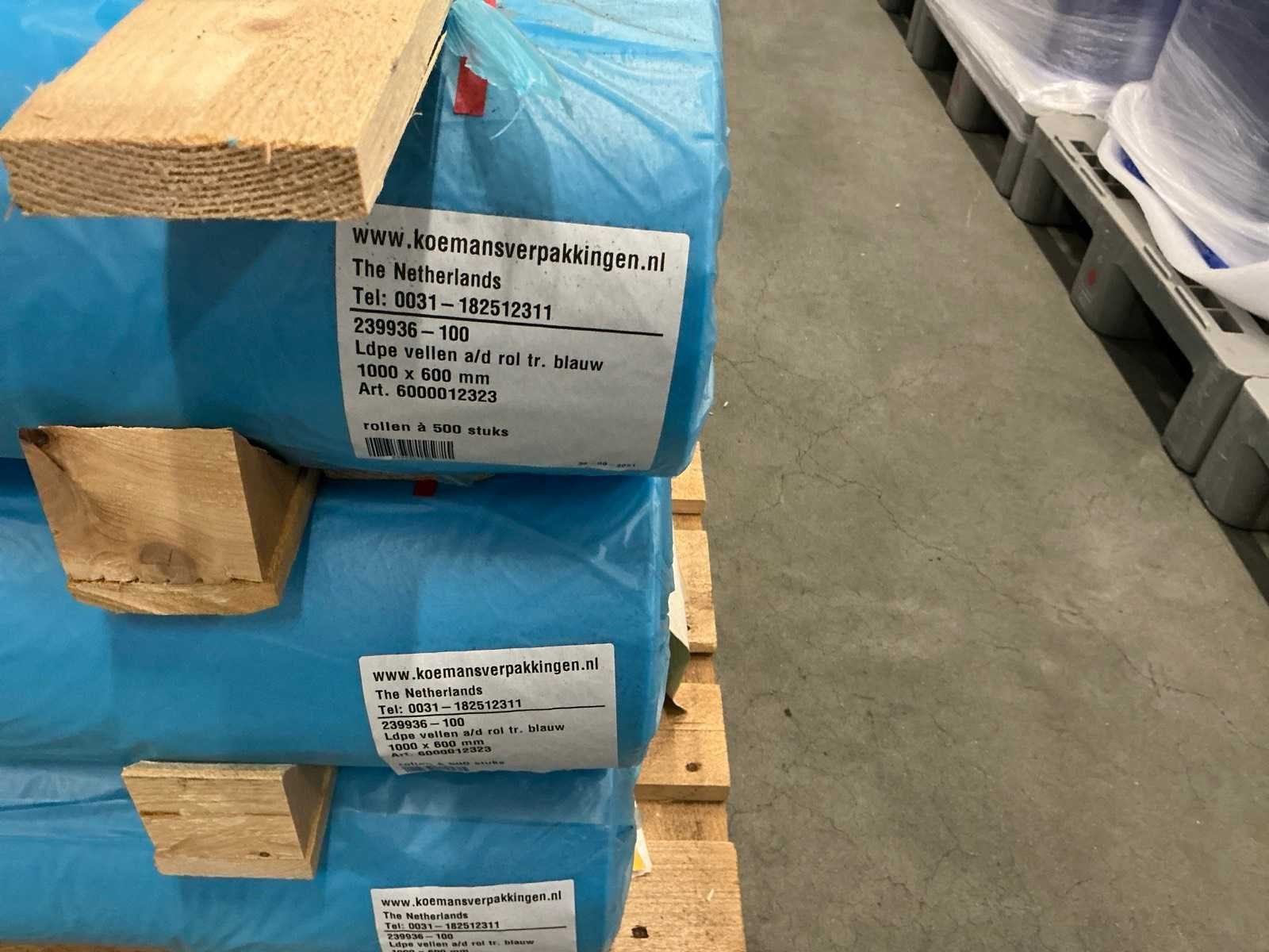 Transparant/ blauw, afmeting 1000x600, rol á 500 stuks, circa 36 rollen, op 2 pallets Nee