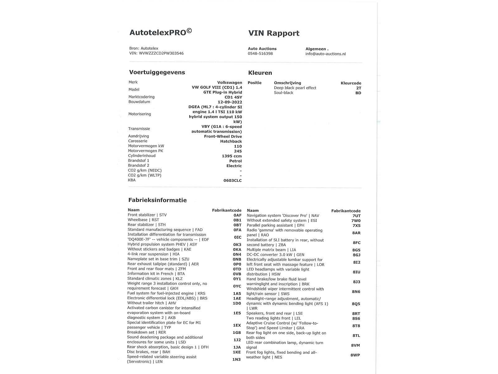 Franse kenteken papieren. Indien gewenst kunnen wij het gehele import proces voor u verzorgen, RDW invoer, BPM taxatie, Douane afwikkeling, stalling etc. Voor deze auto zijn de totale invoerkosten inclusief de BPM €1.195.- Dus voor €1.195.- boven op uw aankoopprijs verzorgen wij het NL kenteken voor u. (This option is only for Dutch buyers) Voor vragen kunt u mailen naar info@auto-auctions.nl No Kenteken: Franse Kenteken Papieren Merk: Volkswagen Model: Golf Type: 1.4 eHybrid PHEV Afgelezen kilometerstand: 127662km Cilinderinhoud: 1395cc Vermogen (kW): 150kW Brandstof: Hybride Benzine Chassisnummer: WVWZZZCD2PW303546 Datum eerste toelating: 09-09-2023 Vermogen (pk): 204hp Aantal zitplaatsen: 5 Kleur: Deep Black Pearl Effect Transmissie: Automaat Aantal deuren: 5 Aantal sleutels: 2 Velgmaat: 17 Aantal cilinders: 4 Carrosserie: Hatchback Nationaliteit documenten: Franse Kenteken Papieren Onderhoudshistorie: Digitaal Start en rijdt: Ja oplaadkabel : Aanwezig