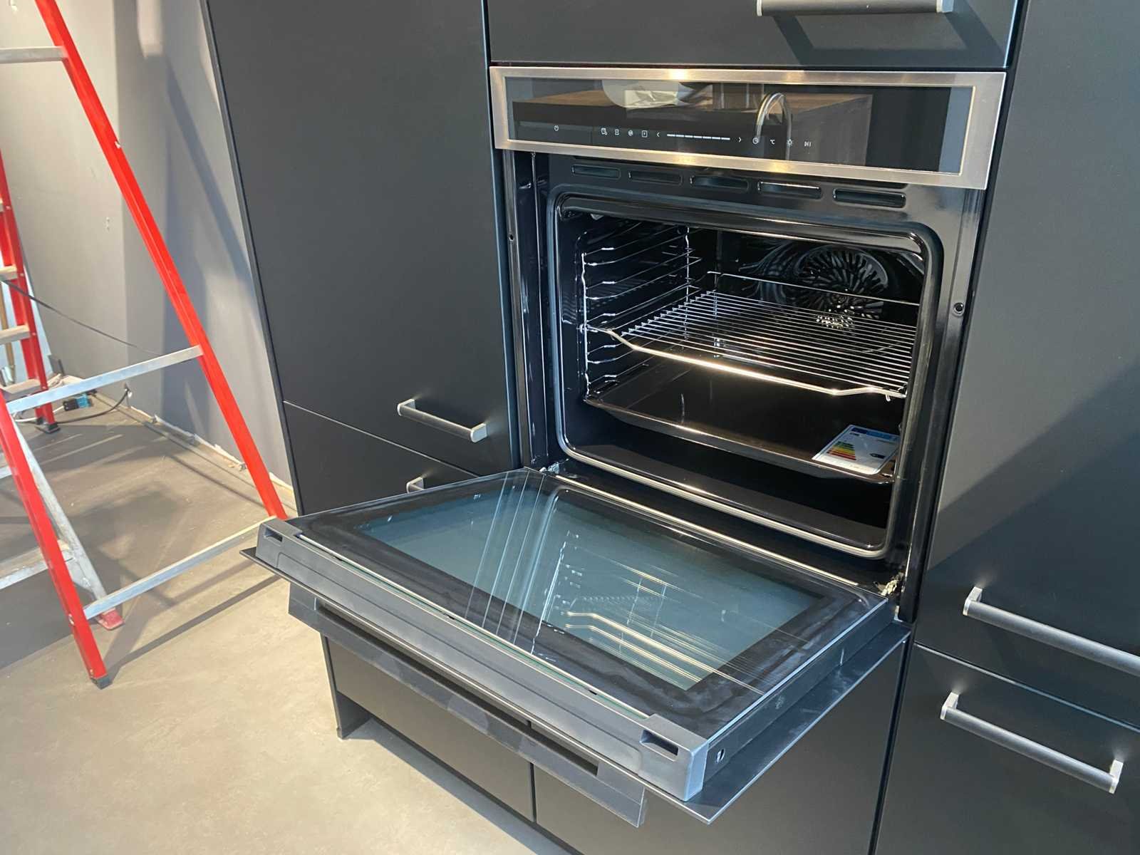 Keuken dient gedemonteerd te worden op locatie; Let op: kijken op afspraak via aanmelden@troostwijkauctions.com. Nee Merk: Nobilia Type keukenopstelling: Eiland Lengte: 215cm Breedte: 60cm Hoogte: 183,2cm Kraan: Lanesto Aanrechtblad: Multiplex Fornuis: Etna KIF577ZT Koelkast: Etna KCS1178 Softclose: true Oven: Etna OM670Ti Afzuigkap: Etna ABE590RVS Vaatwasser: Etna VW647M Lengte kookeiland: 213,2cm Breedte kookeiland: 110cm Hoogte kookeiland: 90cm Kleur: Laklaminaat zwart