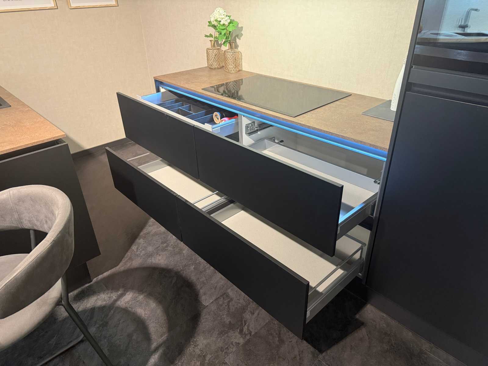 Keuken dient gedemonteerd te worden op locatie Nee Merk: Nobilia Type keukenopstelling: Eiland Lengte: 247cm Breedte: 60cm Hoogte: 94cm Aanrechtblad: Kunststof Fornuis: Electrolux Softclose: true Oven: Electrolux KVLFE46K Afzuigkap: Electrolux Vaatwasser: Pelgrim GVWC270L Lengte kookeiland: 300cm Breedte kookeiland: 105cm Hoogte kookeiland: 103cm Kleur: Zwart