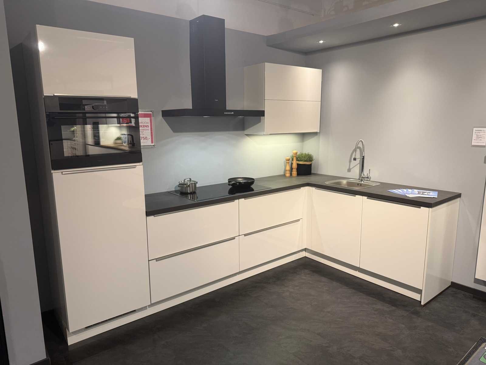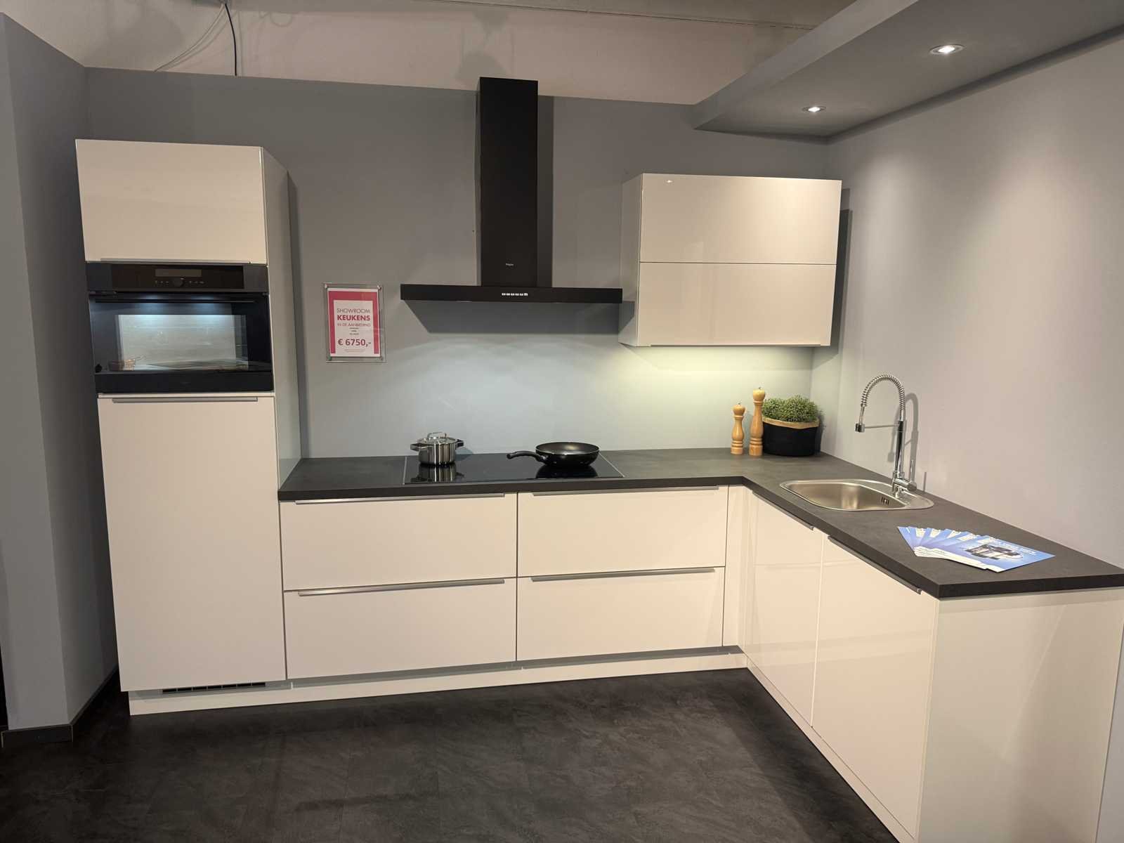 Afmetingen linkerdeel circa 305x60x215 cm; afmetingen rechterdeel circa 187x60x92 cm; keuken dient gedemonteerd te worden op locatie Nee Merk: Nobilia Type keukenopstelling: Hoek Aanrechtblad: Kunststof Fornuis: Pelgrim Koelkast: AEG SKB410F2AS Softclose: true Oven: Pelgrim OVM834MAT Afzuigkap: Pelgrim Vaatwasser: Pelgrim GVW250L Kleur: Glans schelpwit